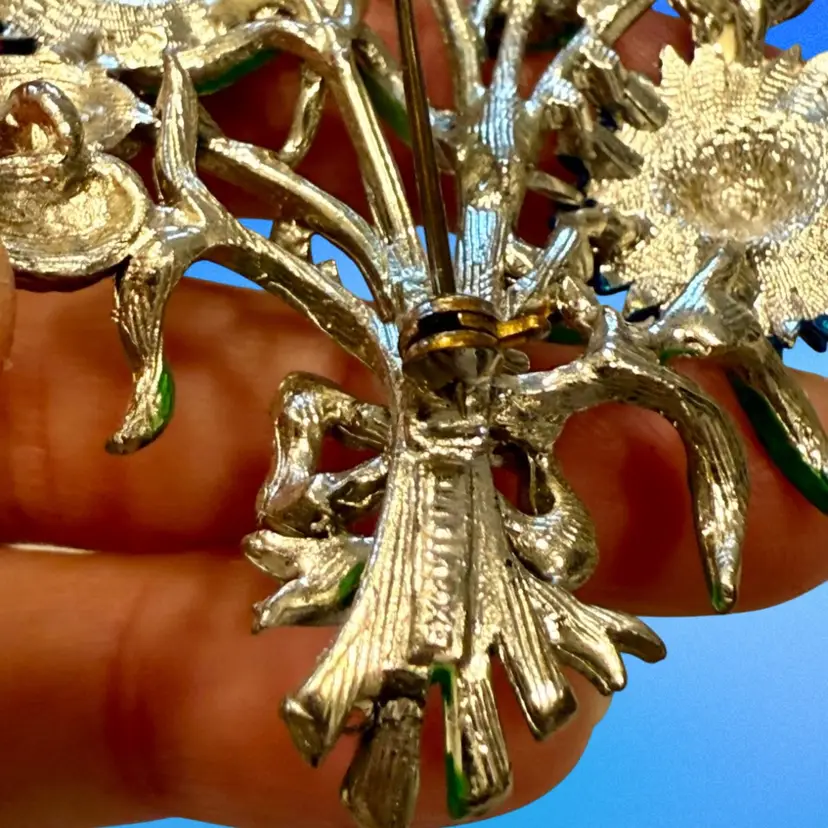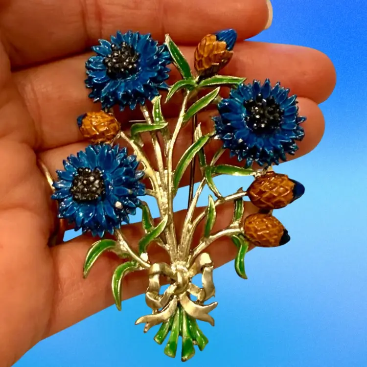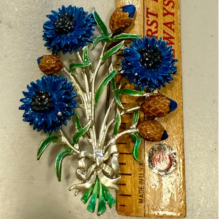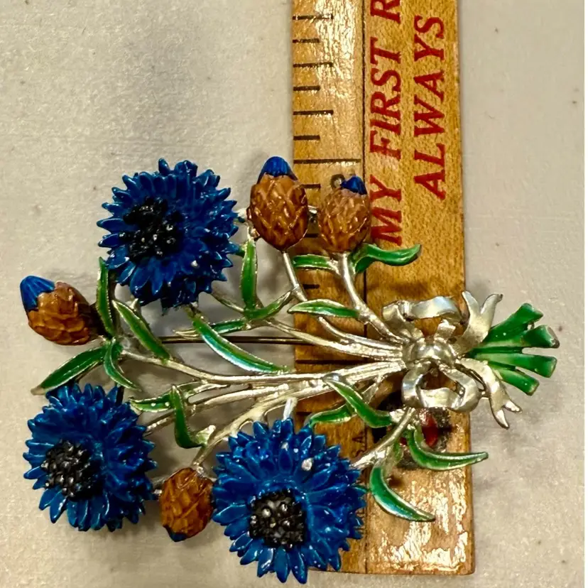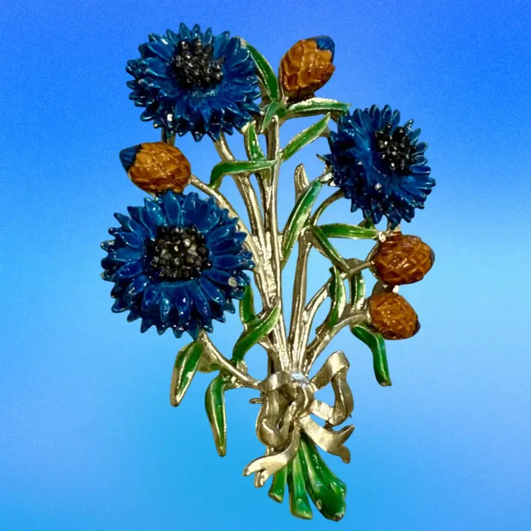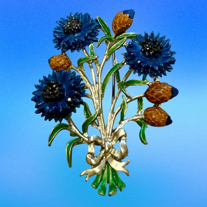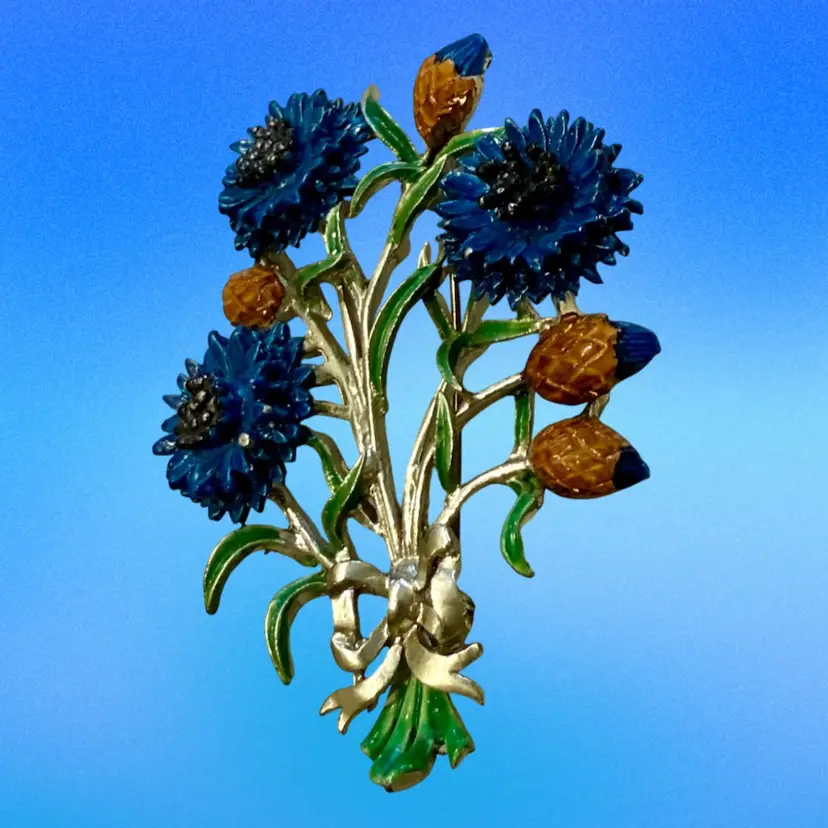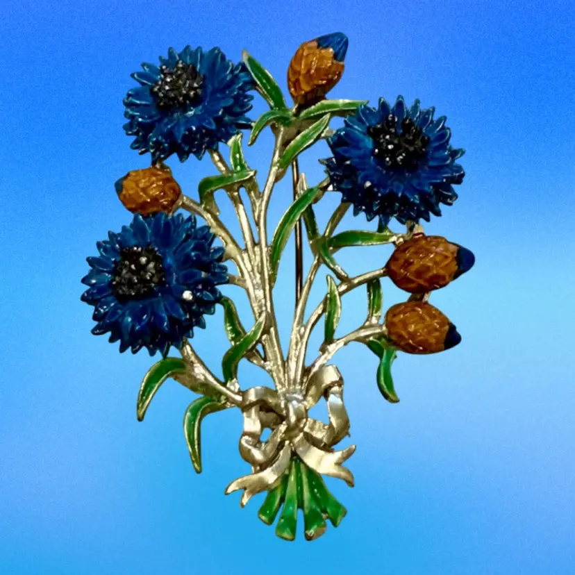 This is a lovely “Exquisite” Cornflower Bouquet Spray Brooch. The Cornflower is the birthday flower spray for September. I have some other birthdays sprays for sale as well. This brooch is in lovely original condition with minimal evidence of wear consistent with gentle use & age.