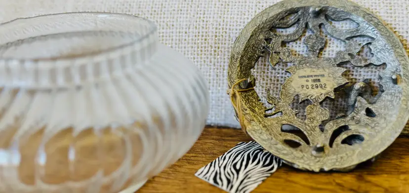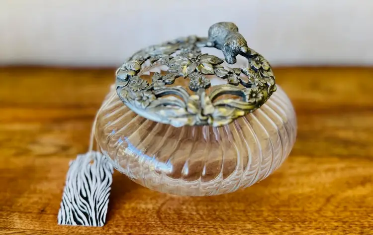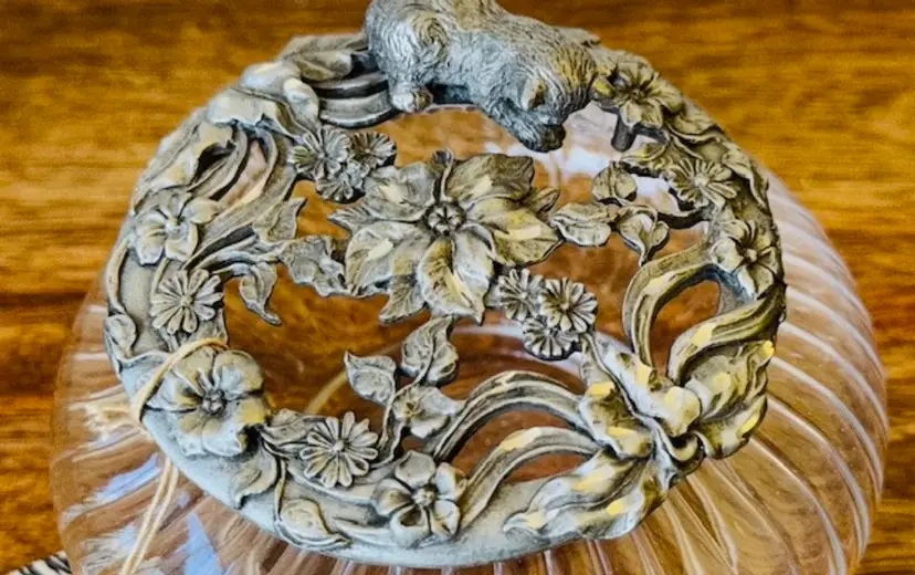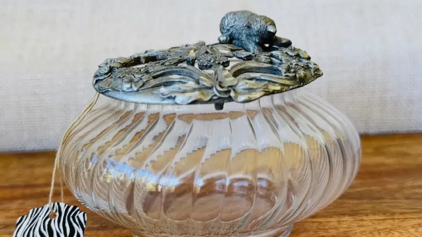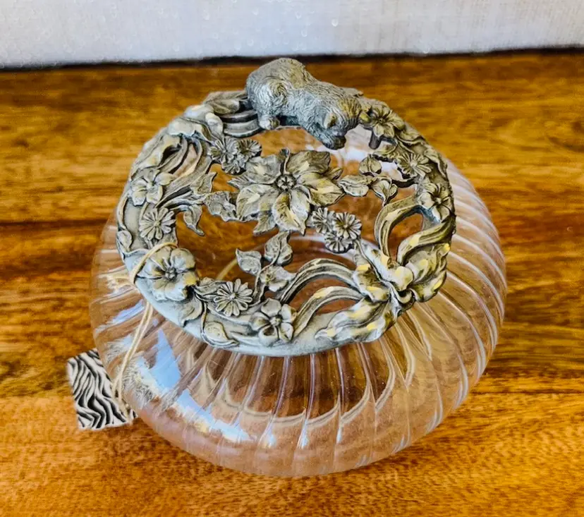 Experience the charm of Rawcliffe Pewter with this delightful glass potpourri jar adorned with an intricate pewter cat lid. Crafted in 1992, this piece combines functional design with whimsical flair, standing 3 inches tall and measuring 4 inches in width. The pewter material adds a touch of heft and durability, while the cat-shaped lid adds a playful twist to your home decor.Suitable for storing your favorite potpourri or as a standalone decorative item, this jar brings a quaint elegance to any room. The jar's glass construction allows for easy cleaning and maintenance, ensuring that this Rawcliffe Pewter piece remains a lasting addition to your collection.