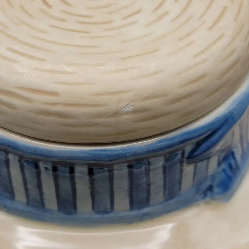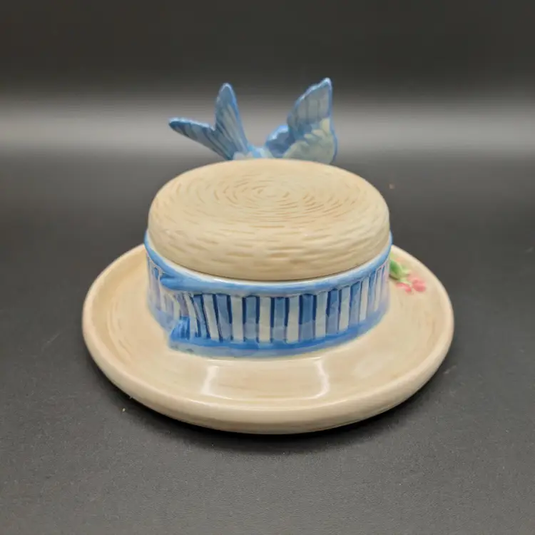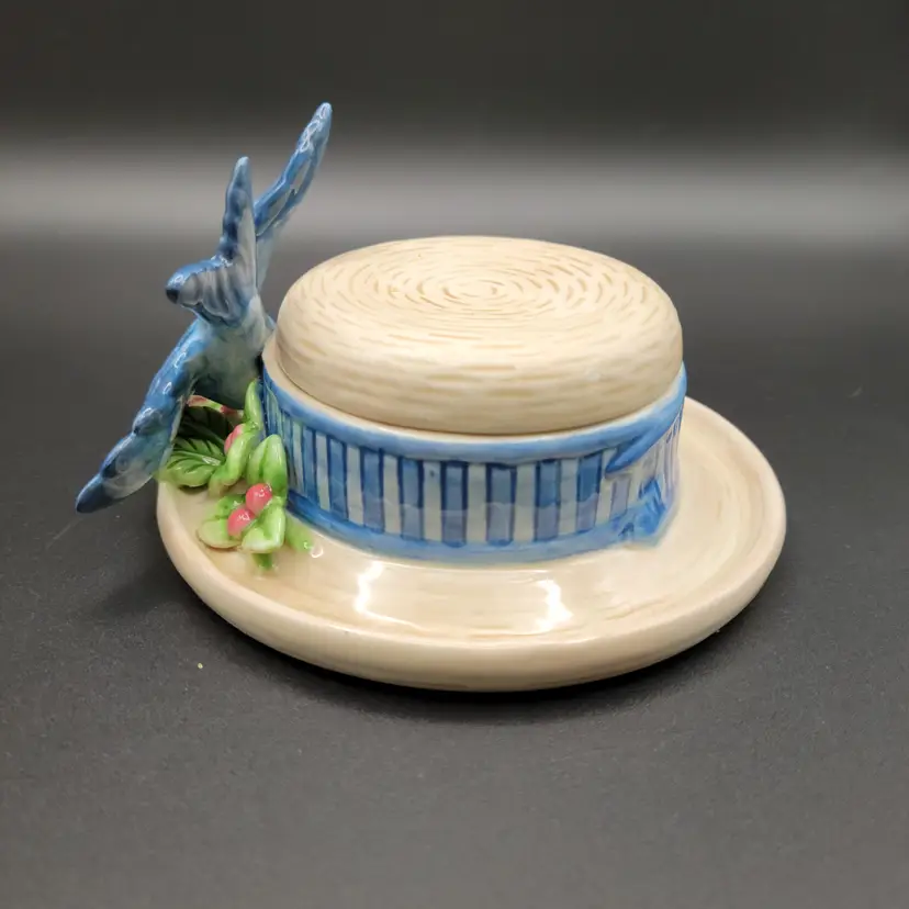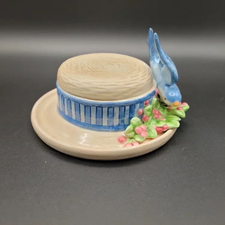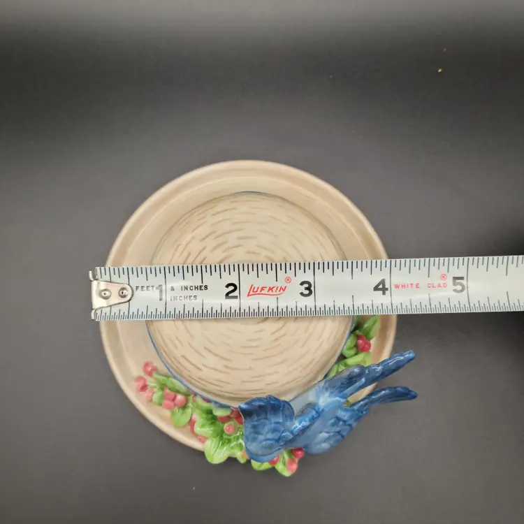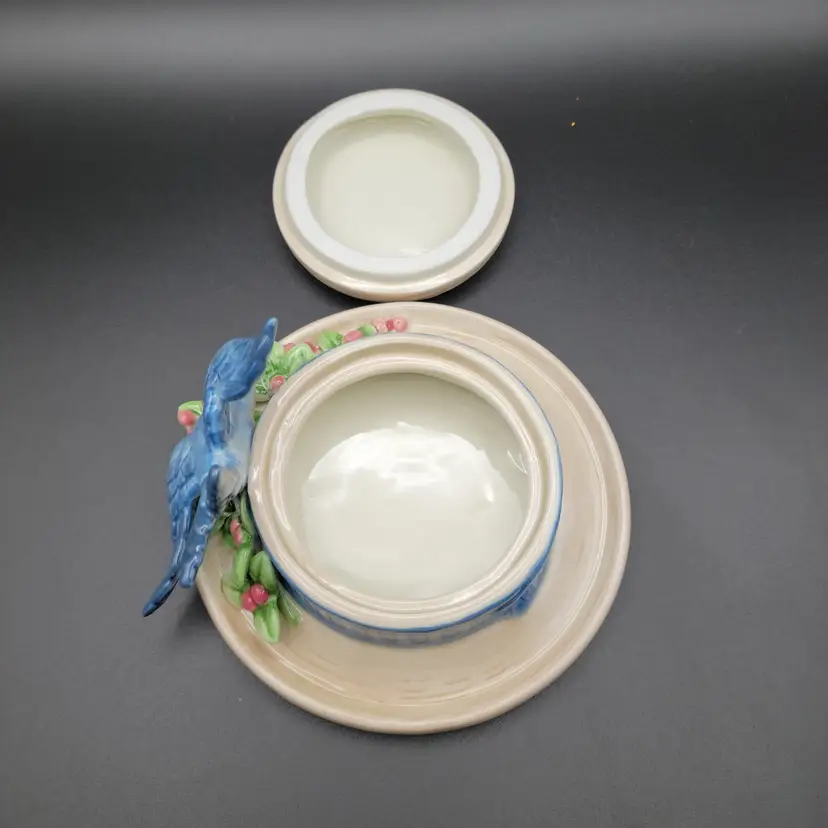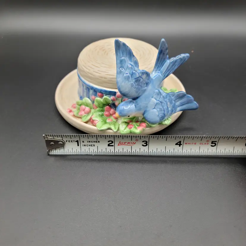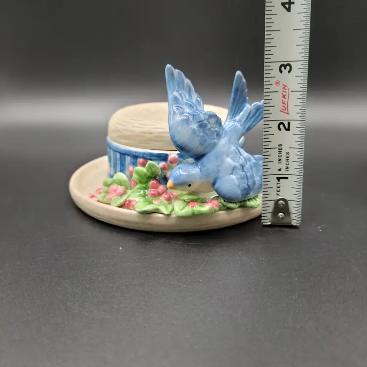 This trinket box features a glossy finish and a colorful flower pattern with a blue bird. Good condition with small chip in lid as shown in pictures. Measures 4.5 inches wide and 3 inches tall Thank you for looking and have a great day!