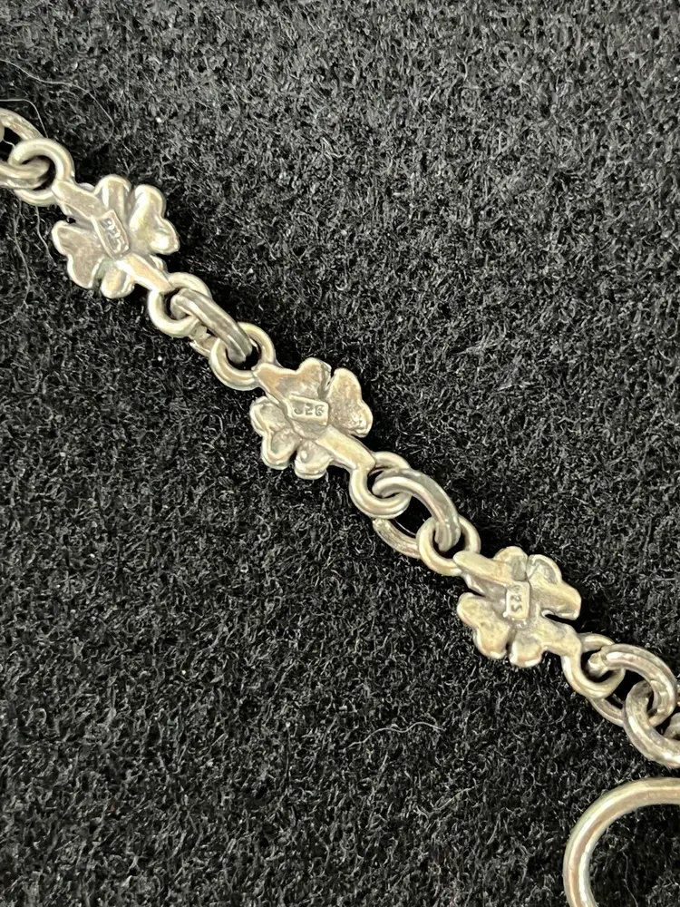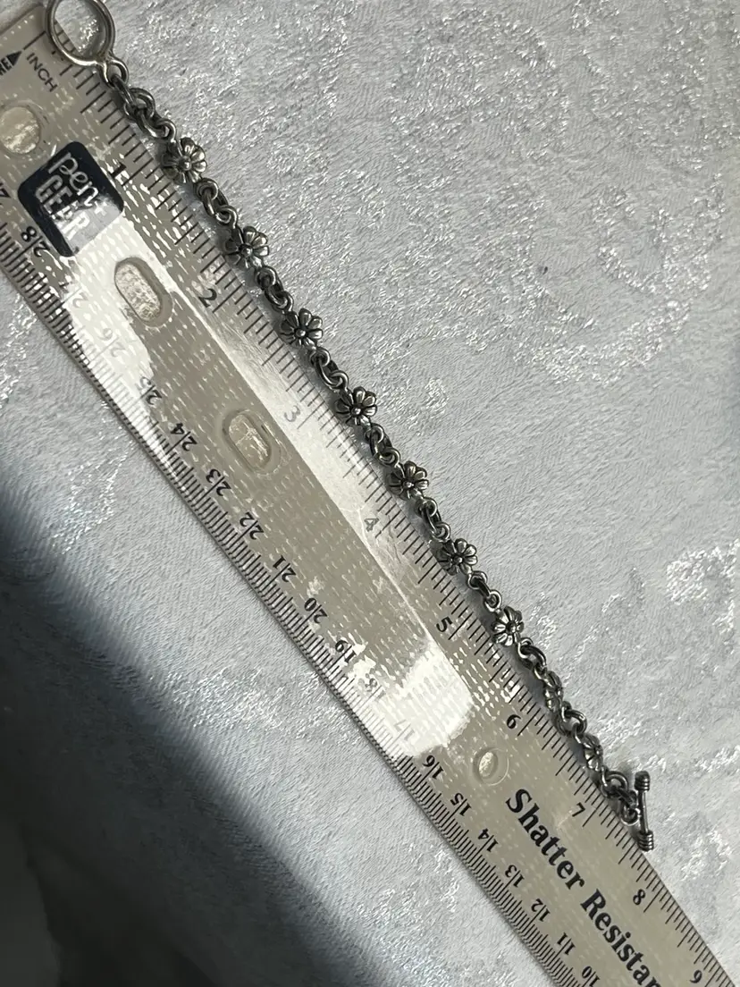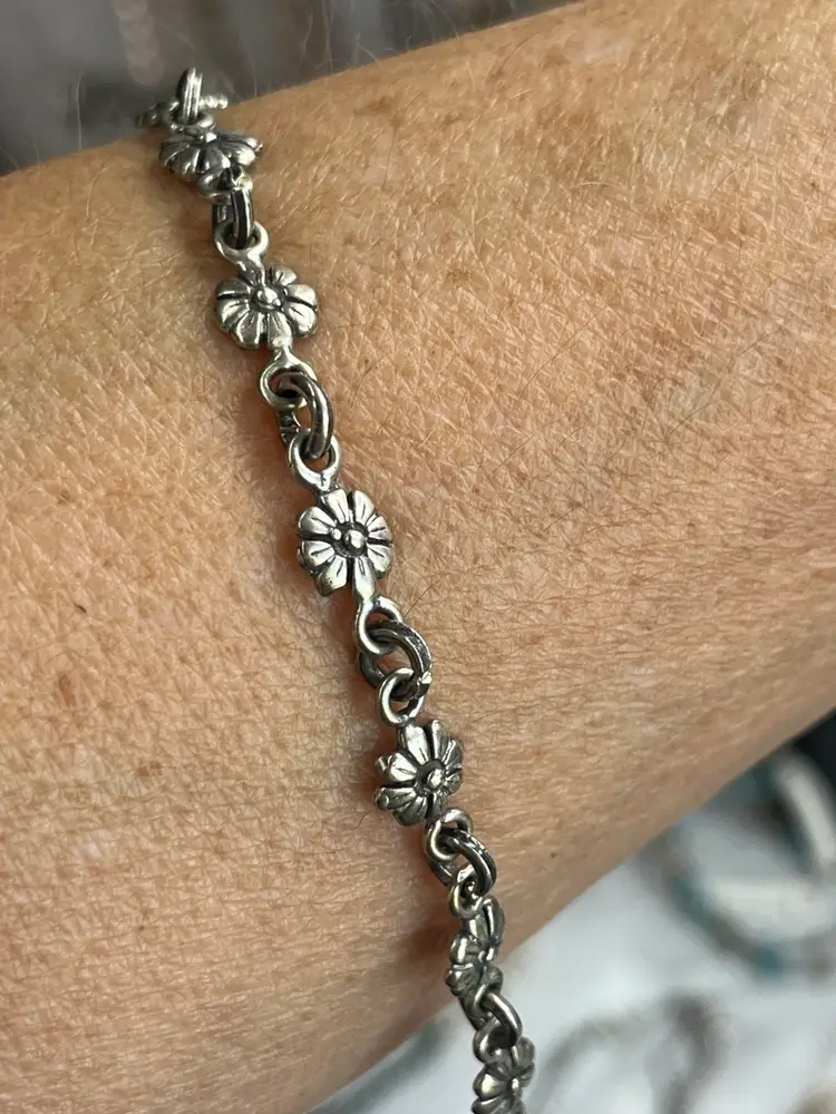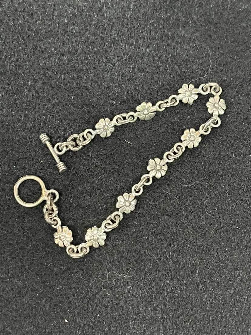 Charming vintage bracelet featuring delicate floral links. Marked 925. Perfect for adding a touch of elegance to any outfit. Could use some polishing - nice patina! Toggle Clasp.