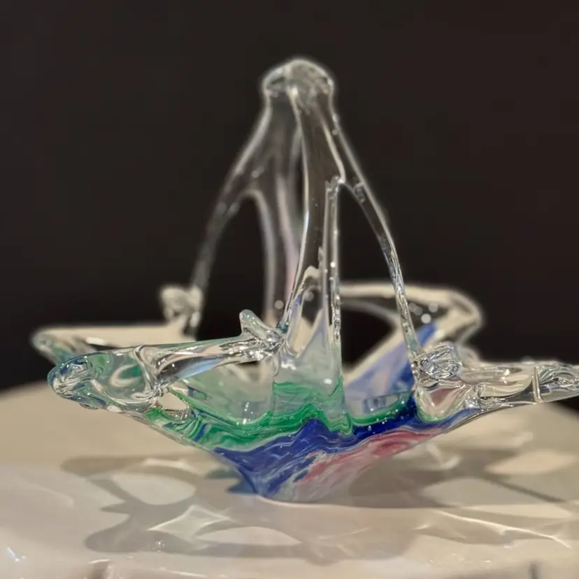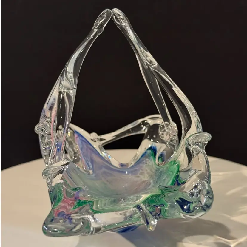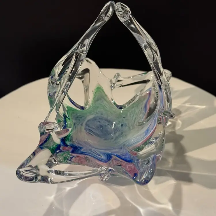 Beautiful art glass basket. No chips or cracks. Amazing colors and freeform style. Measures about 5” tall and about 7” across. Would make a beautiful trinket dish or decor.