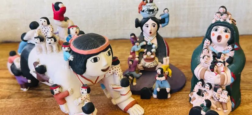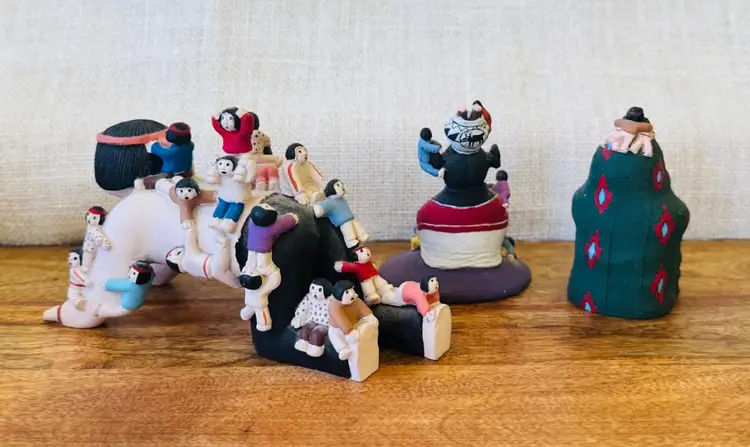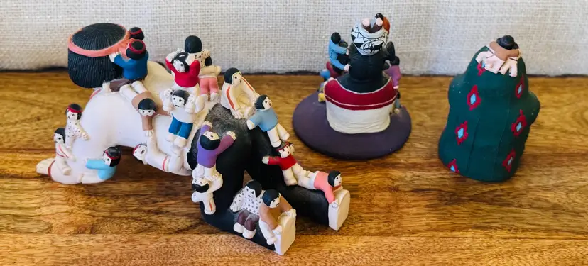 This set of three vintage Native American pottery storyteller figurines is a must-have for any collector of cultural art. Handmade and sourced from the United States, these figurines showcase the rich history and storytelling traditions of the Native American culture. Each piece is unique and adds to the overall charm of the set. These figurines are not modified in any way and are a true representation of the culture they depict. Add them to your collection today and enjoy a piece of American history.