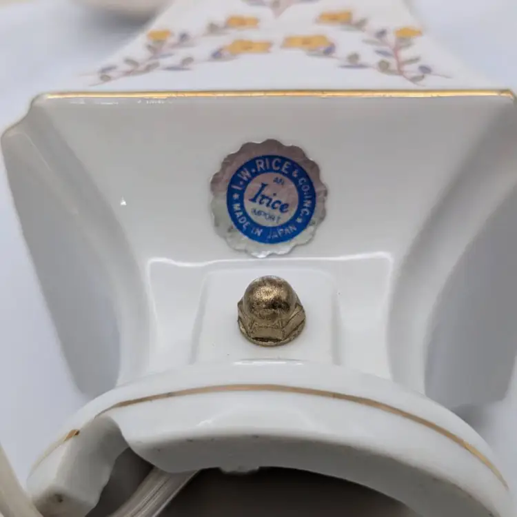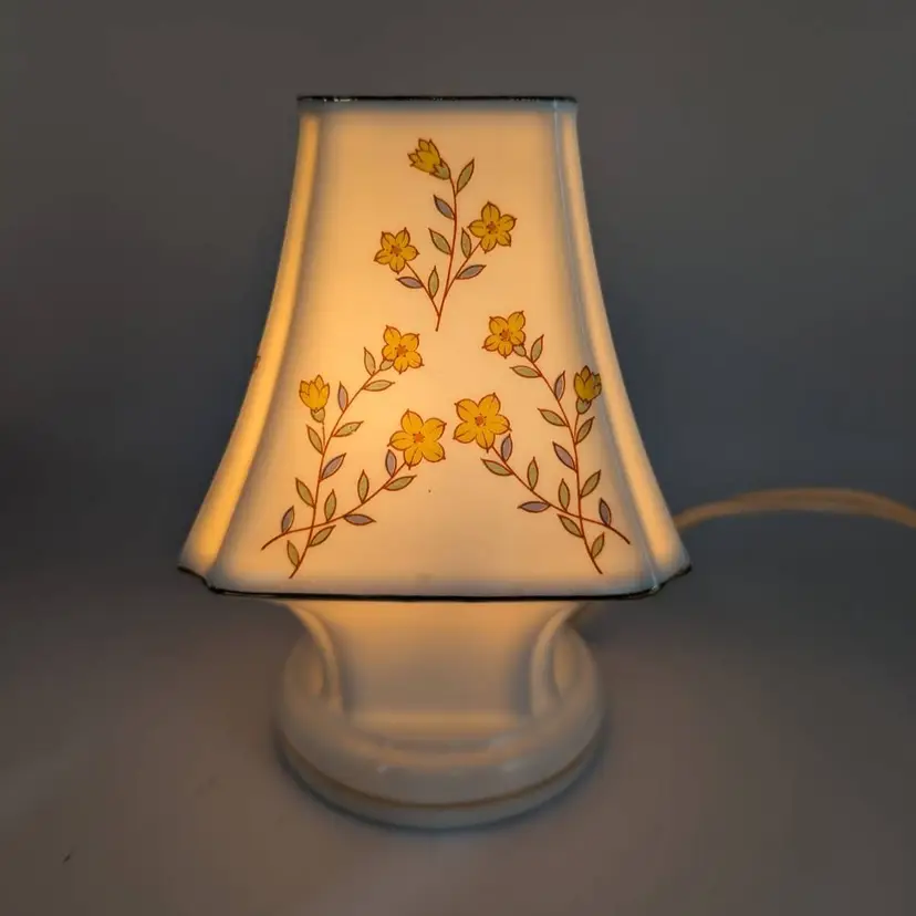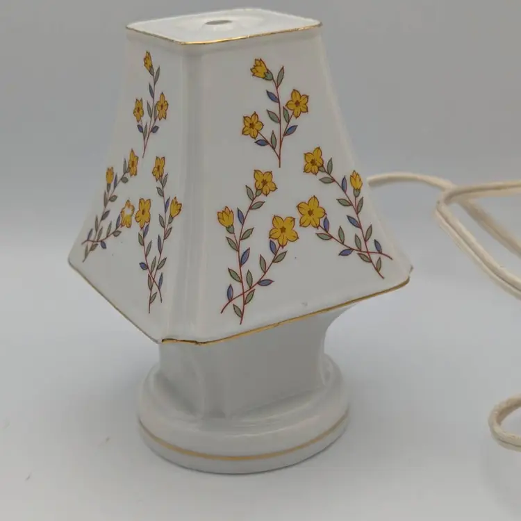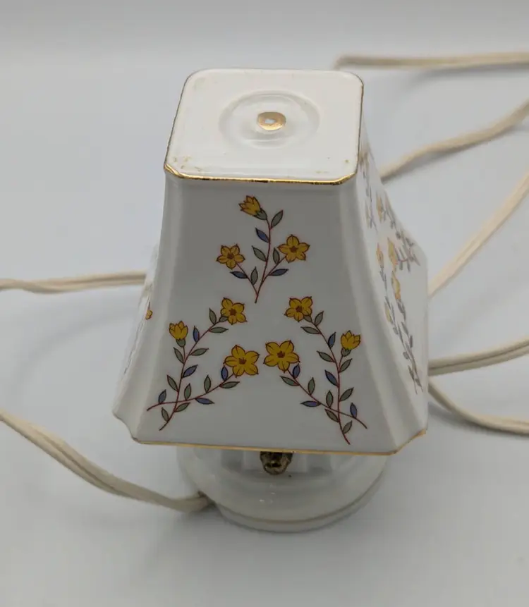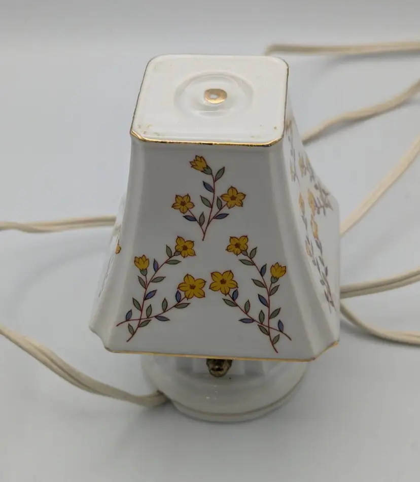 This is a really sweet porcelain Nightlight. Delicate little yellow flowers adorn it. The top of lamp can be used as a perfume diffuser- the instructions I read were: "Place a few drops of your favorite perfume or cologne in lamp well. The heat from the bulb will cause evaporation and the surrounding areas will remain pleasantly scented"