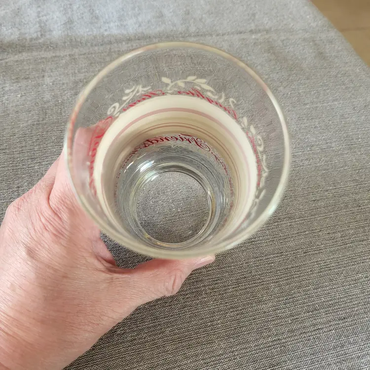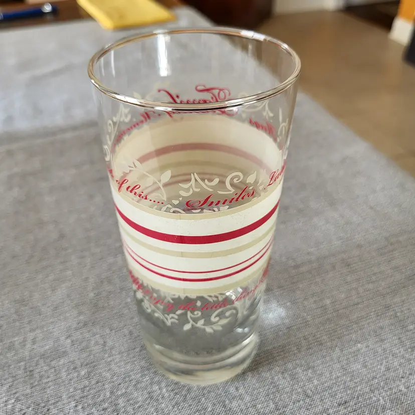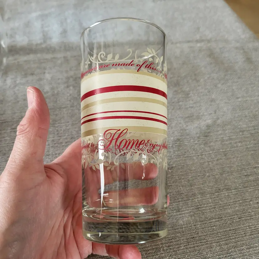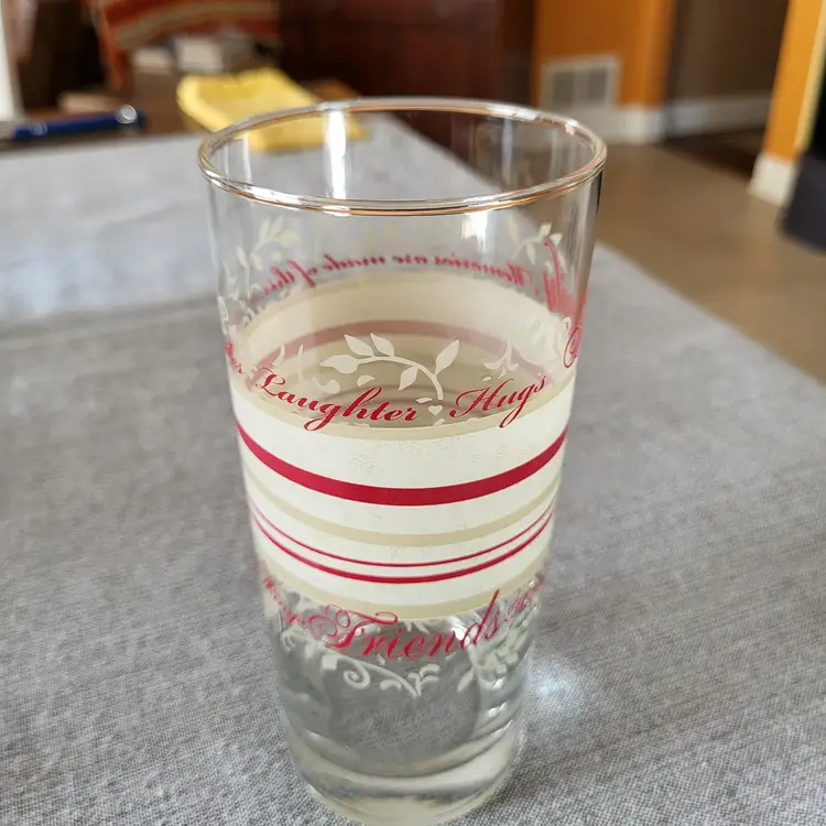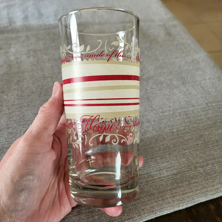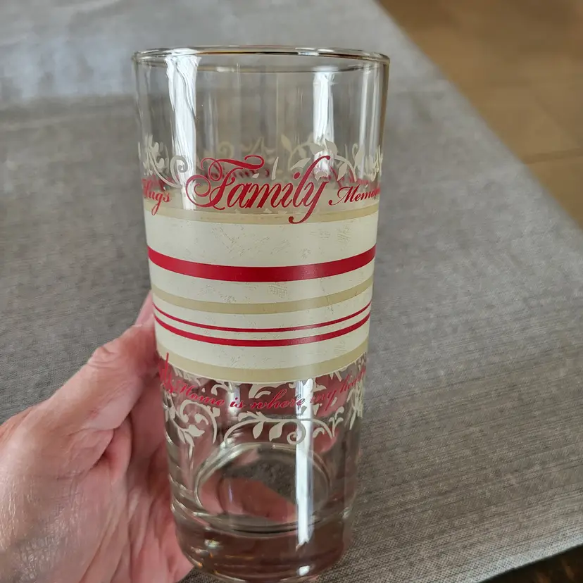 Vintage Libbey tumbler glass from the "Family and Friends" collection, which features various heartwarming phrases in a red and cream striped design.