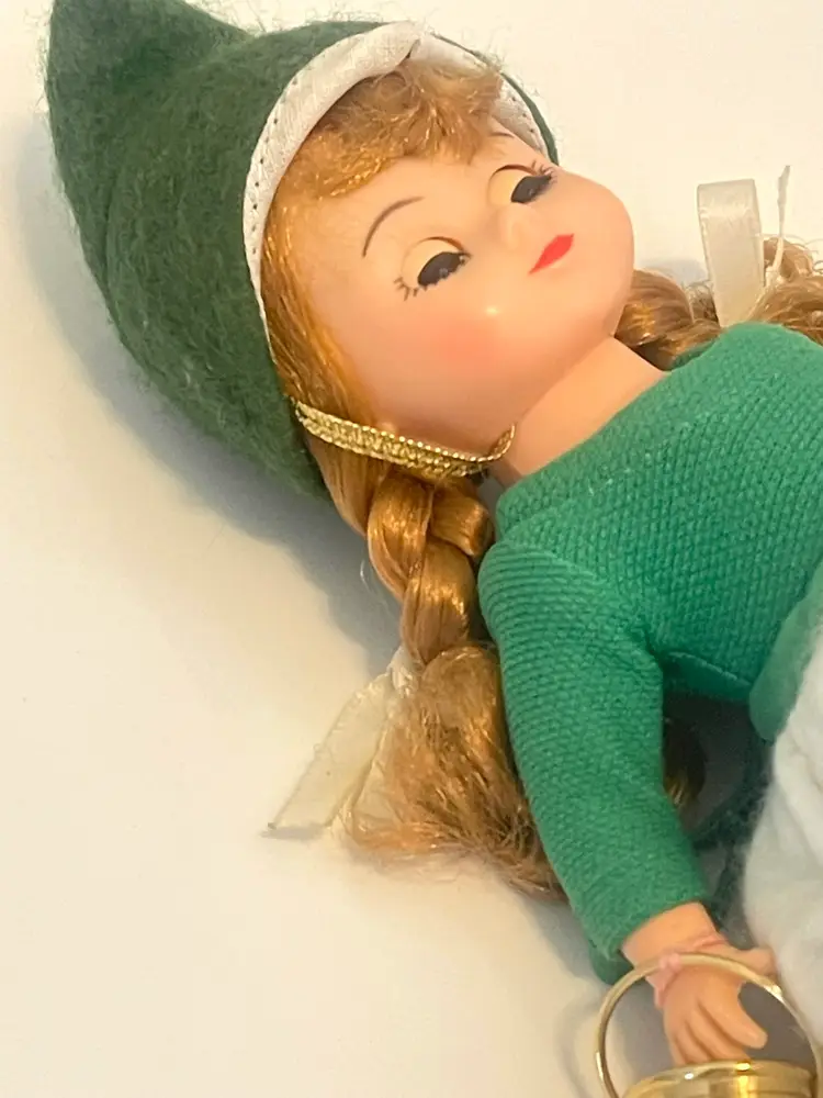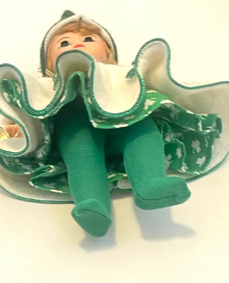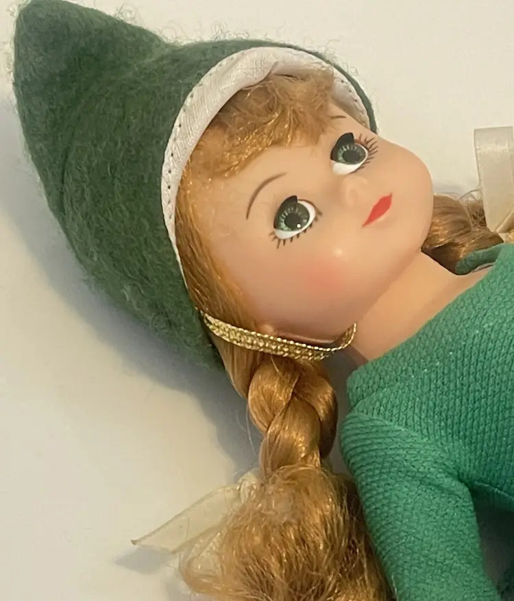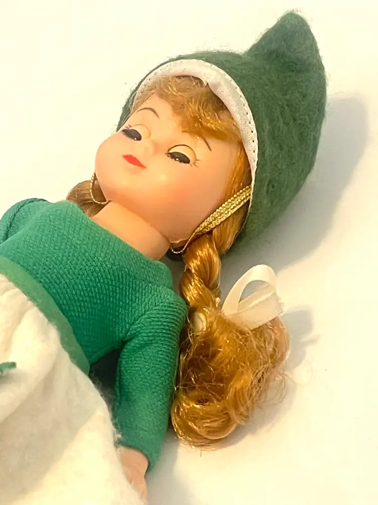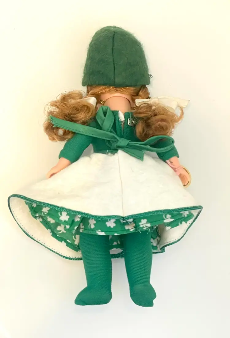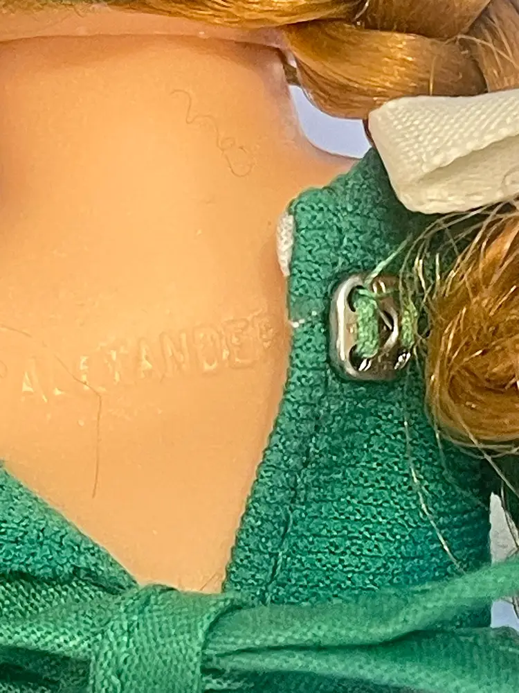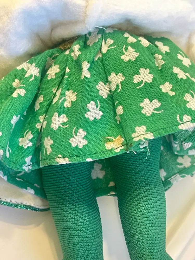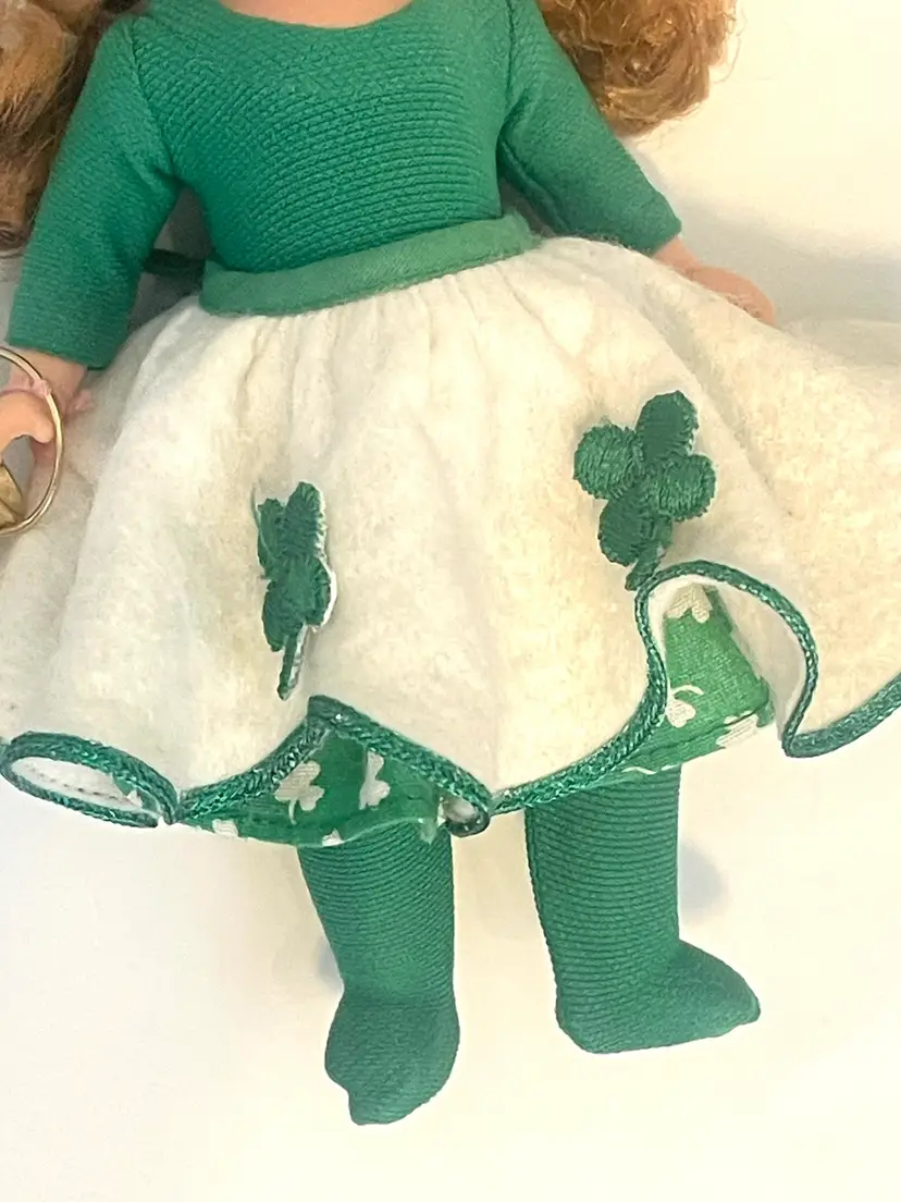 This lovely girl is in very good condition, her face is gorgeous! Eyes open and close, limbs and head articulate. One tiny spot on the shamrock under-layer. See the photos as they are part of the description.