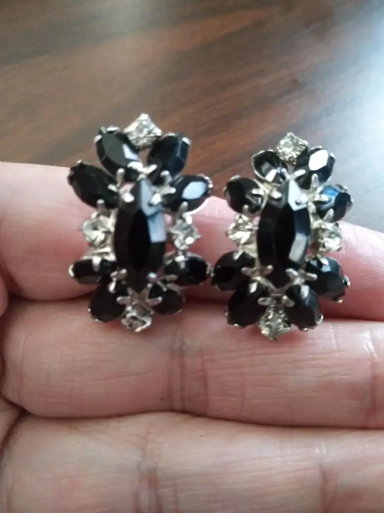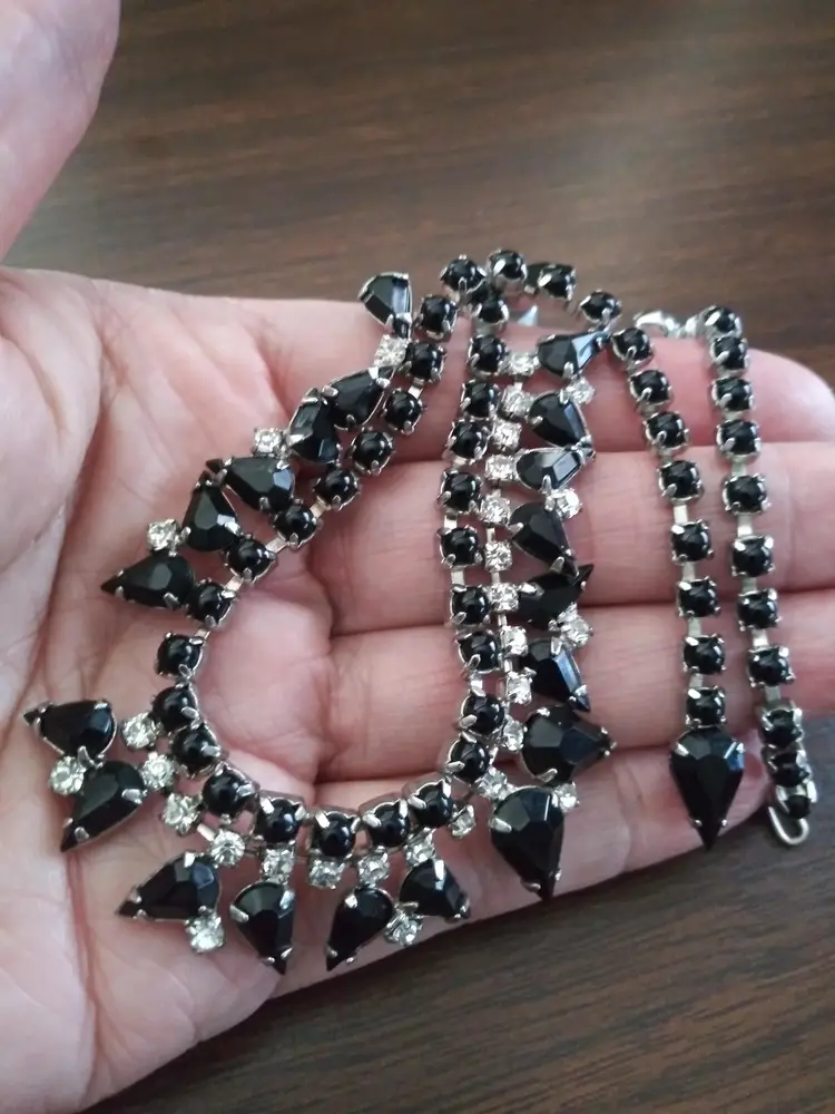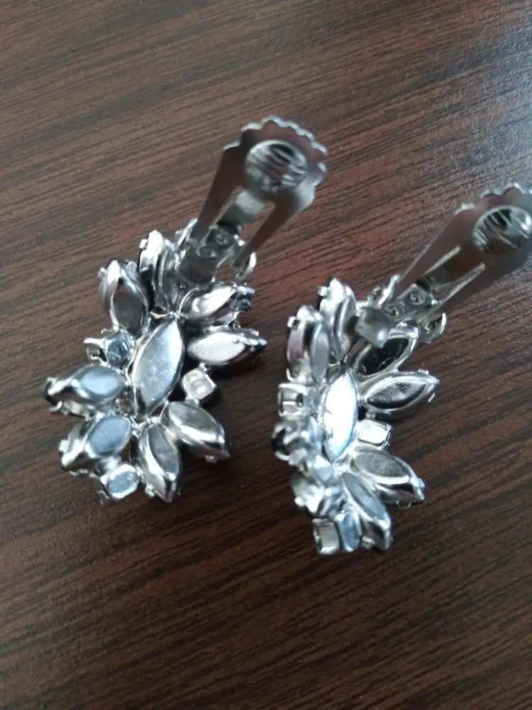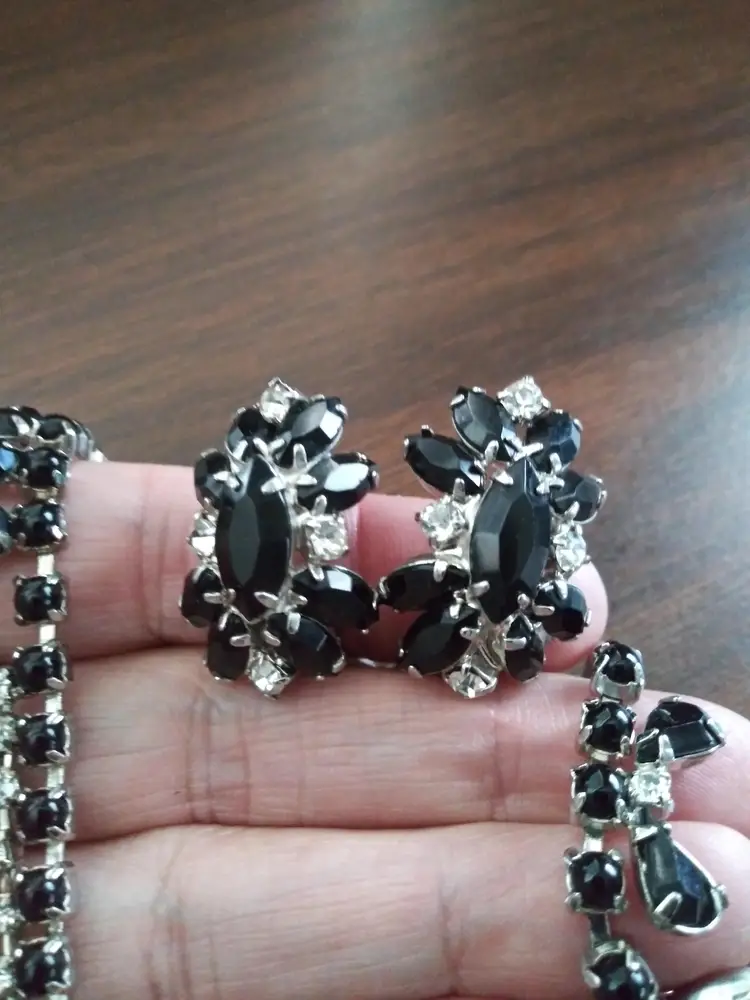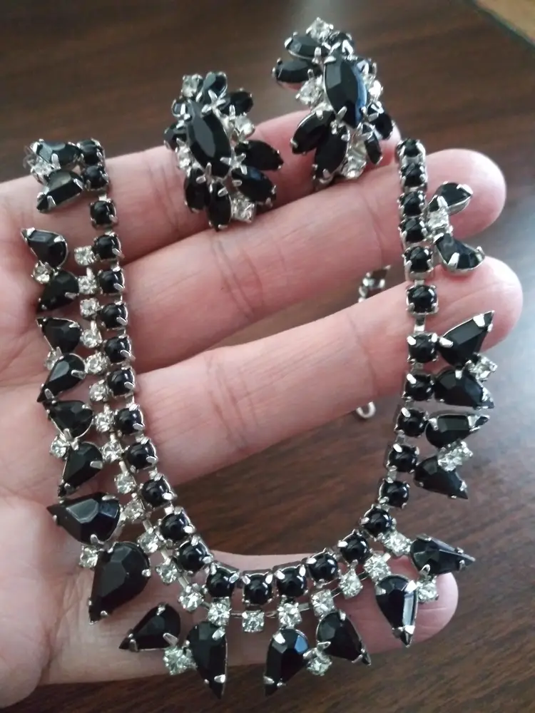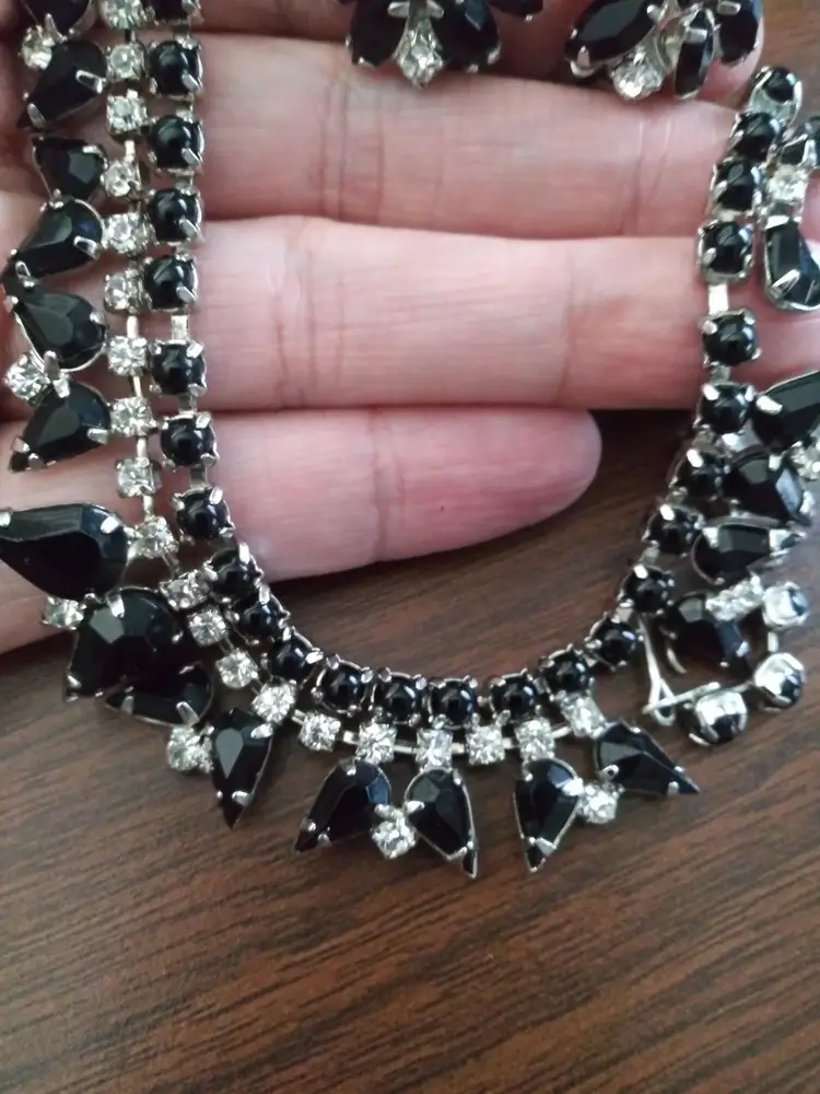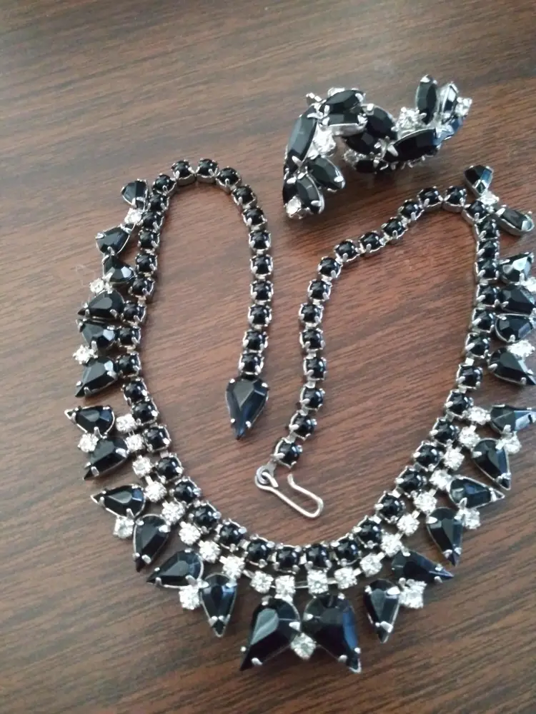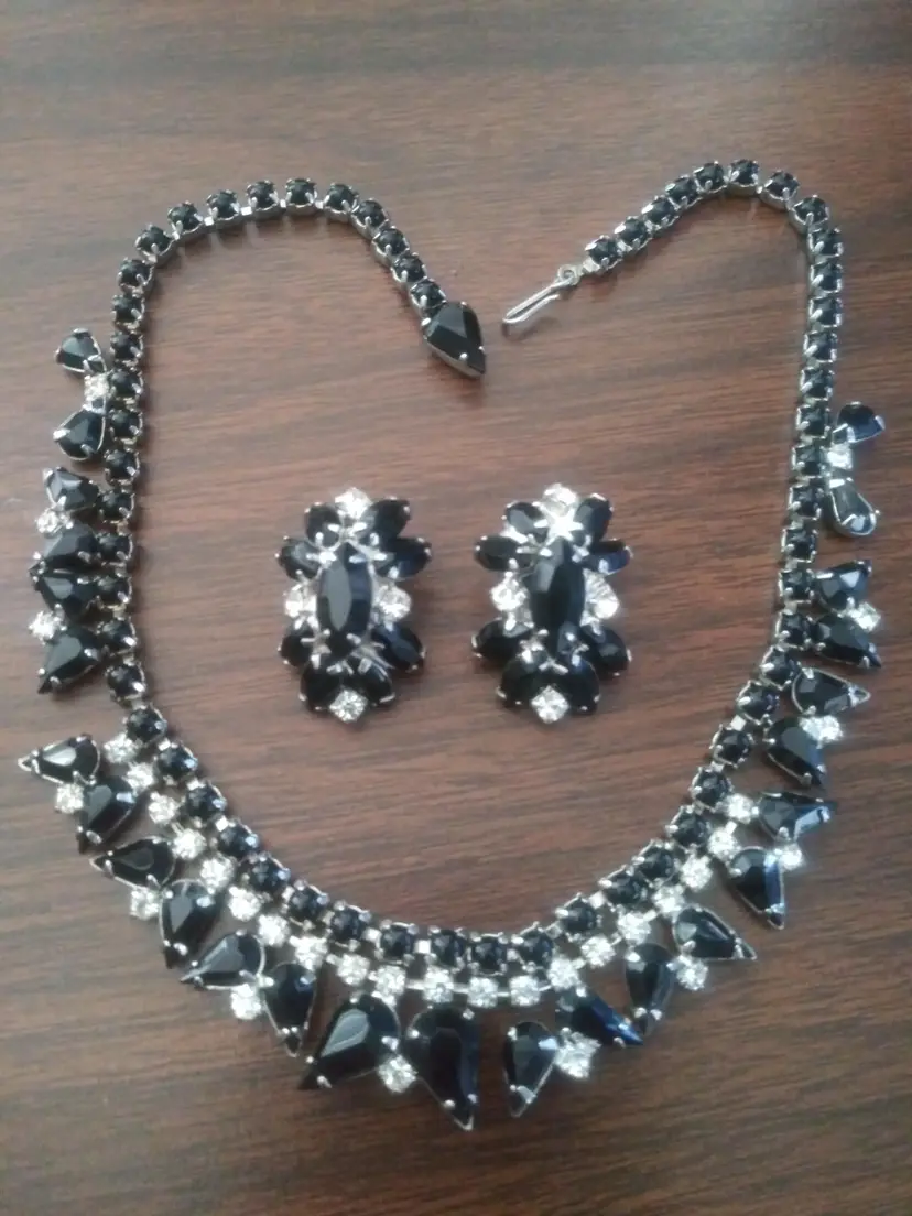 Excellent condition. Unsigned. This is a stunning set, Weiss or Kramer Style. Rhodium plated. Necklace 15" long. Clip earrings 1"