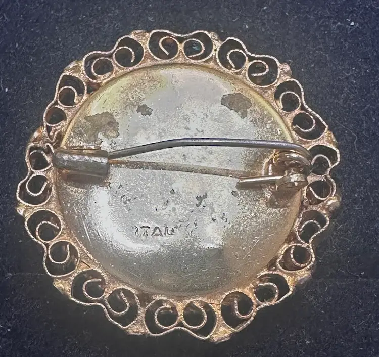 Vintage Glass Micro Mosaic Brooch Please inspect pictures or request more photos, if needed - Upon my inspection of these under magnification, all tiles appear to be present, but missing glass tiles is possible. Size of quarter with gold rim
