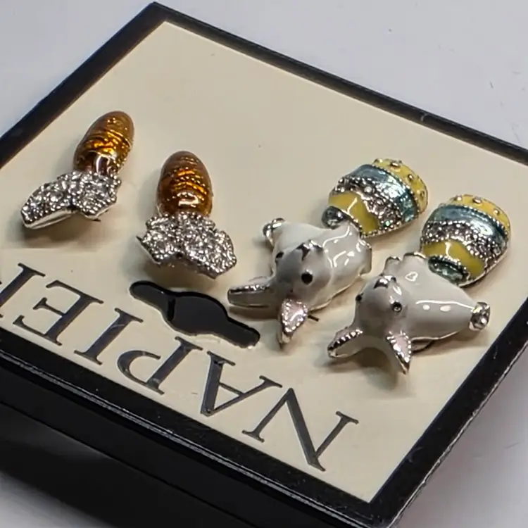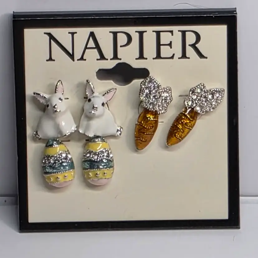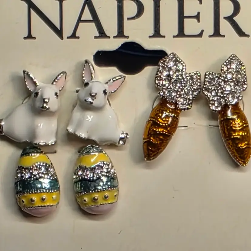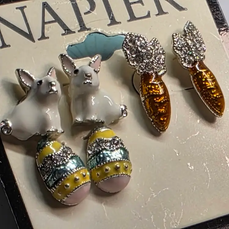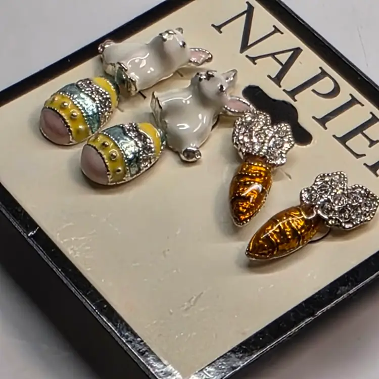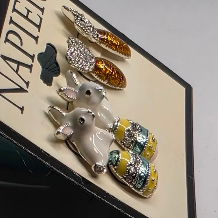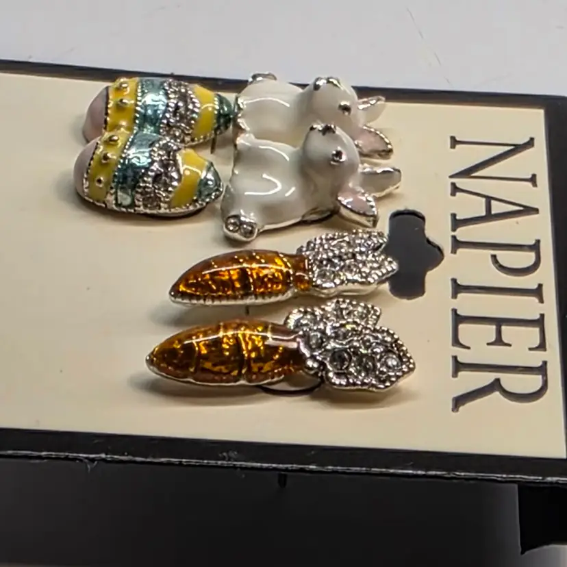 Adorable vintage Napier earrings featuring cute bunny, decorated eggs, and carrot designs. Perfect for adding a playful touch to your springtime outfits or as a charming gift for Easter enthusiasts.