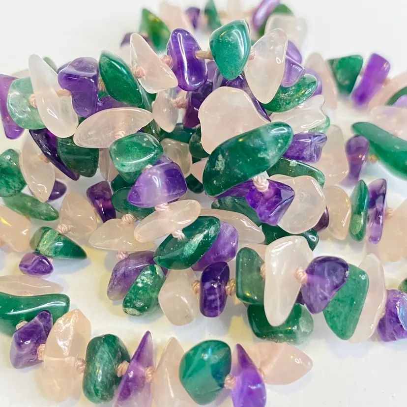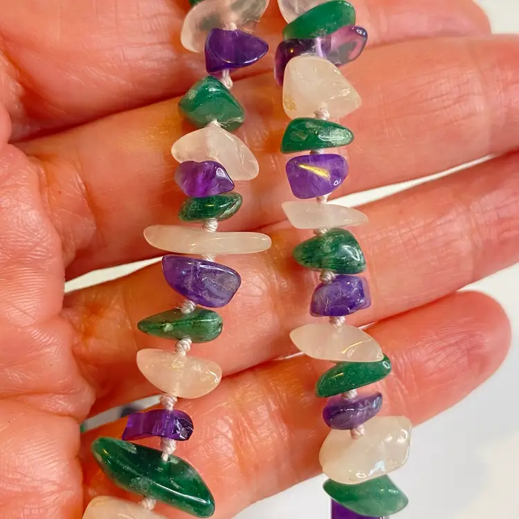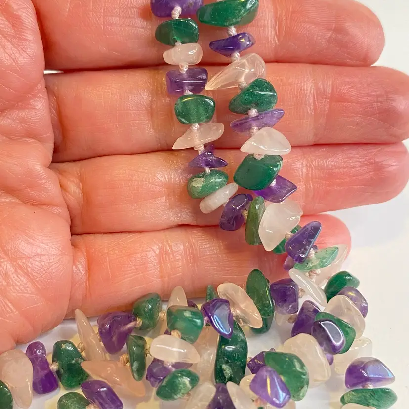 This exquisite vintage necklace brings a touch of natural elegance to any outfit. Handcrafted with care, the piece features a harmonious blend of amethyst, rose quartz, and aventurine stones, creating a stunning array of purple, pink and green hues. The gemstones are expertly cut into chips then hand knotted and strung together, resulting in a versatile accessory that complements a variety of themes, from bohemian to retro. The necklace measures 26 inches in length, allowing it to sit gracefully at the collarbone and elevate both casual and formal ensembles. Its artisanal charm is a testament to the thoughtful craftsmanship that went into its creation, making it a unique addition to any jewelry collection. Embrace the beauty of this hand-knotted treasure and let it serve as a statement piece that reflects both artistry and love.