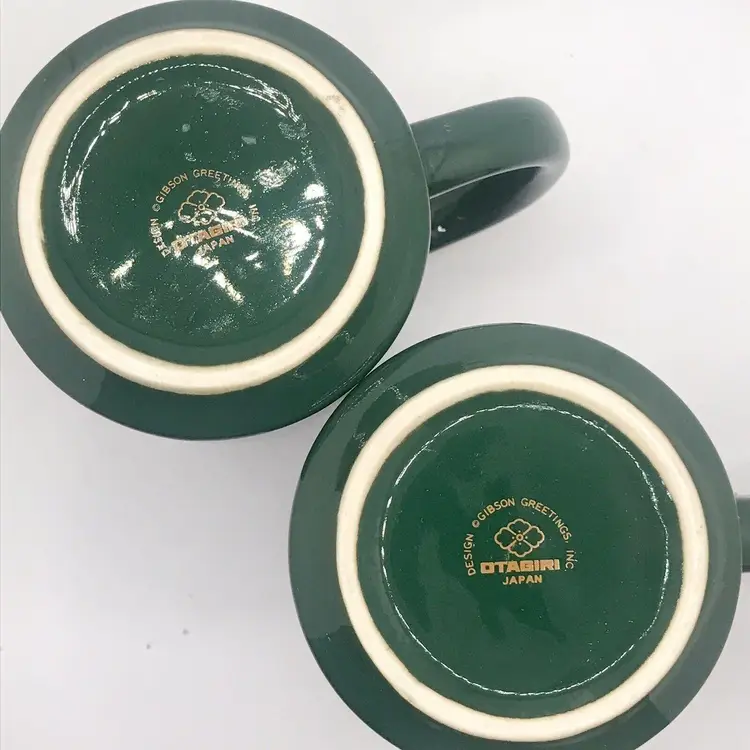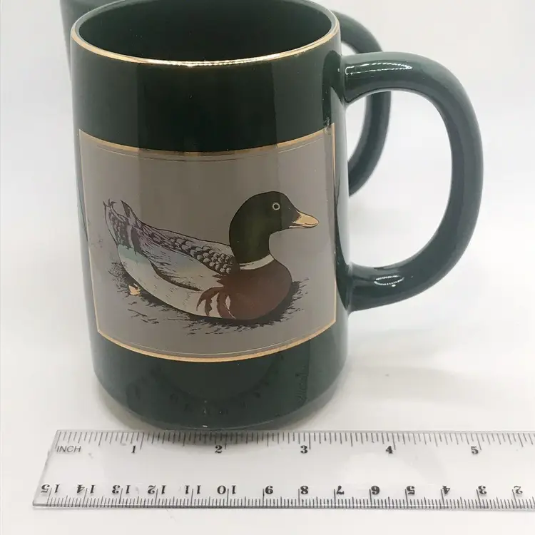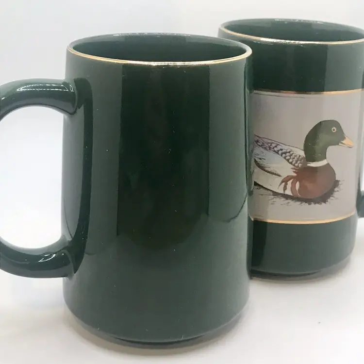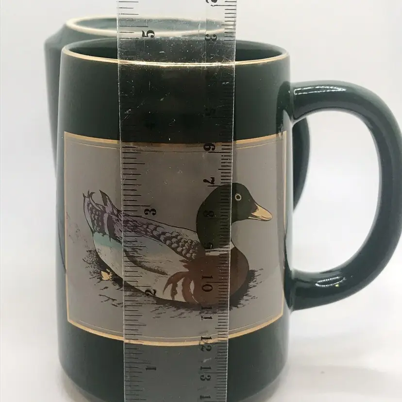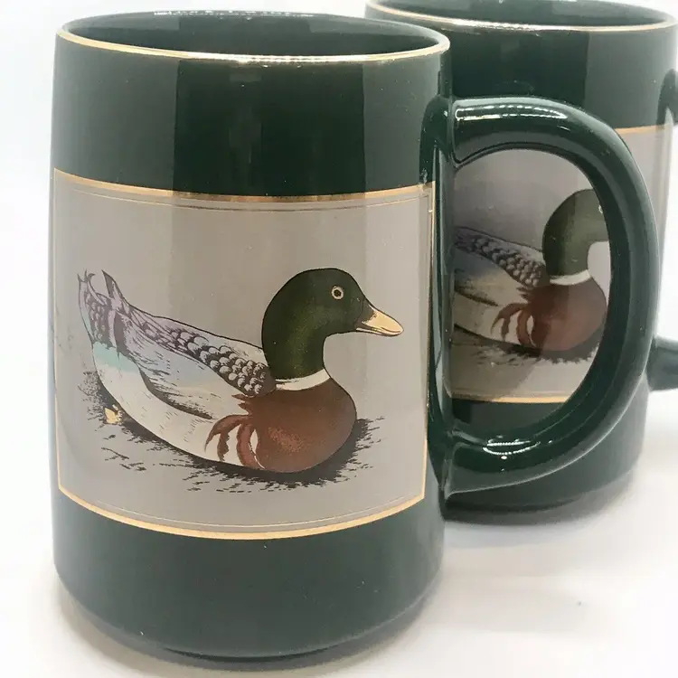 This Vintage Otagiri Coffee Cup Mug Set features two mugs, each with charming Mallard Duck design in green with gold trim. Made in Japan Great condition Measuring 5 in height and width It's got a bird on it!