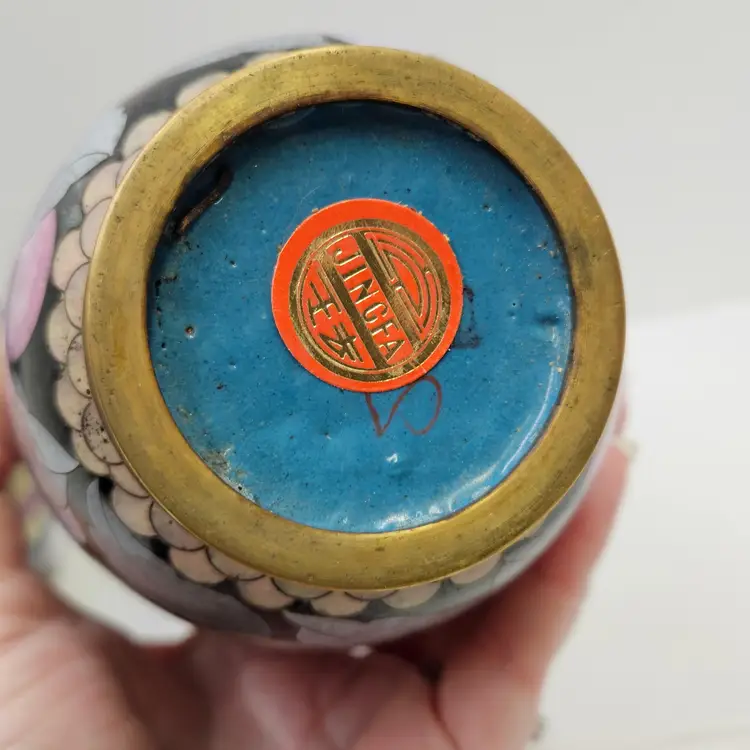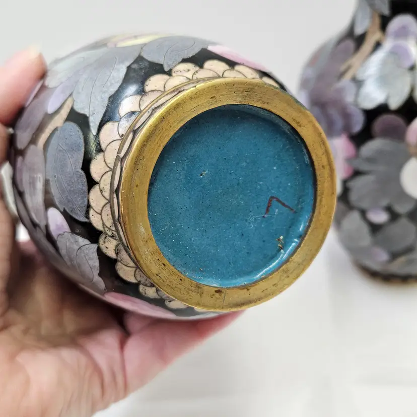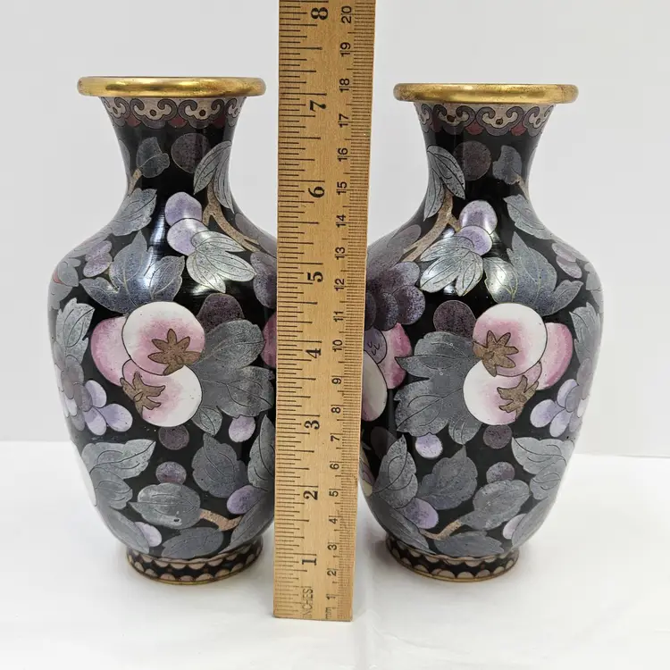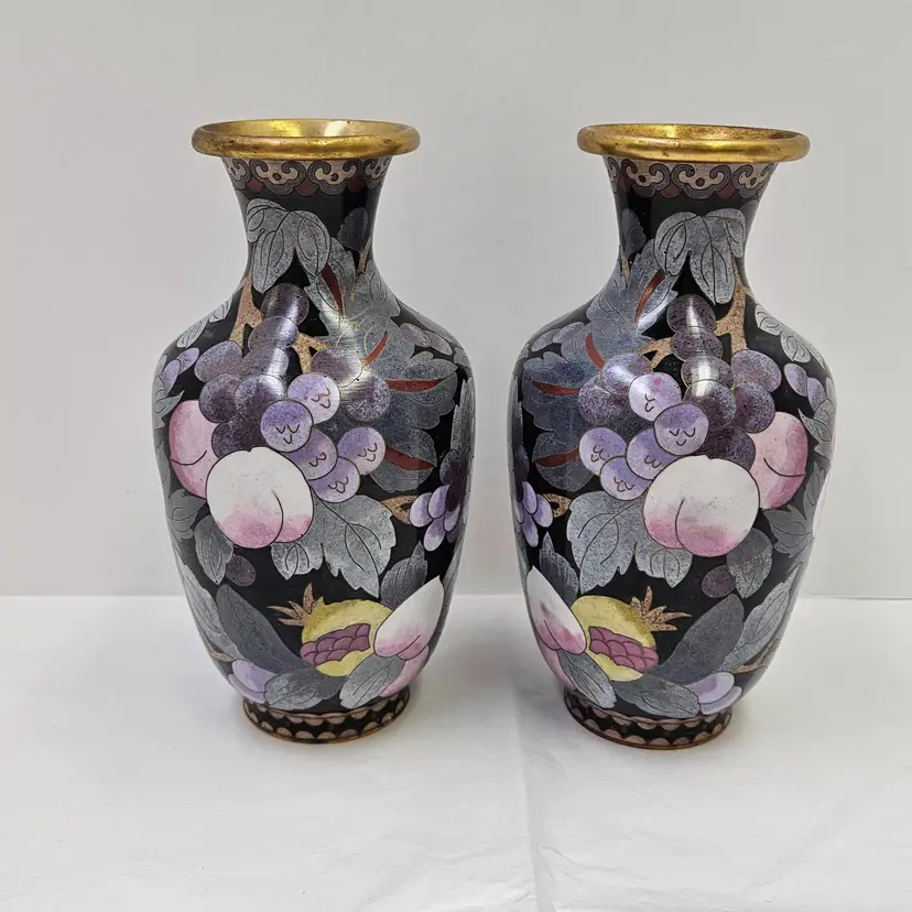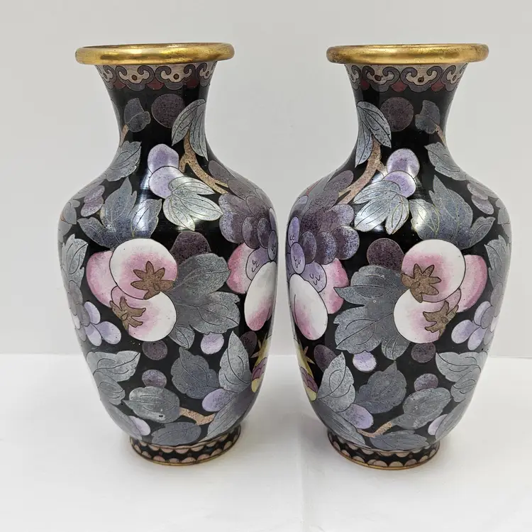 Vintage Chinese Cloisonne Matching Mantle Vases, mirrored pair, minor tarnishing, may have dust inside, as shown on screen