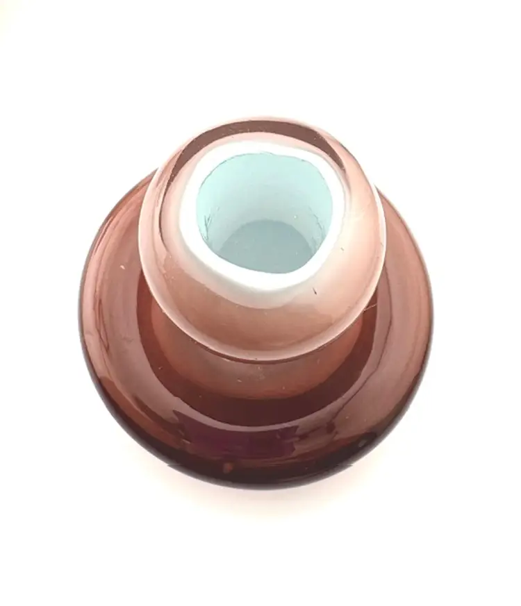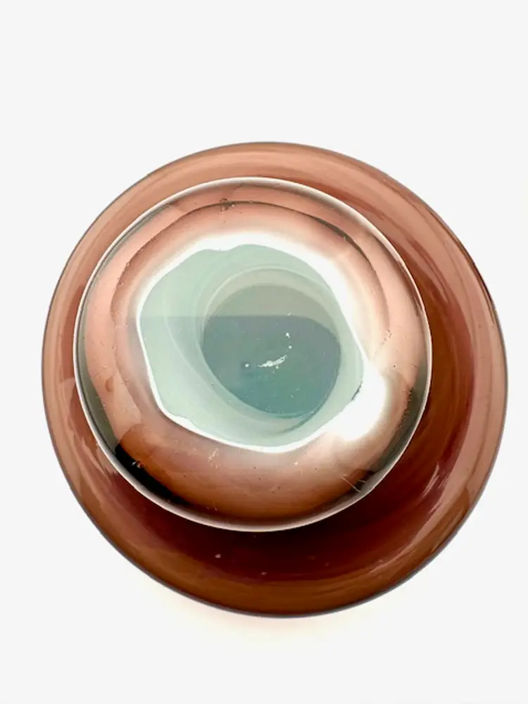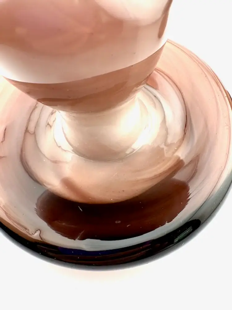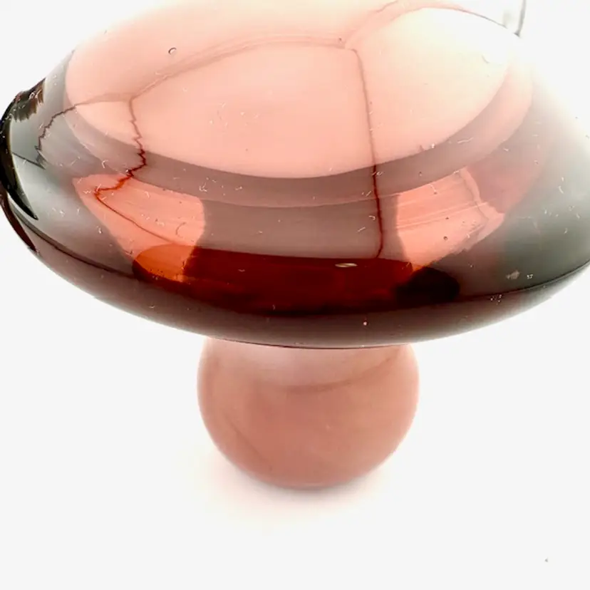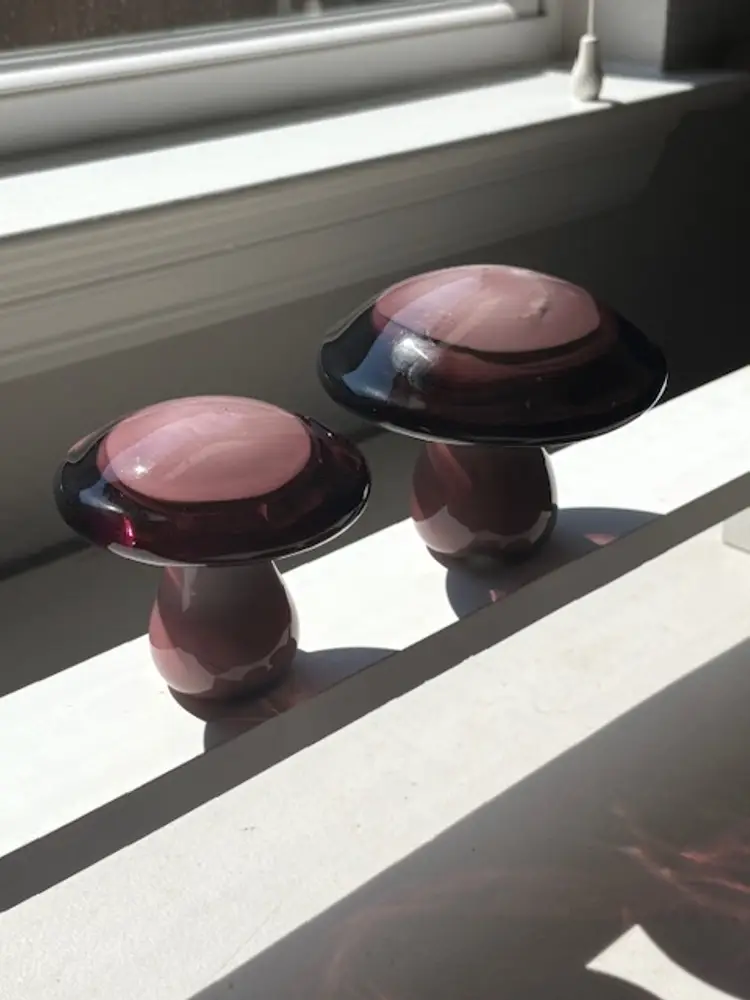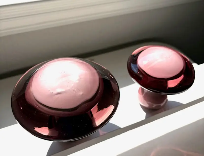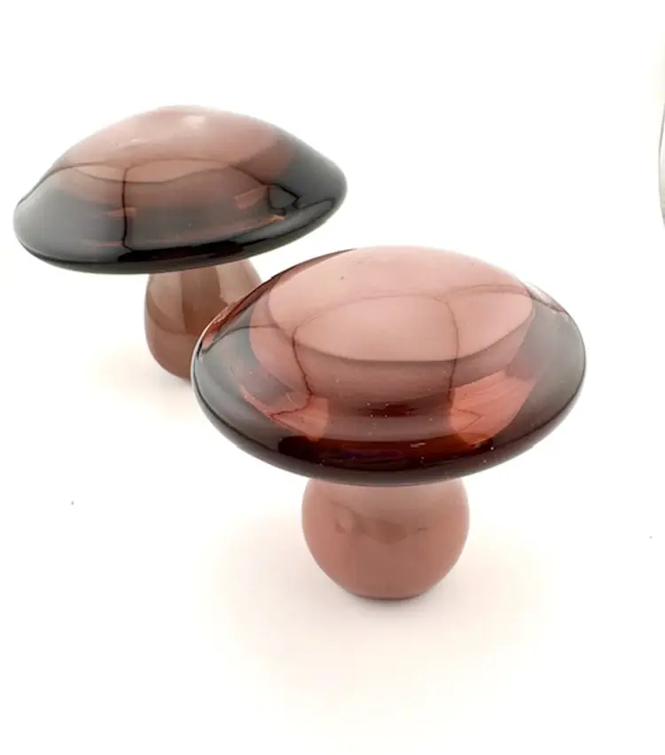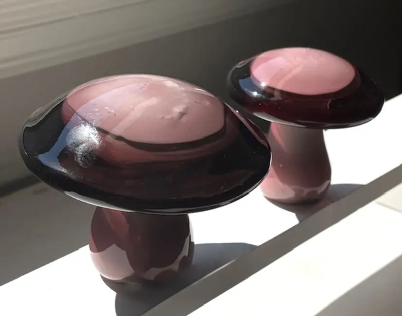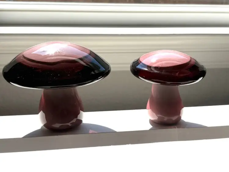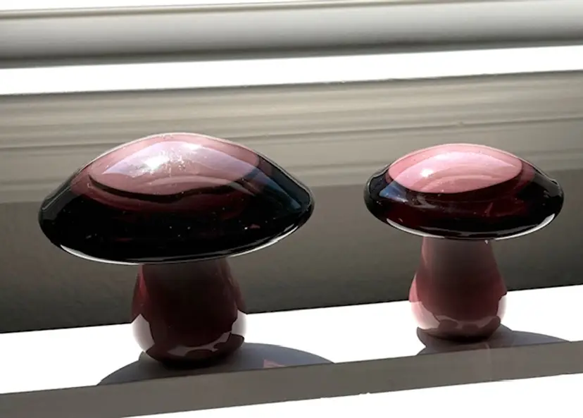 I have researched these two mushroom pieces and found an old listing on 1st Dibs that had mushrooms just like this but they were yellow and they were sold as Murano. The reason I am leaning towards Murano is that the stems from the bottom were almost identical, I have not been able to find any other stems like these. It is possible they are Viking or made in Sweden. They are rare. As you can see from the photographs they look different in different light. I am inclined to say they are amethyst colored but some light makes them look brown. The taller one measures 4" tall x 5" wide at the top x 2" at the base the tall one has tiny divets on the top, a divet towards the base and a divet on the stem. The smaller one measures 3" tall x 3.75" wide at the top x 1.5" at the base there is a small divet on the stem of the small. As with all the delicate items I ship it will be packaged with extreme care and I will add insurance.