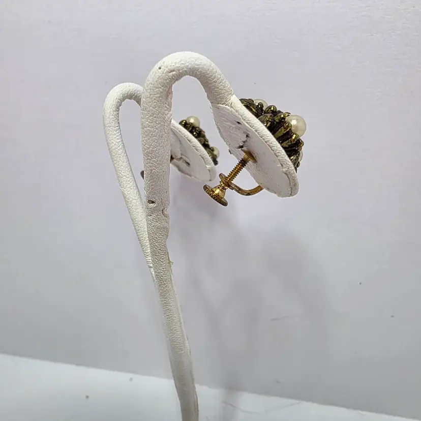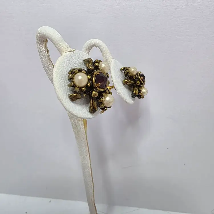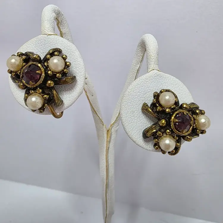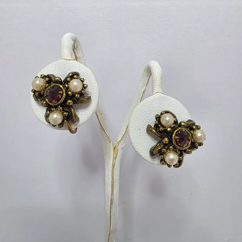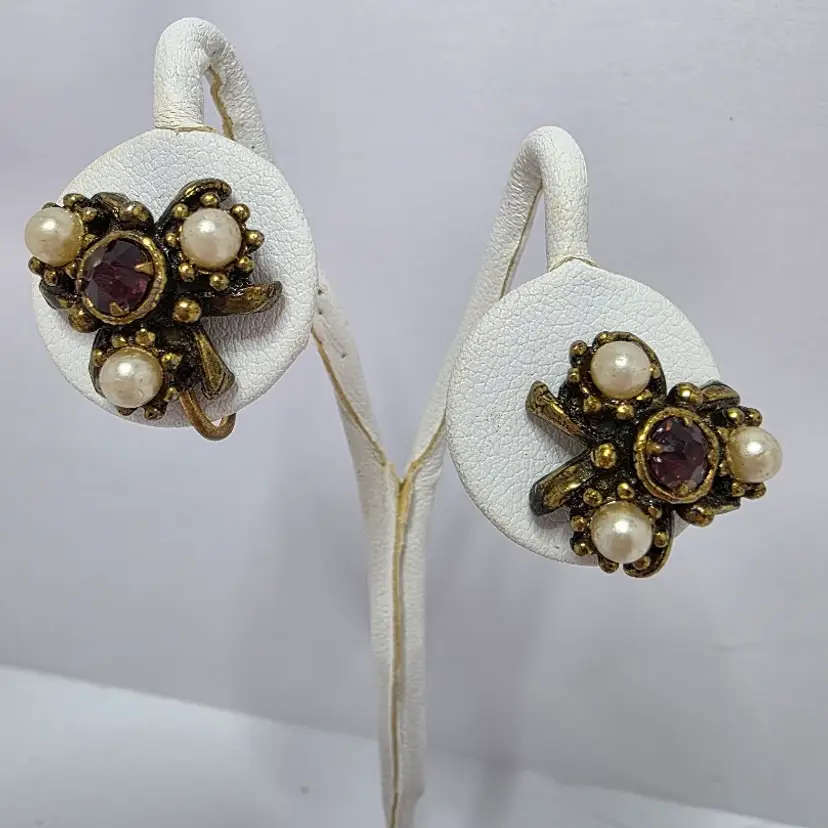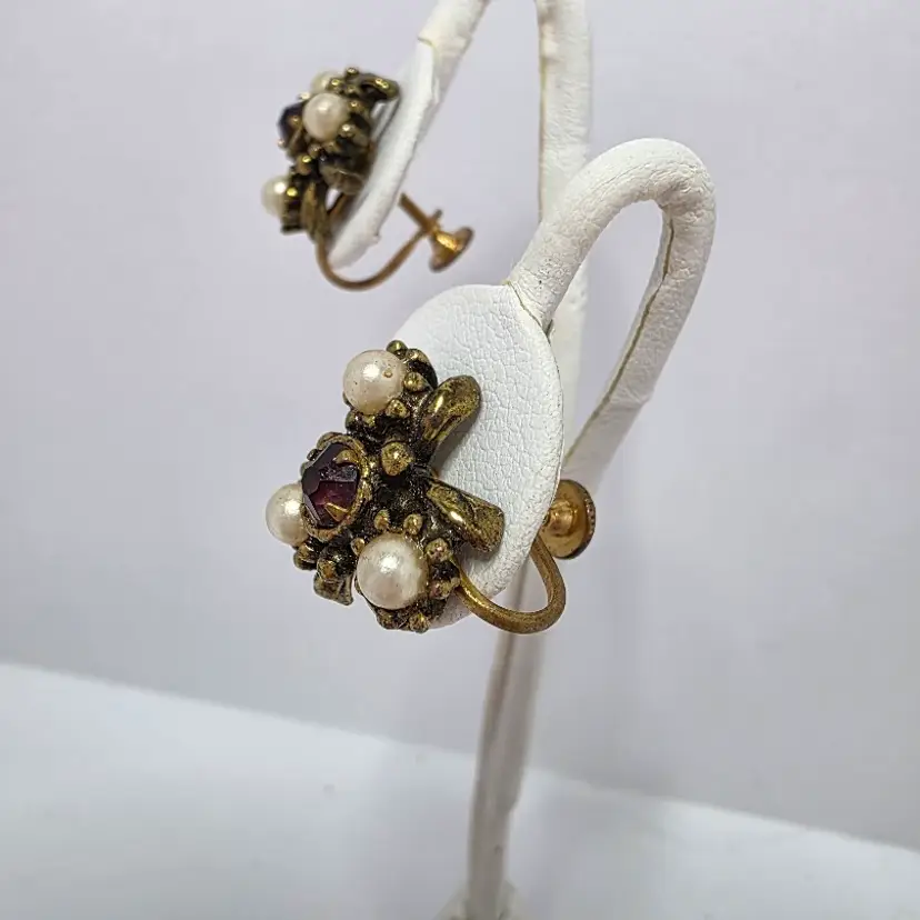 Elegant vintage Amethyst Screw Back earrings featuring lustrous faux pearls and Amethyst stones set in an ornate gold-tone design. Perfect for adding a touch of vintage glamour to any outfit. Tote #11