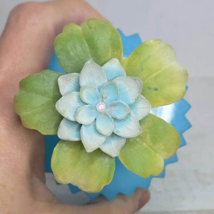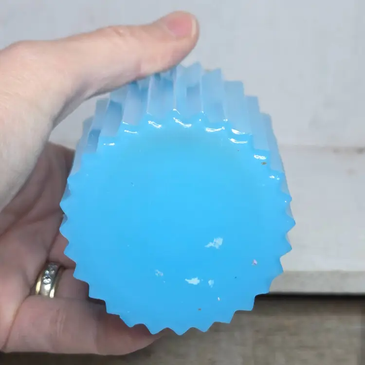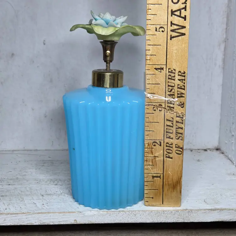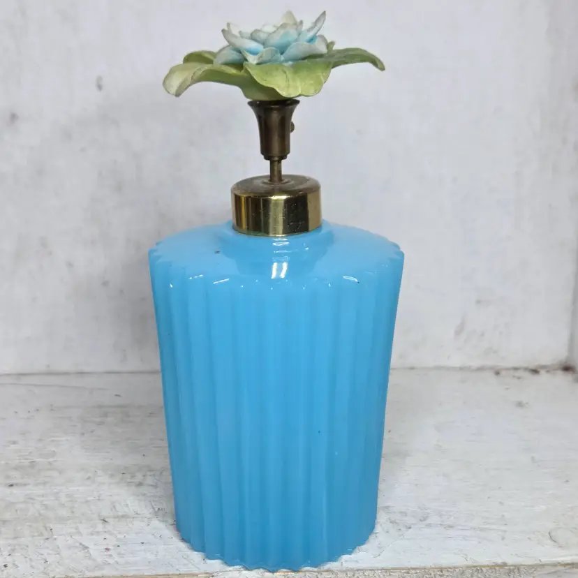 Flower Top blue glass bottle no chips or cracks. Flower top may need a little cleaning (a little dusty) but in overall great shape.