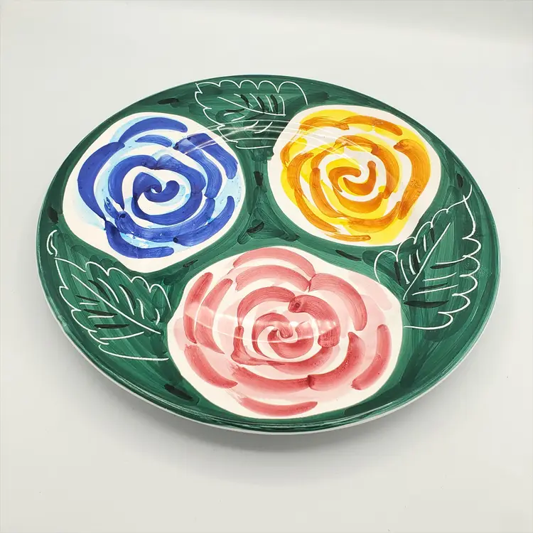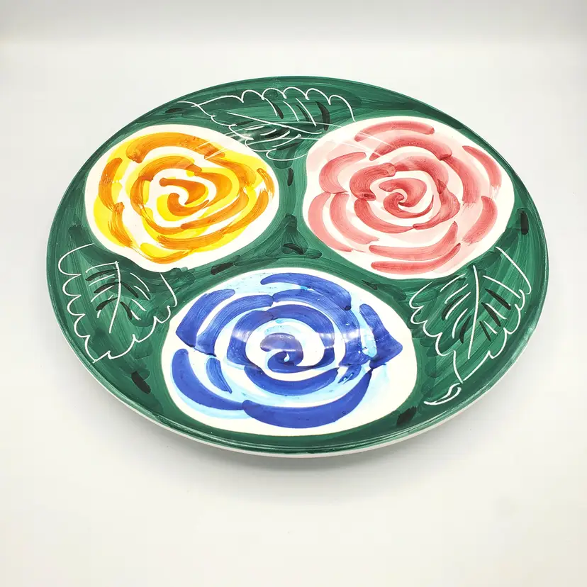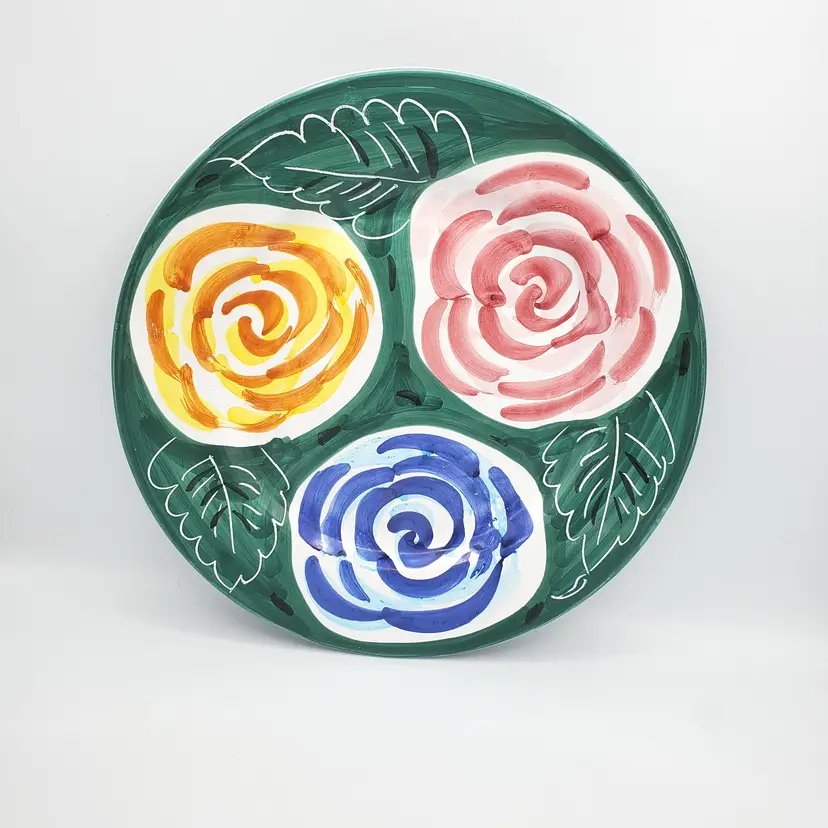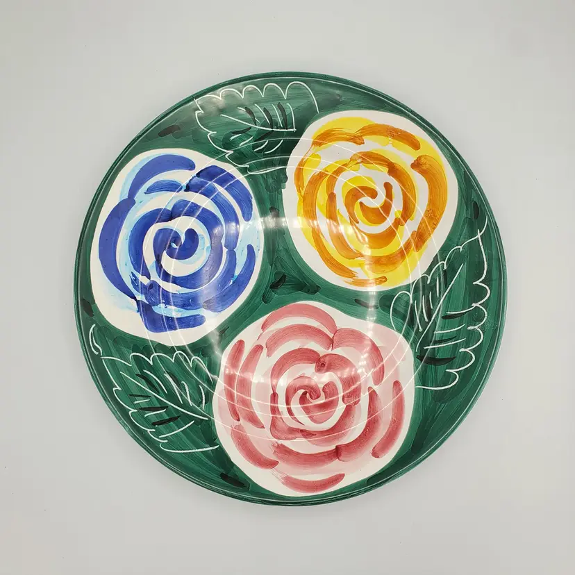 This Pier1 platter features a beautiful floral pattern in green, blue, yellow, and pink on a round ceramic plate. The charming flower theme and vibrant hand painted colors make this platter a great addition to any decorative cookware, dinnerware, or serveware collection. Whether you're a fan of vintage Deruta Italian pieces or simply appreciate the beauty of floral patterns, this Pier1 platter is sure to catch your eye. Thanks for looking!