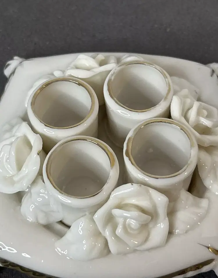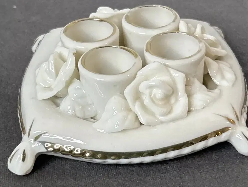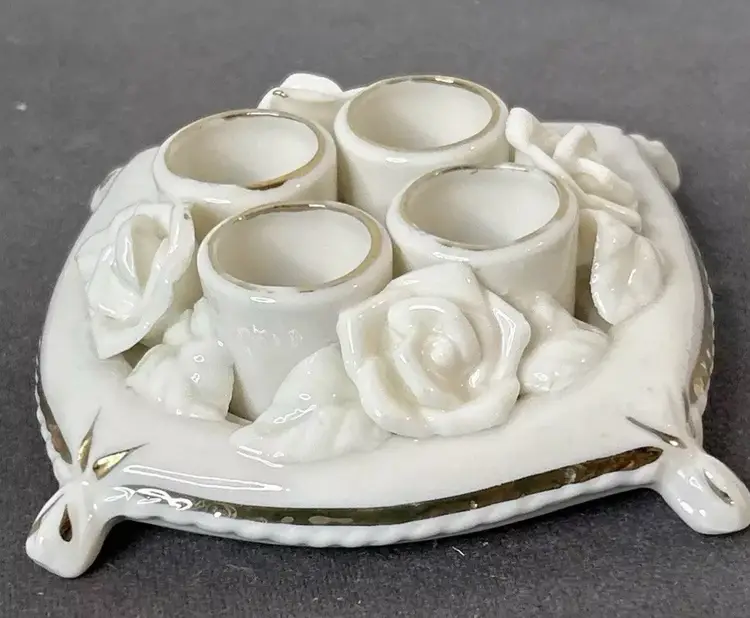 This Vintage Porcelain Floral Footed Vanity Lipstick Holder - White with Gold Gilded highlights 1950's Japan is in excellent vintage pre-owned condition with NO chips, cracks or repairs. However, it does show slight wear as some of the gold gilding has faded in some areas. Please review all pictures for proper assessment of its great vintage pre-owned condition.