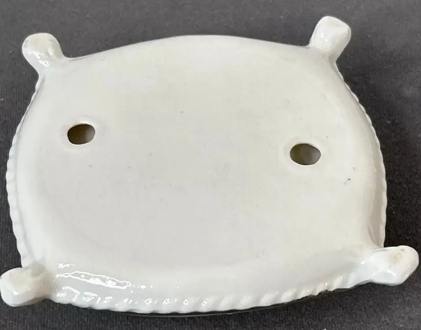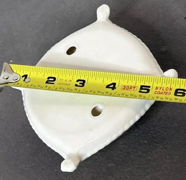 With its unique vintage design this lipstick holder is a must-have for any beauty enthusiast. Whether you're a collector or simply looking for a beautiful way to store your lipstick, this piece is sure to impress. Add a touch of elegance to your vanity with this vintage porcelain footed vanity lipstick holder. This little beauty measures 6" inches corner to corner and is about 2" inches tall.