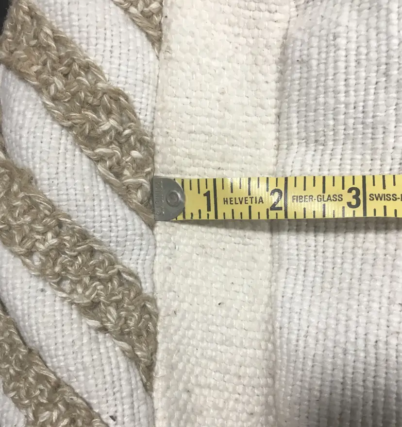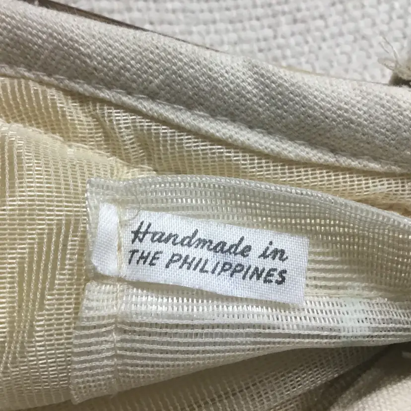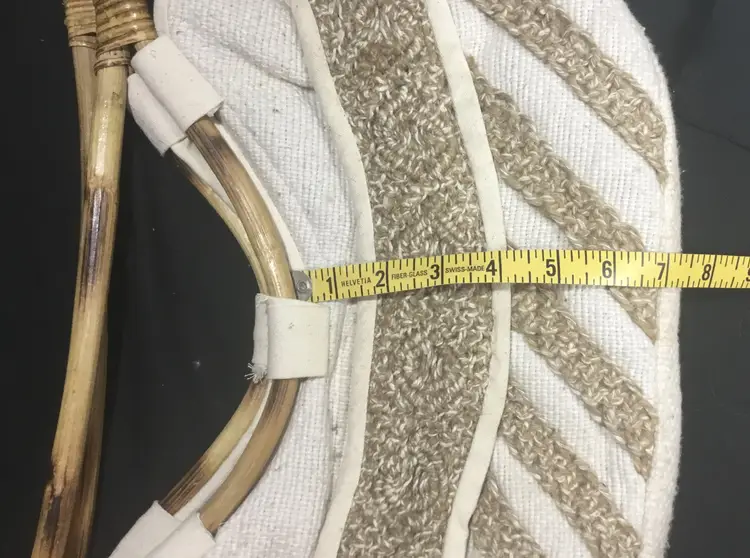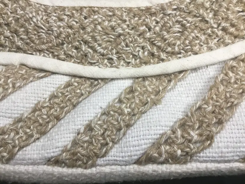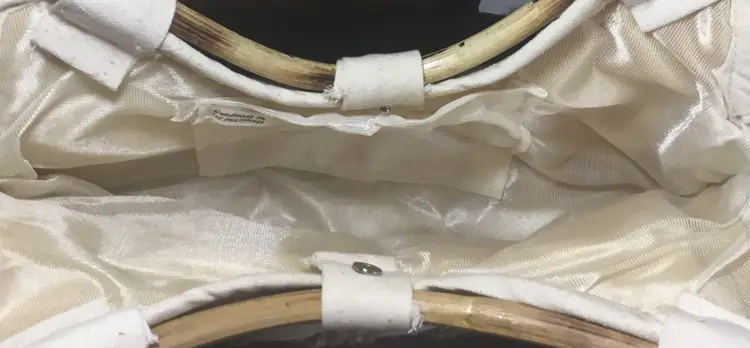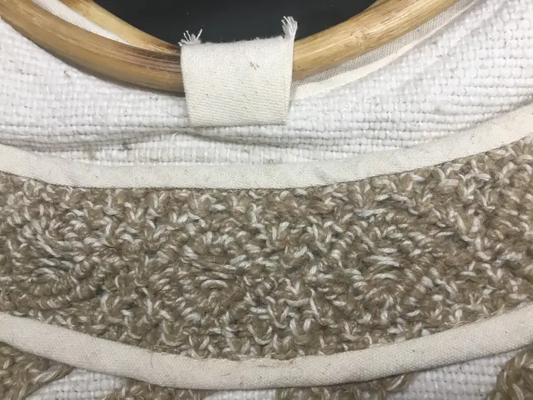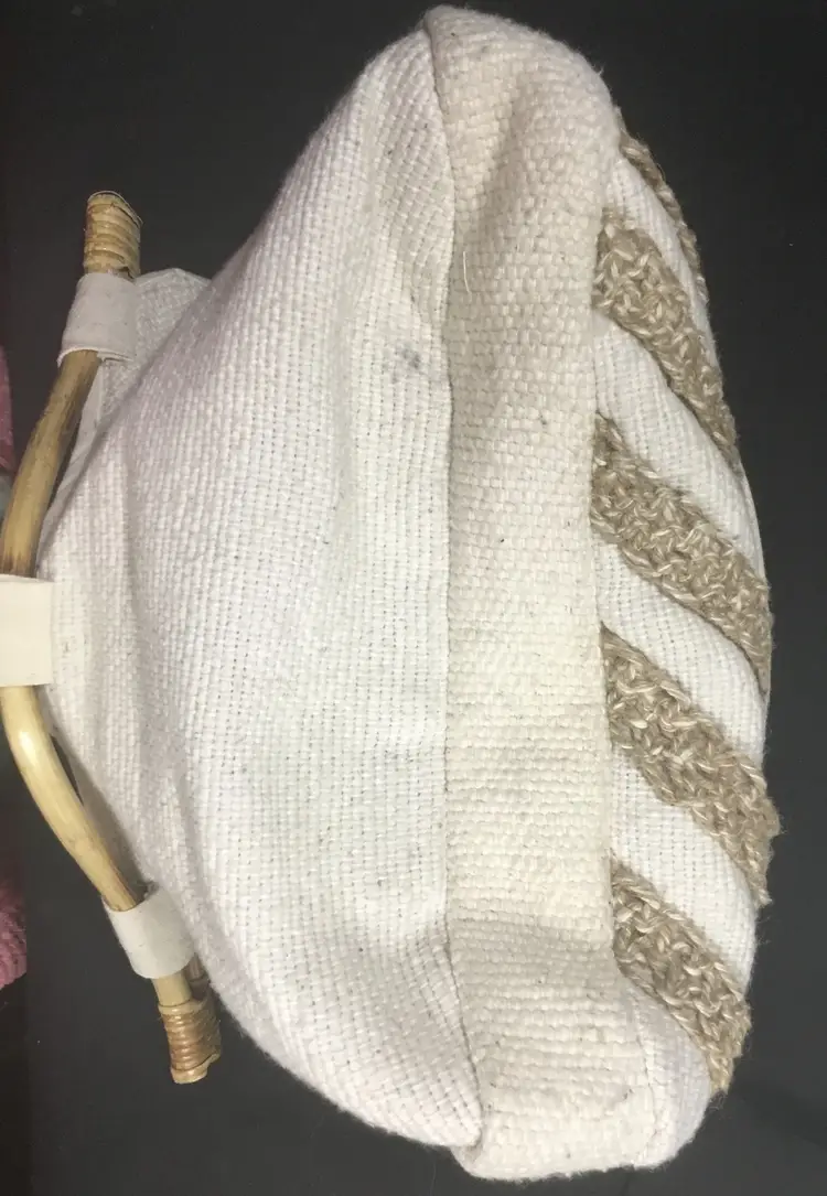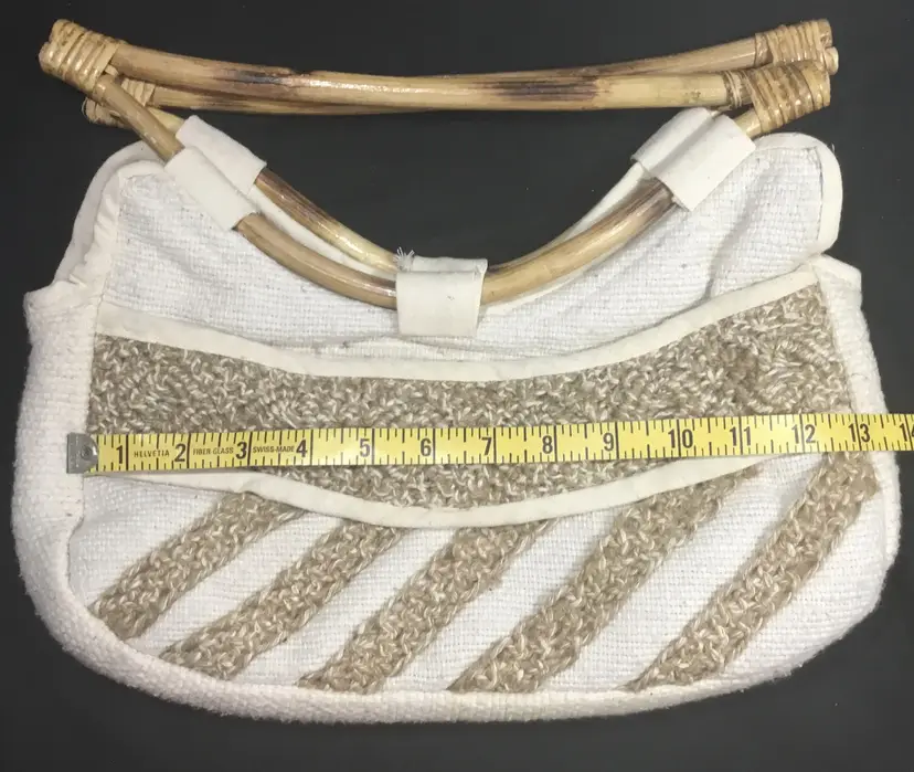 Woven cotton purse with jute embellishments sewn on front. Lined, small, inner pocket made with lining material, large outer pocket with open top. Single snap closure. Bent bamboo handles will fit over forearm. Purse is 7 inches deep, 13 inches wide and 2 inches from front to back. No care instructions were included. Possibly hand washable, but may shrink if not stretched while air drying. Inside of purse is clean, outside is lightly soiled on the bottom.