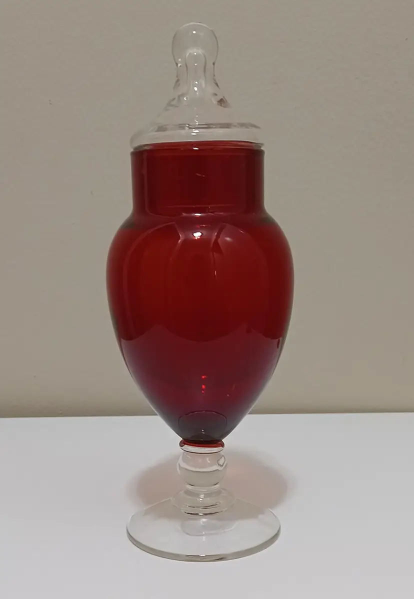 Vintage Red And Clear Apothecary Jar; Nice addition to your holiday decor!; Excellent condition; no chips or cracks; 8.75" tall x 3" wide