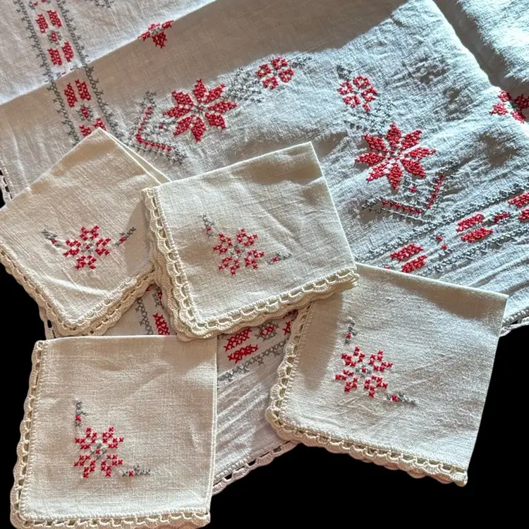 Ivory linen tablecloth or table topper with 4 matching napkins. All have crocheted edging. One napkin has a small spot otherwise excellent condition. 31 x 31” napkins 11 x 11”