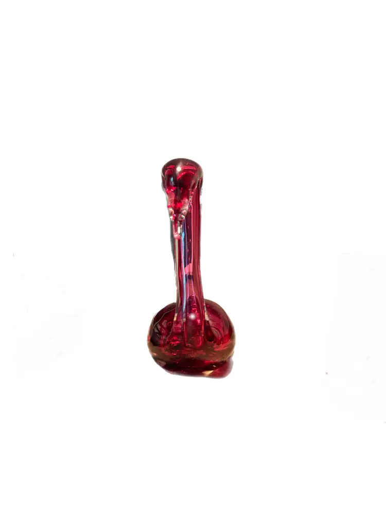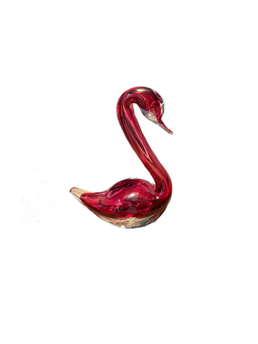 Add a touch of elegance to your space with this stunning red art glass swan figurine. Expertly hand-blown, this graceful piece features a deep ruby red body with clear glass accents on the beak and base. Its smooth curves and reflective finish make it a striking decorative object for shelves, mantels, or display cabinets.