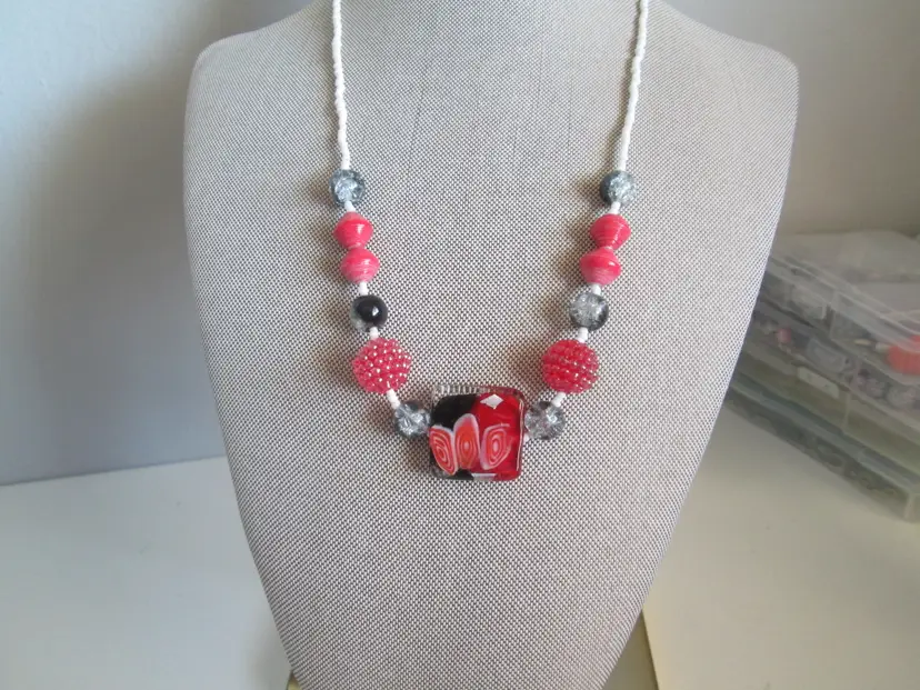 Vintage red Venetian and black and clear crackle glass beaded necklace. The length measures 21" to 23" with adjustment. This is an upcycled design using vintage beads and findings.
