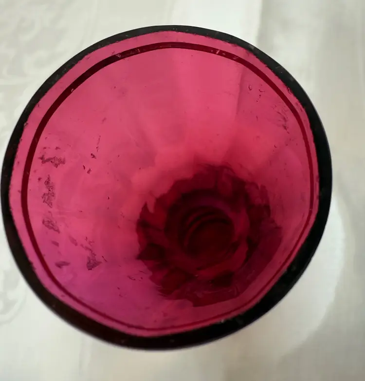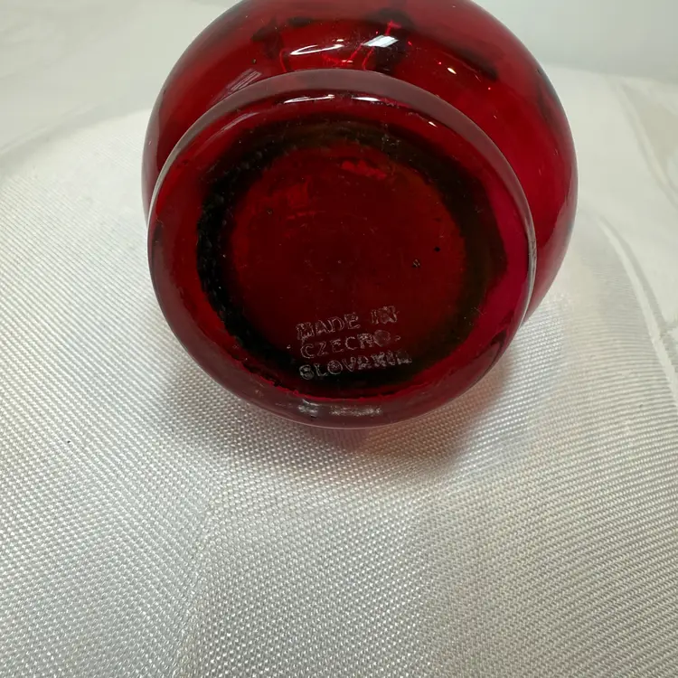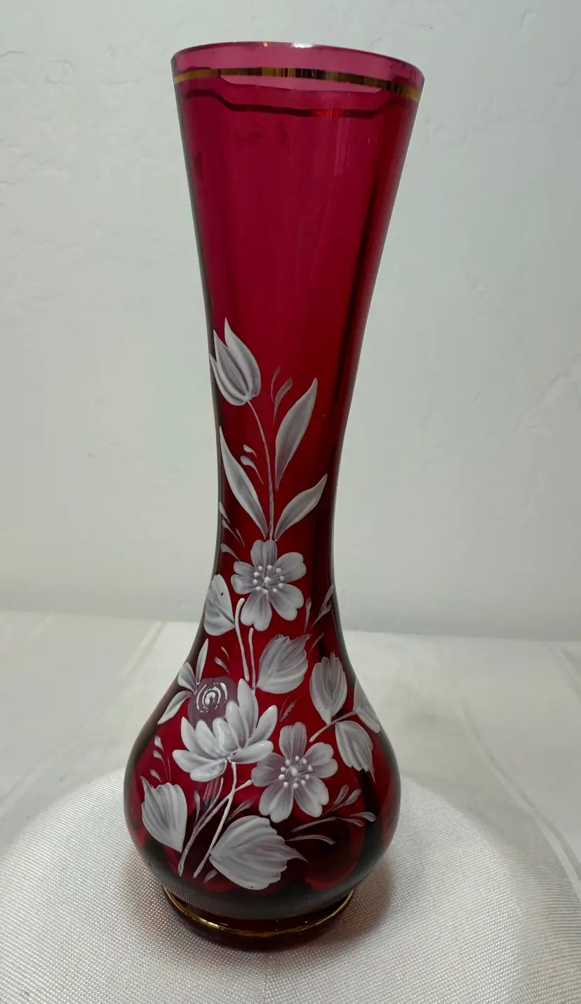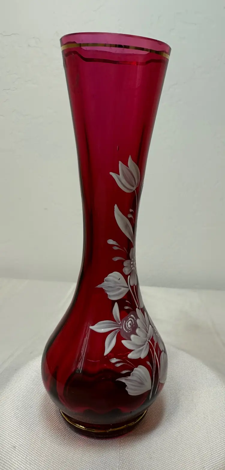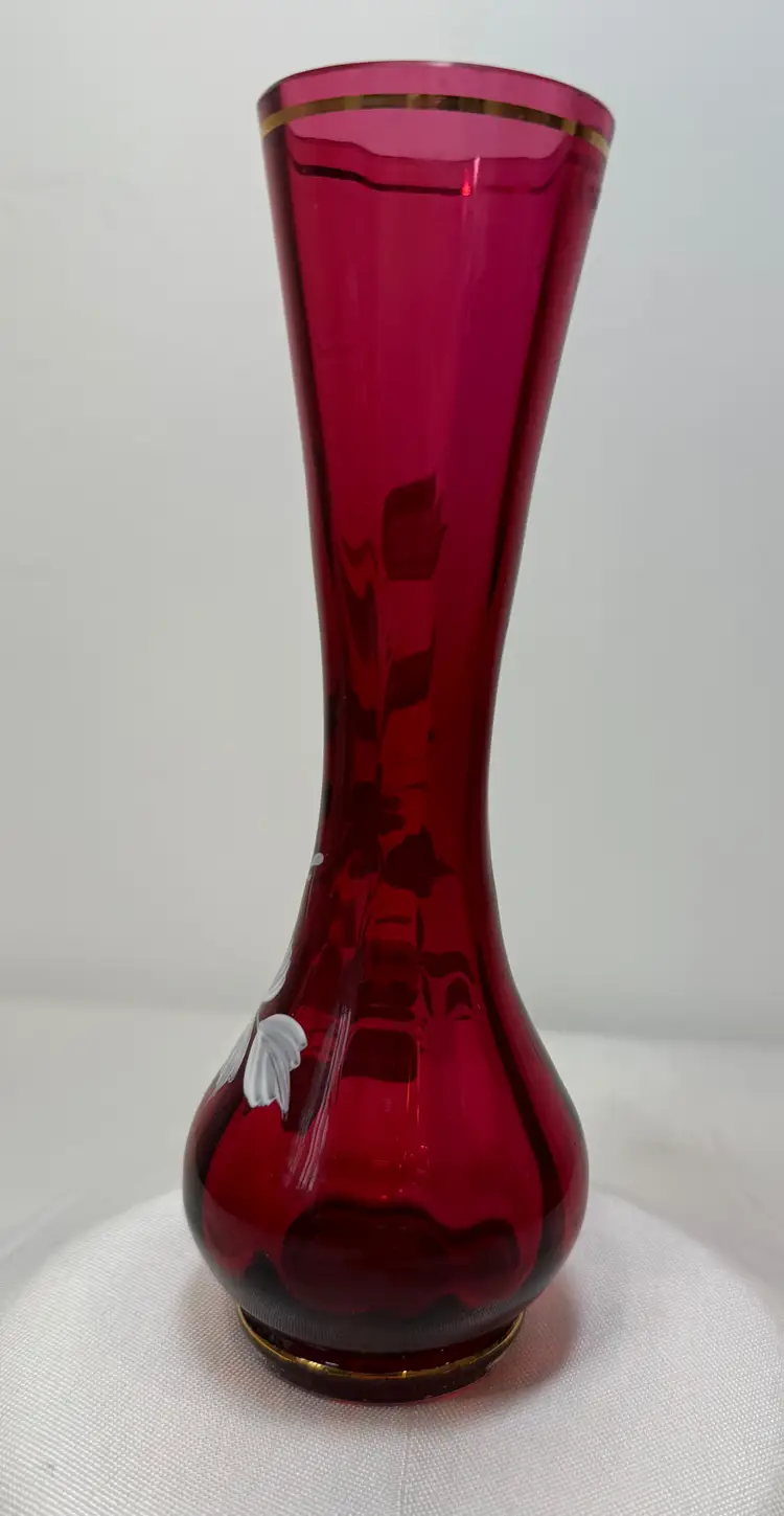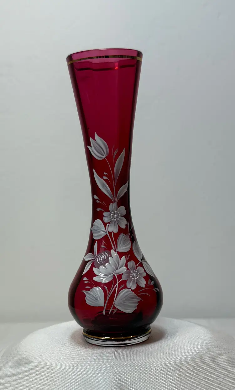 Vintage ruby red glass vase with a white hand-painted floral design. Marked made in Czechoslovakia. Very good condition. Size 6.5"tall, 1.5"opening, 2.25" wide