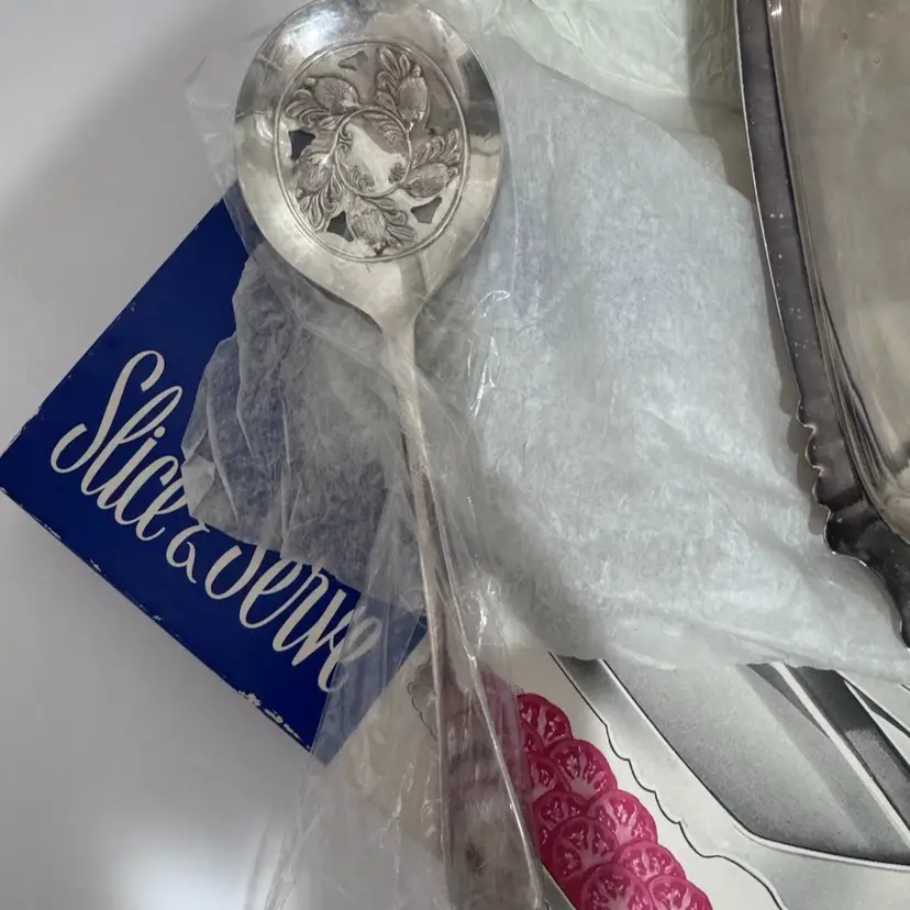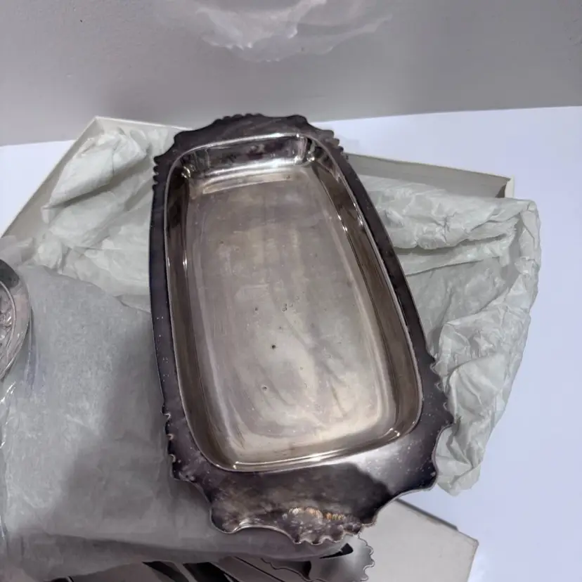 Still in original box. Some tarnish on platter. If you’d like, I’d be happy to clean it for you or send as is. Platter measures 10 inches long. An amazing gift for a vintage, loving hostess!