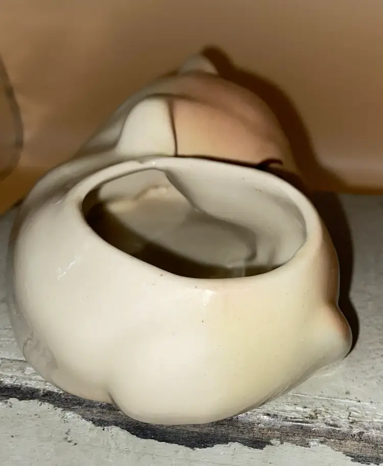 Approx 5” L x 2”H. He has one little chip on the opening of the planter just behind the dog’s head, otherwise in great condition.