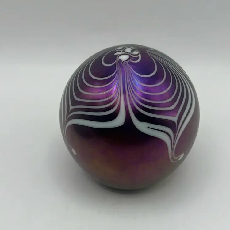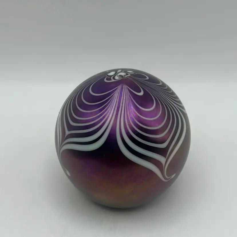 Stunning iridescent colors of purple and gold. Featuring white swirls throughout and in excellent condition!