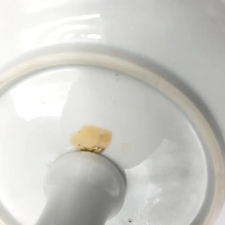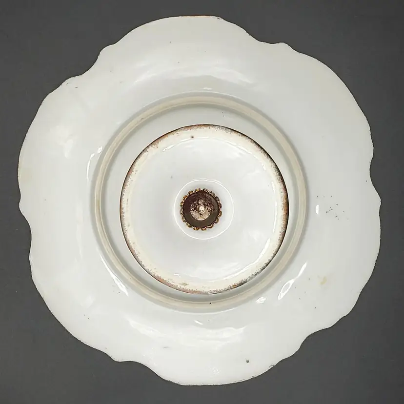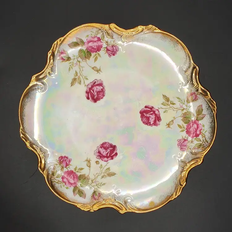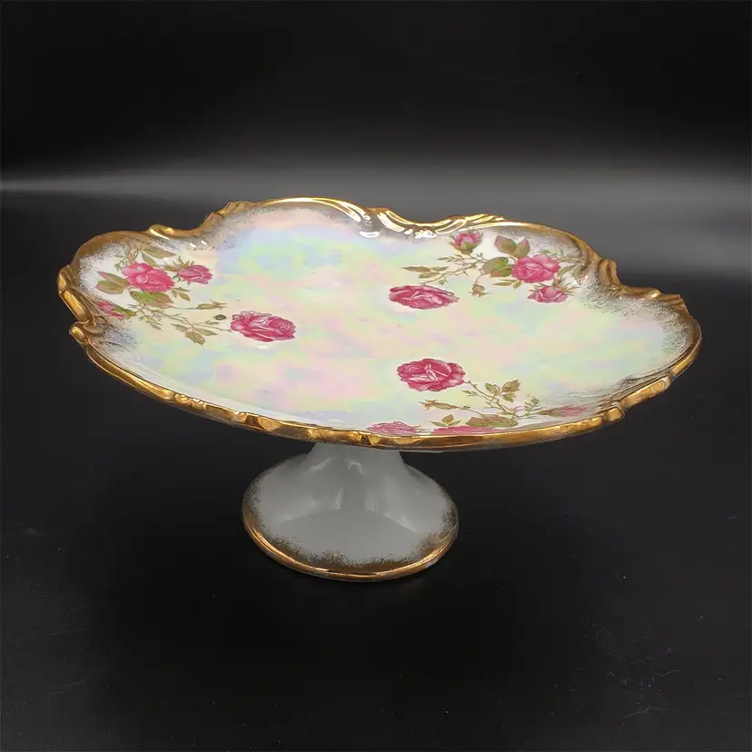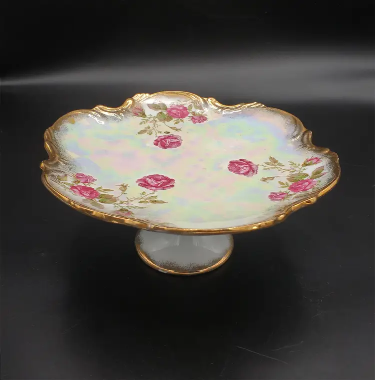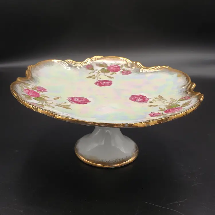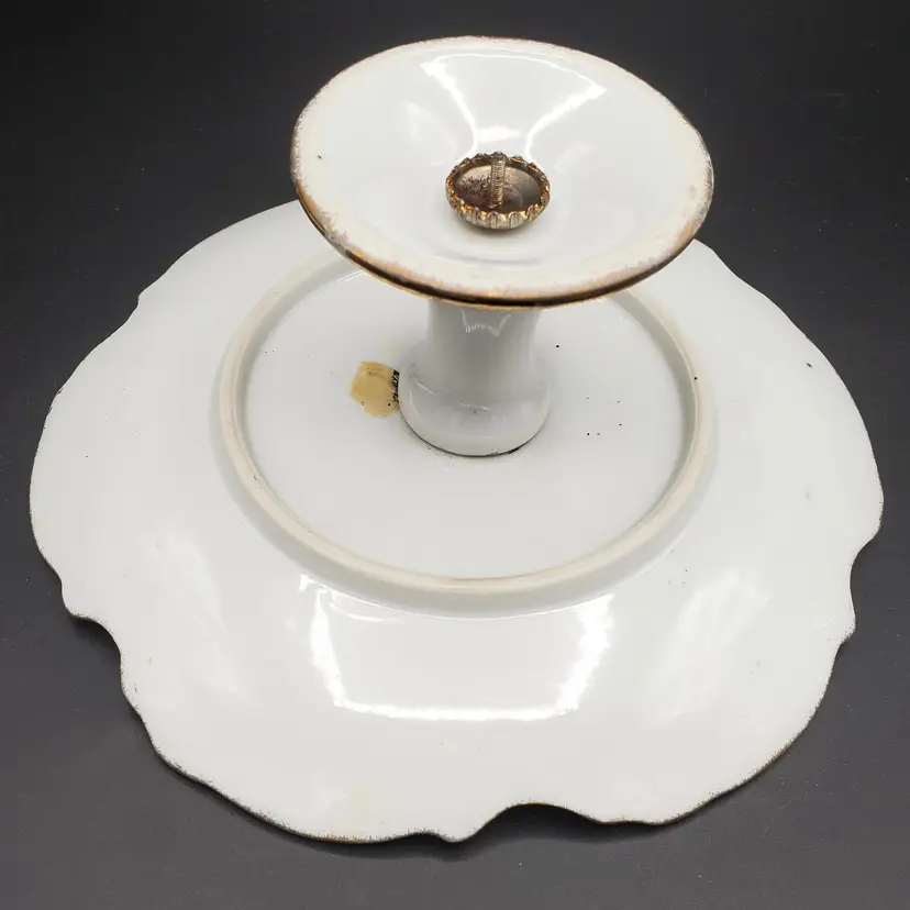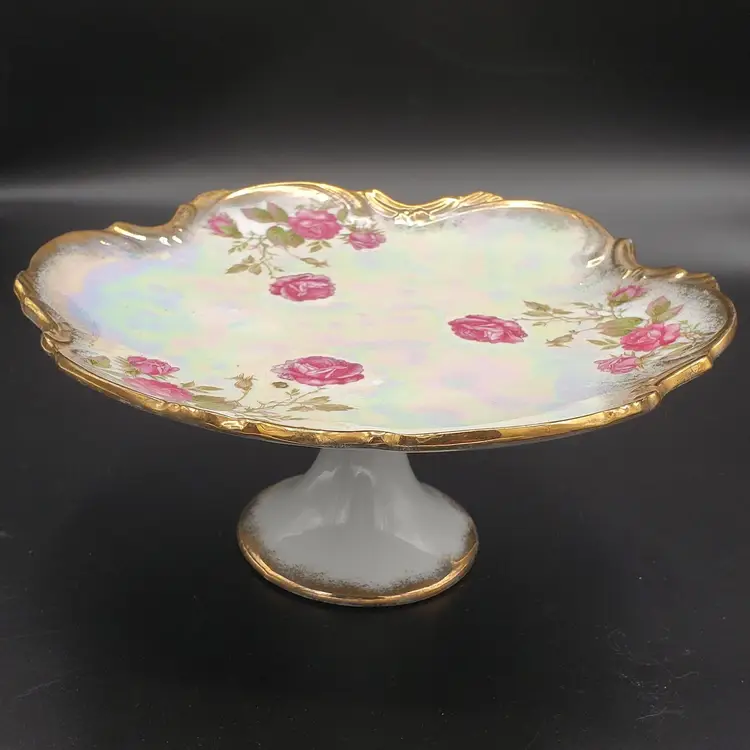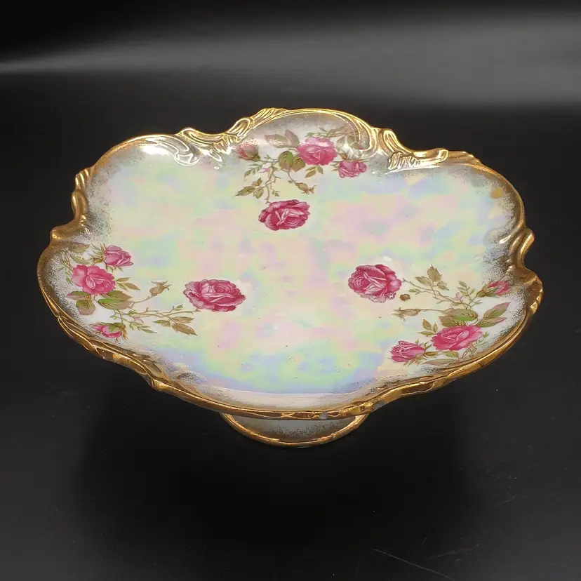 I'm not sure of the maker of this sweet little bon bon plate. There is the remnant of a sticker on the bottom but I'm not sure what it represents. I picked this plate up because, although not a perfect match, it's very close in appearance to the tea set from Sterling China that I have posted. They'd make a nice set together! It stands approx 3 " tall, 7" across and has wear consistent with age, no chips or cracks. Thanks for looking!