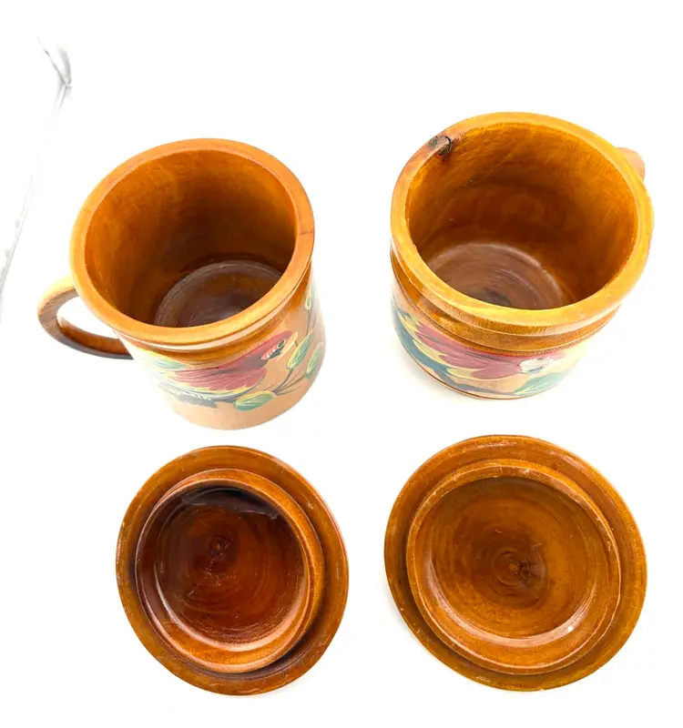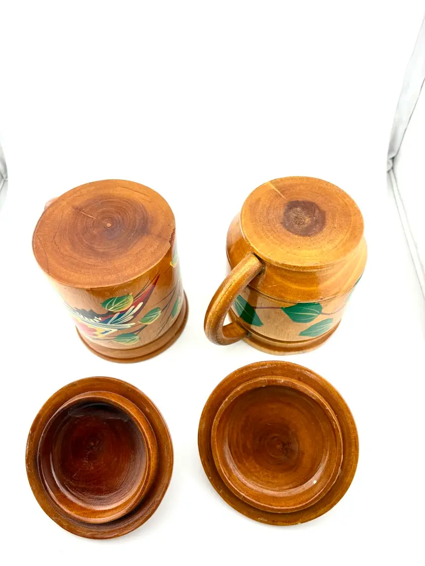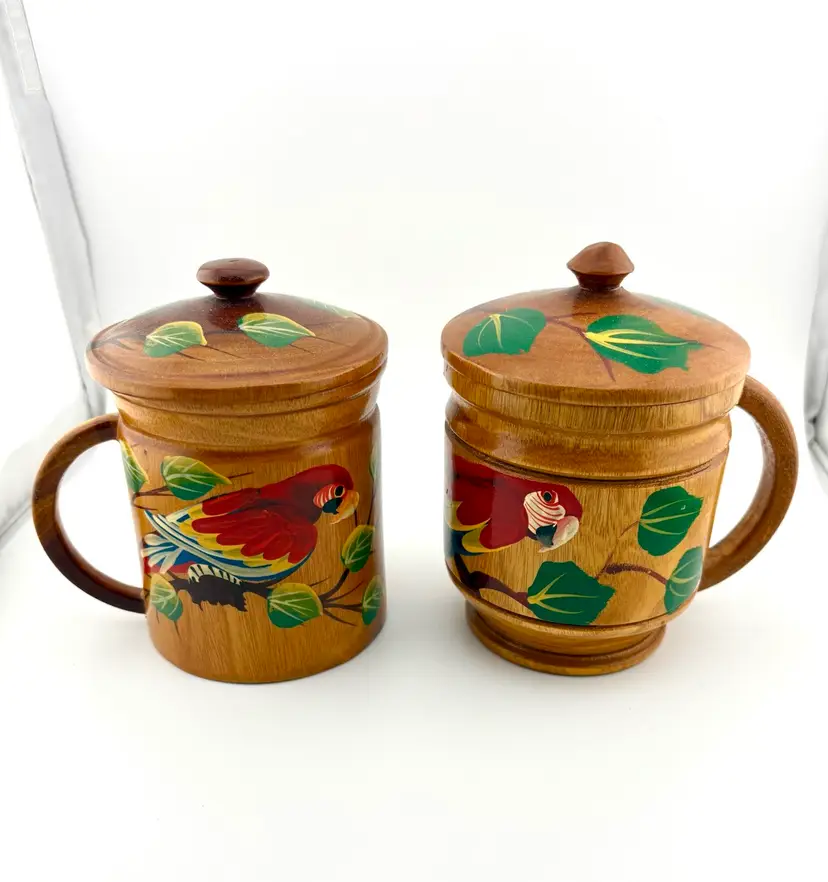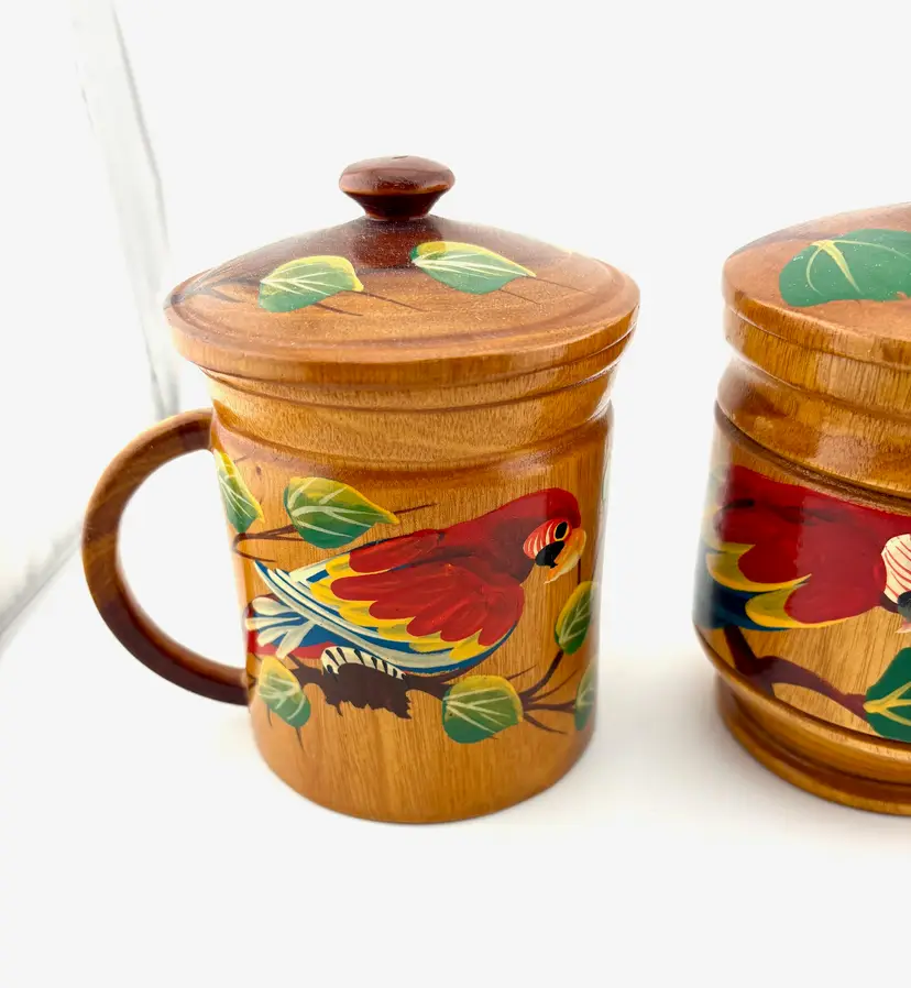 Hand painted wooden mugs can be used to hold straws for drink stirrers. Add them to your tropical/tiki decor.