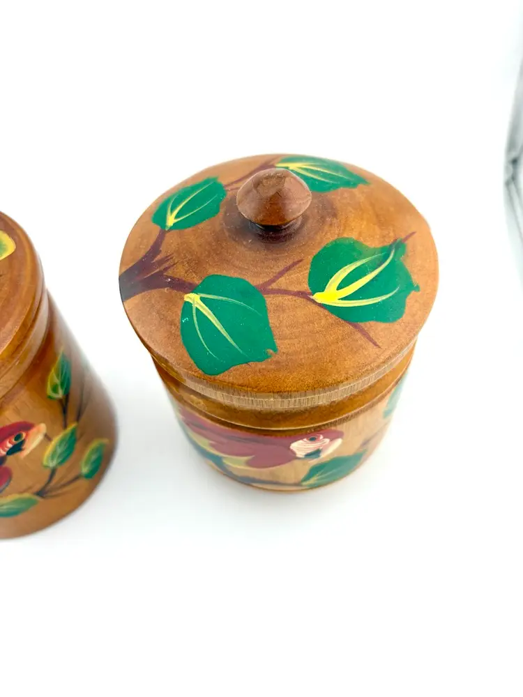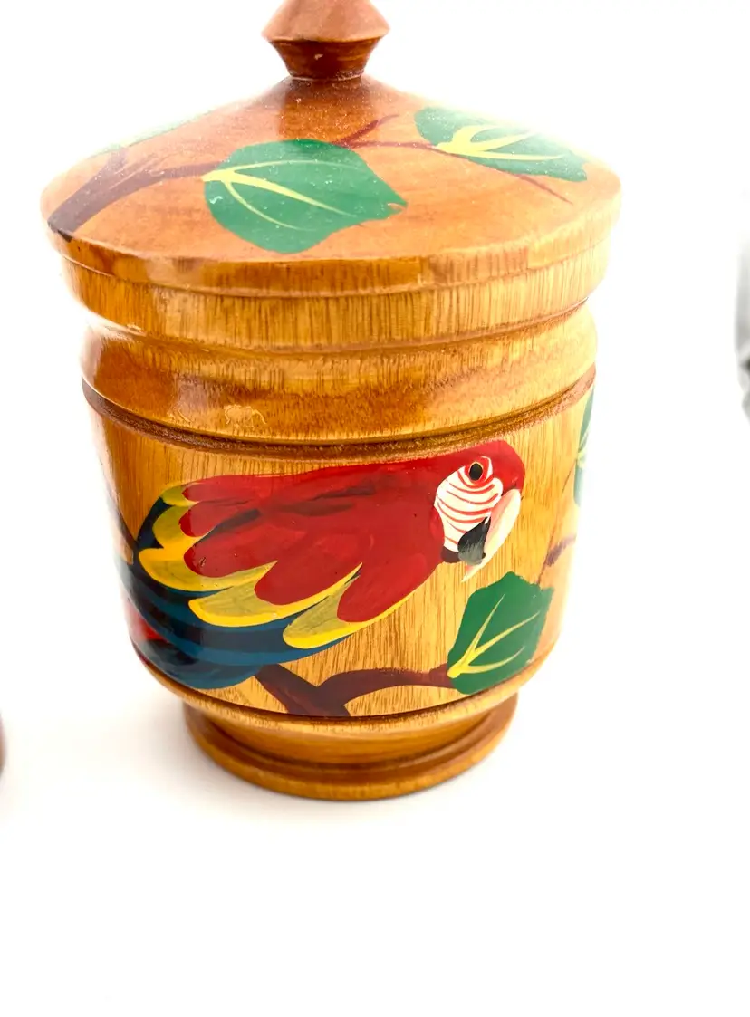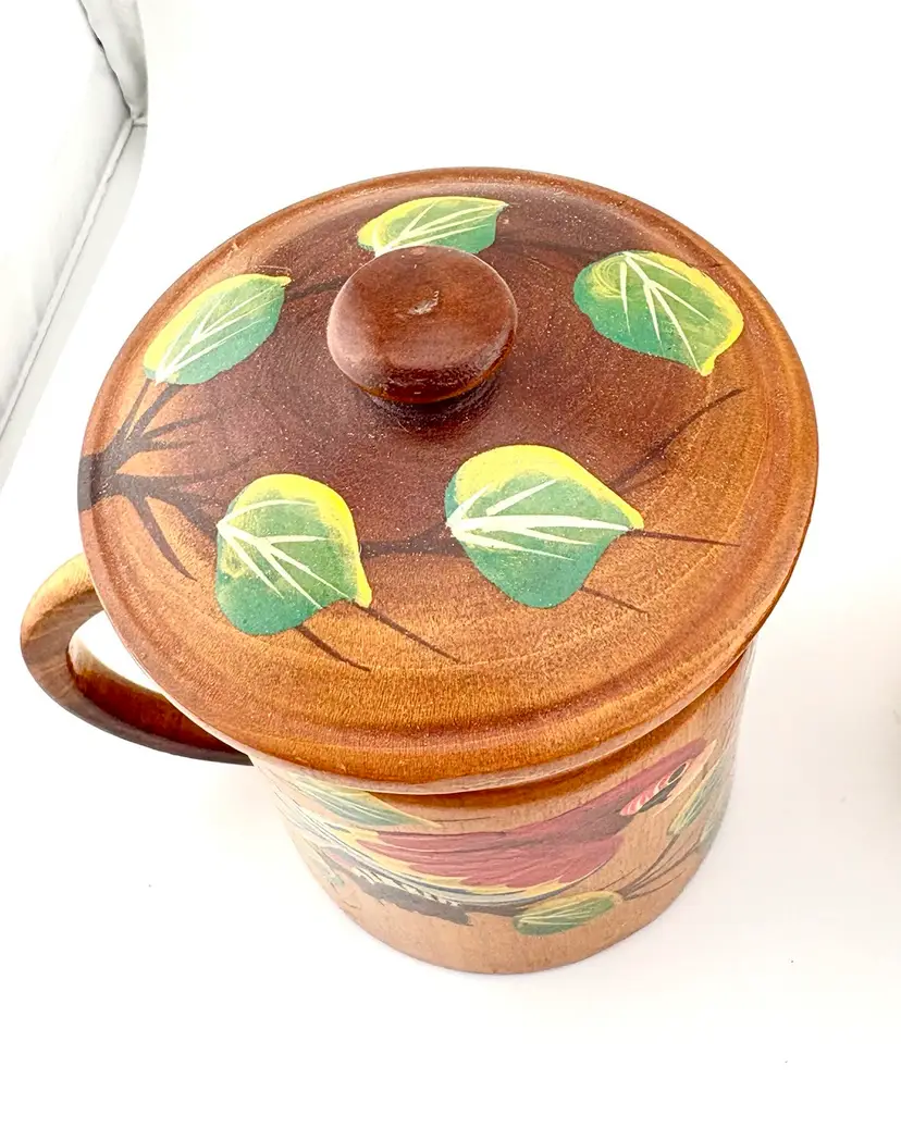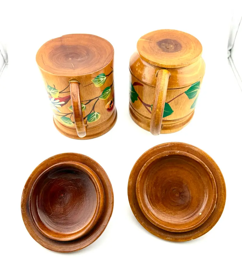 Hand painted wooden mugs can be used to hold straws for drink stirrers. Add them to your tropical/tiki decor.
