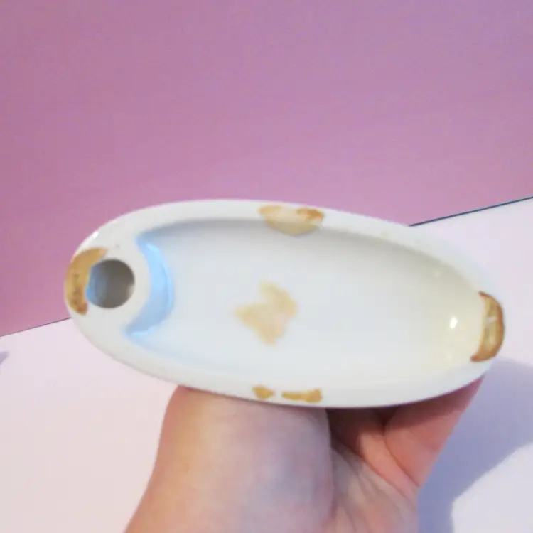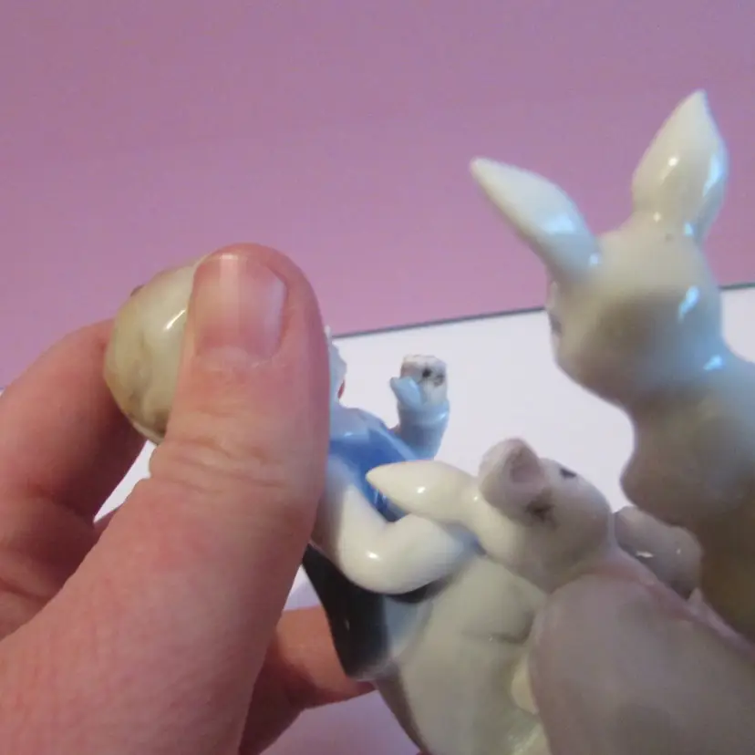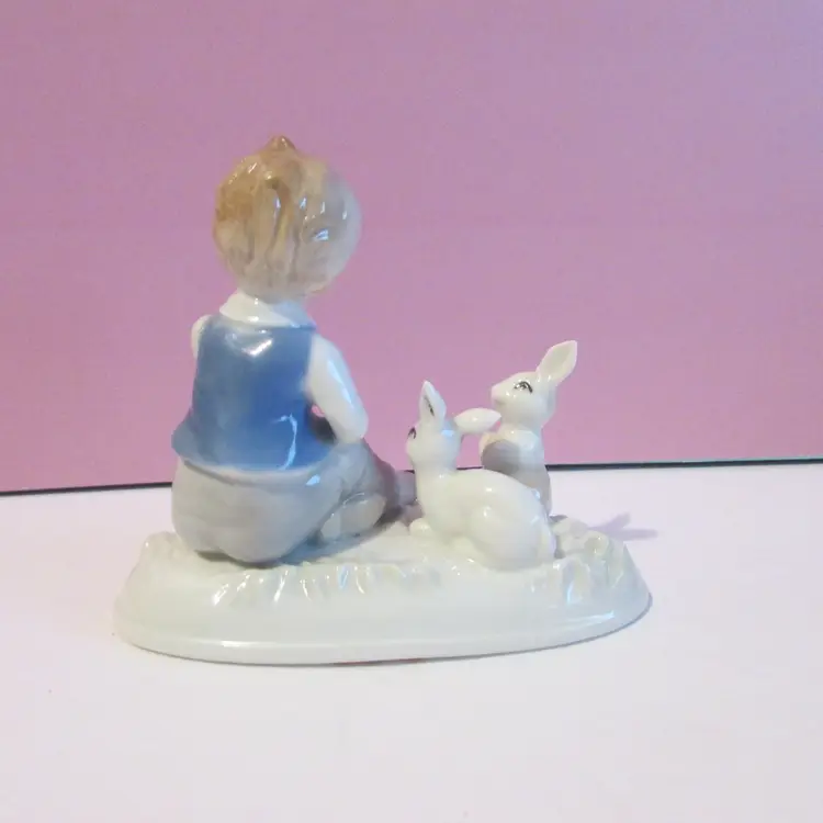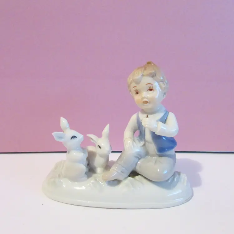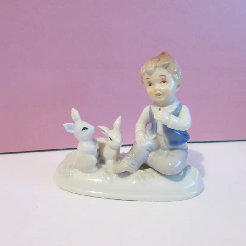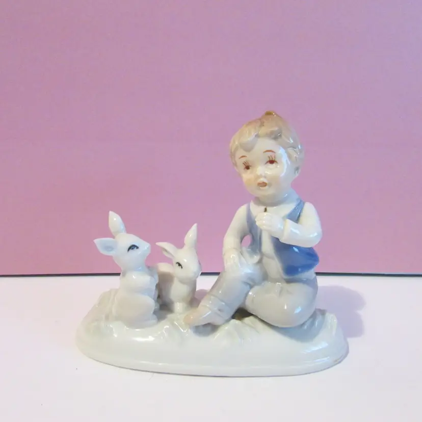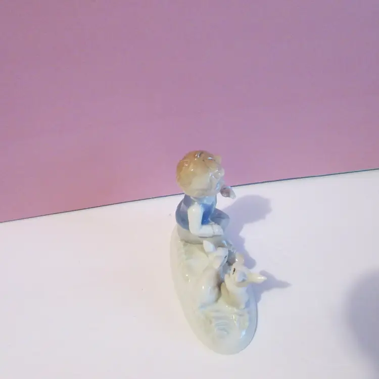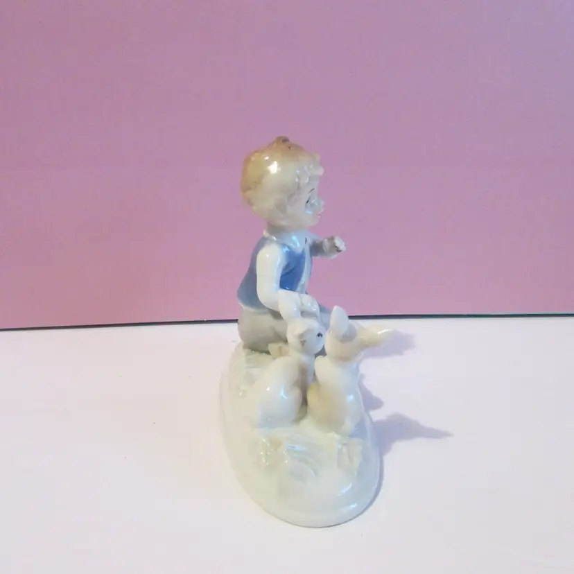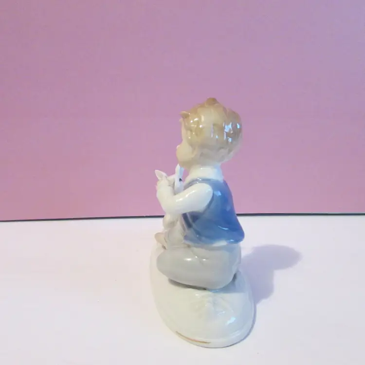 This adorable figure has some wear, the is some staining on his hand and on the bottom. Still a lovely piece to display, it is about 4" x 5 1/2" x 2 1/2".