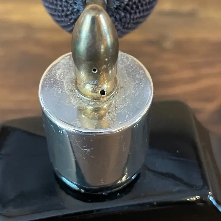 Good used condition . Bulb works. Small chip on glass and tarnish on lid. See photos .