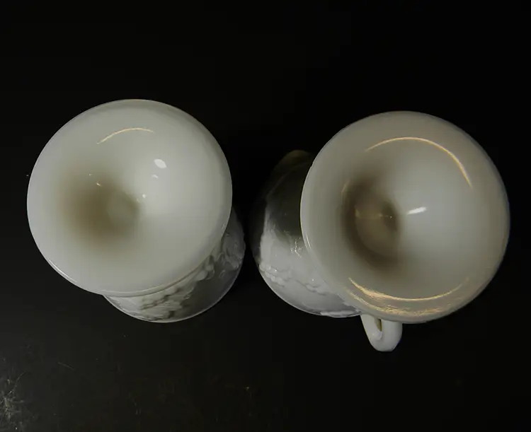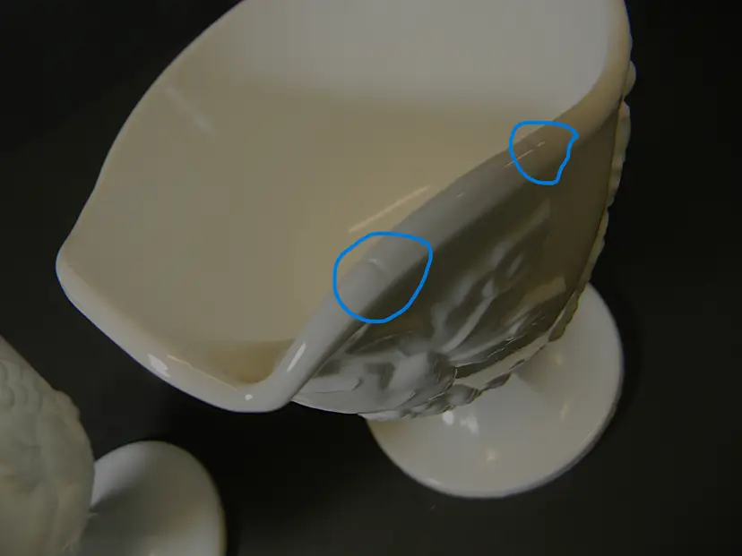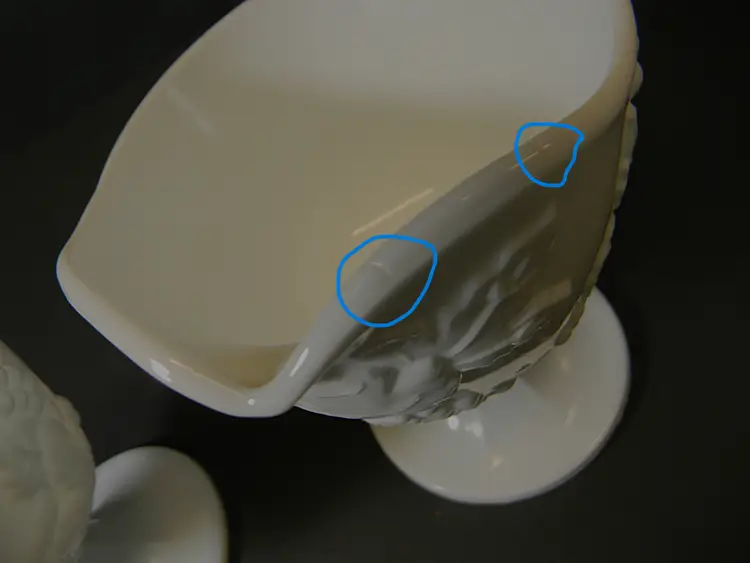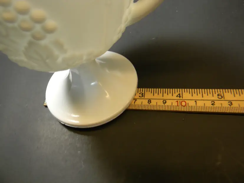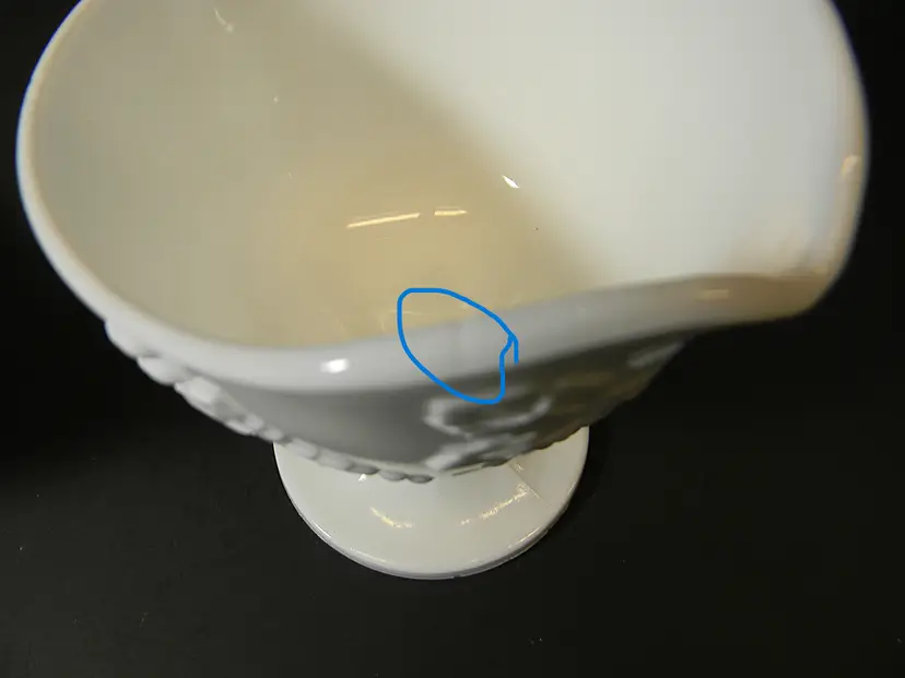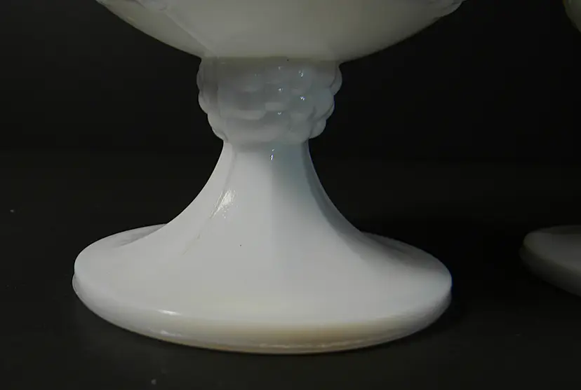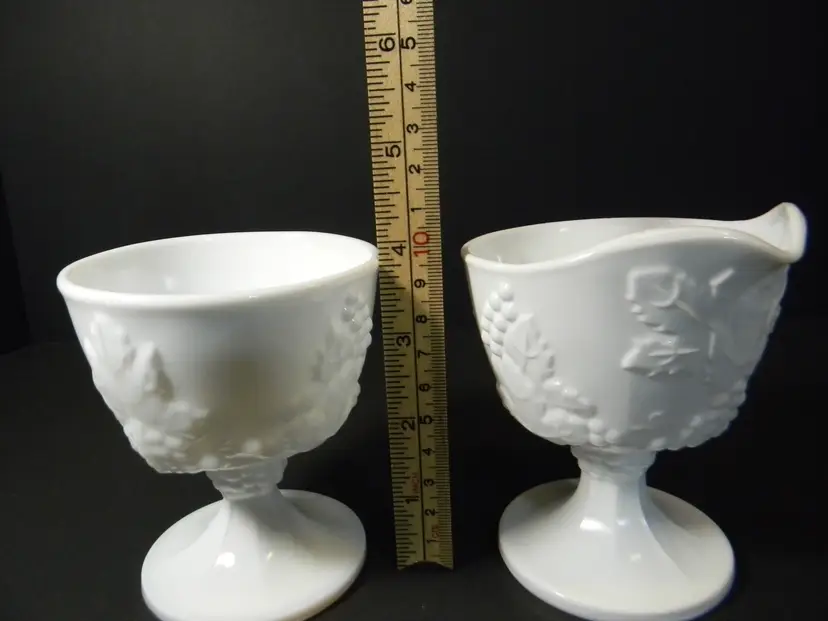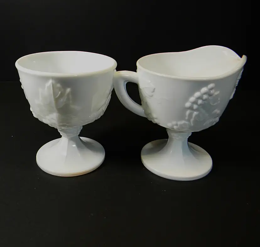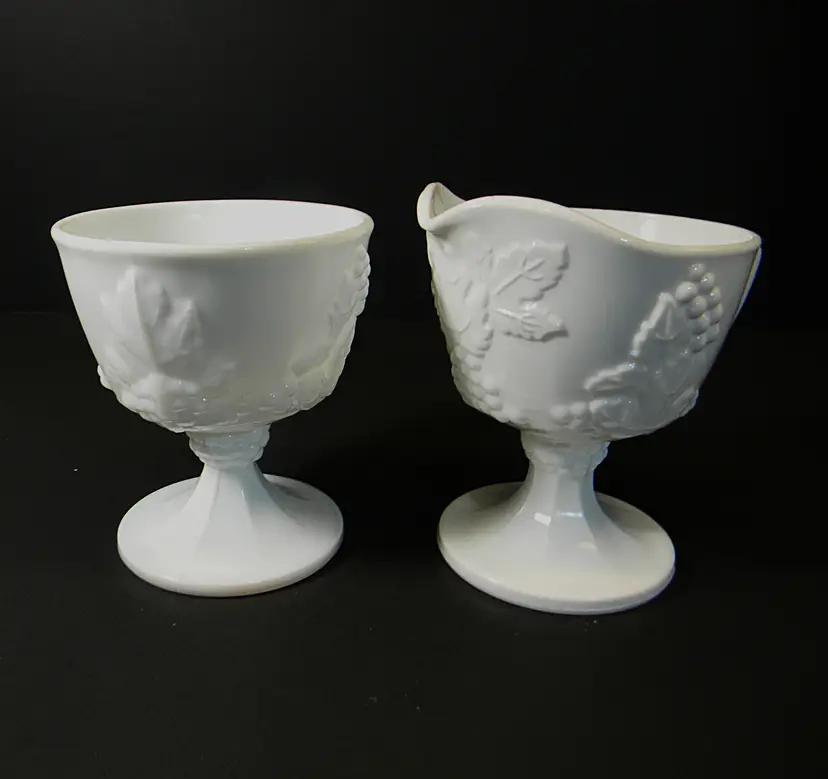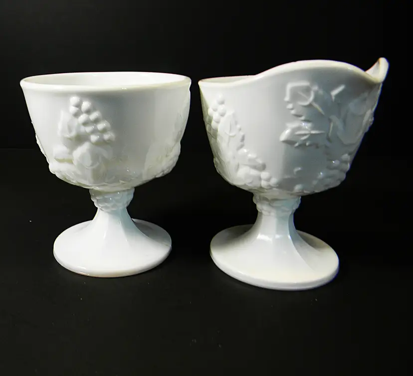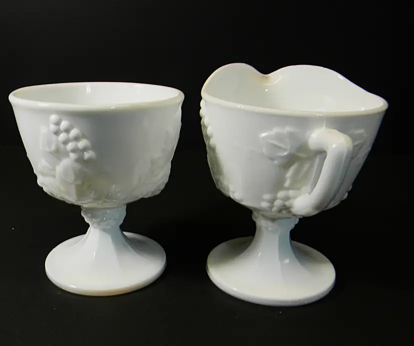 Vtg Milk white glass creamer and sugar pieces from the Indiana colony harvest pattern. has grapes, vines, and leaves. Made by Indiana glass Co. and sold under the Lancaster Colony has a few flea bits on the creamer. No chips or cracks used condition see photos The difference in computer monitors actual colors may vary slightly from those shown