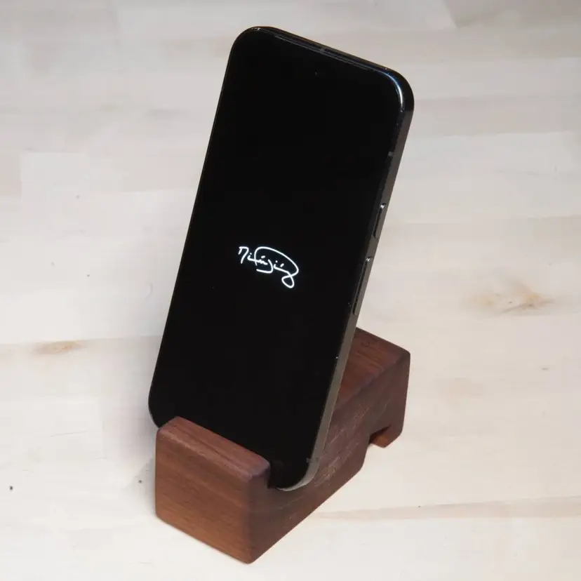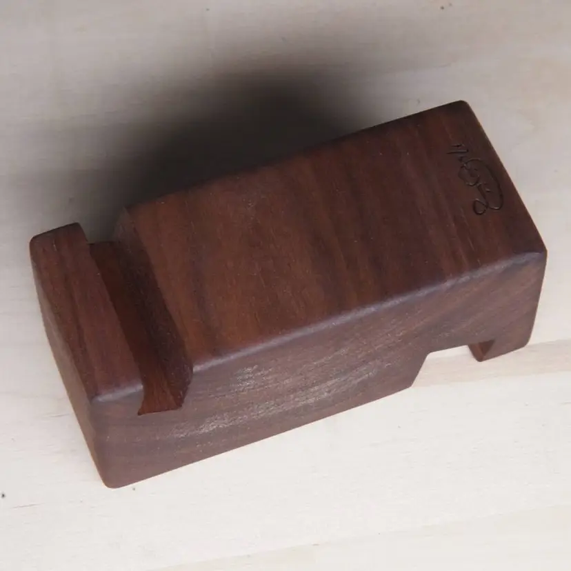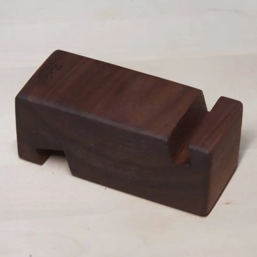 Made from a block of solid walnut, this cell phone stand has a slot on each side — one measuring 3/8" for a phone with no case, and the other at 5/8" to accommodate a phone in a case (make sure your case would fit this slot).