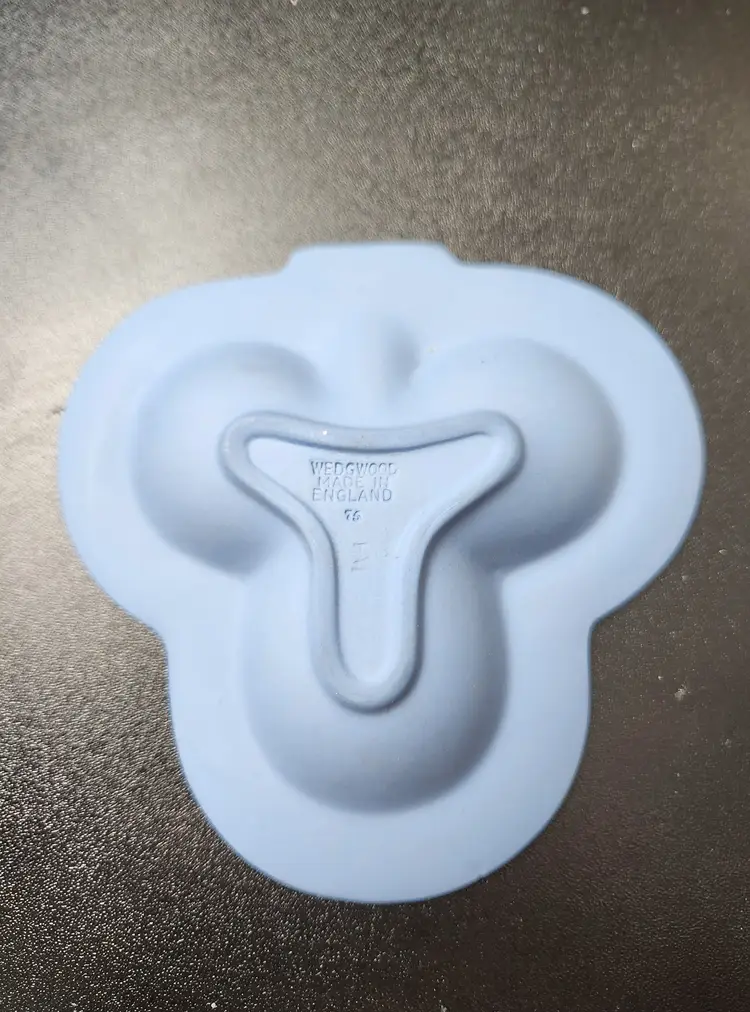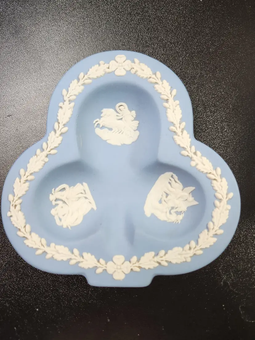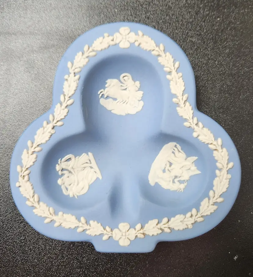 Wedgwood blue Jasperware clover-shaped trinket dish, in signature matte blue background with detailed white neoclassical motifs. One small chip along the bottom. 4.5"