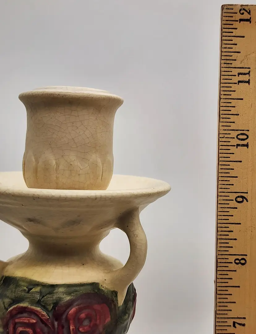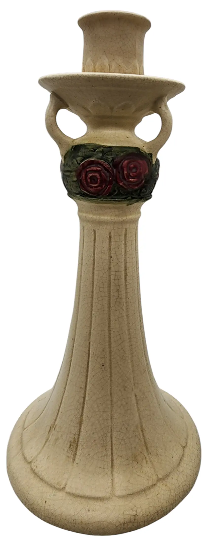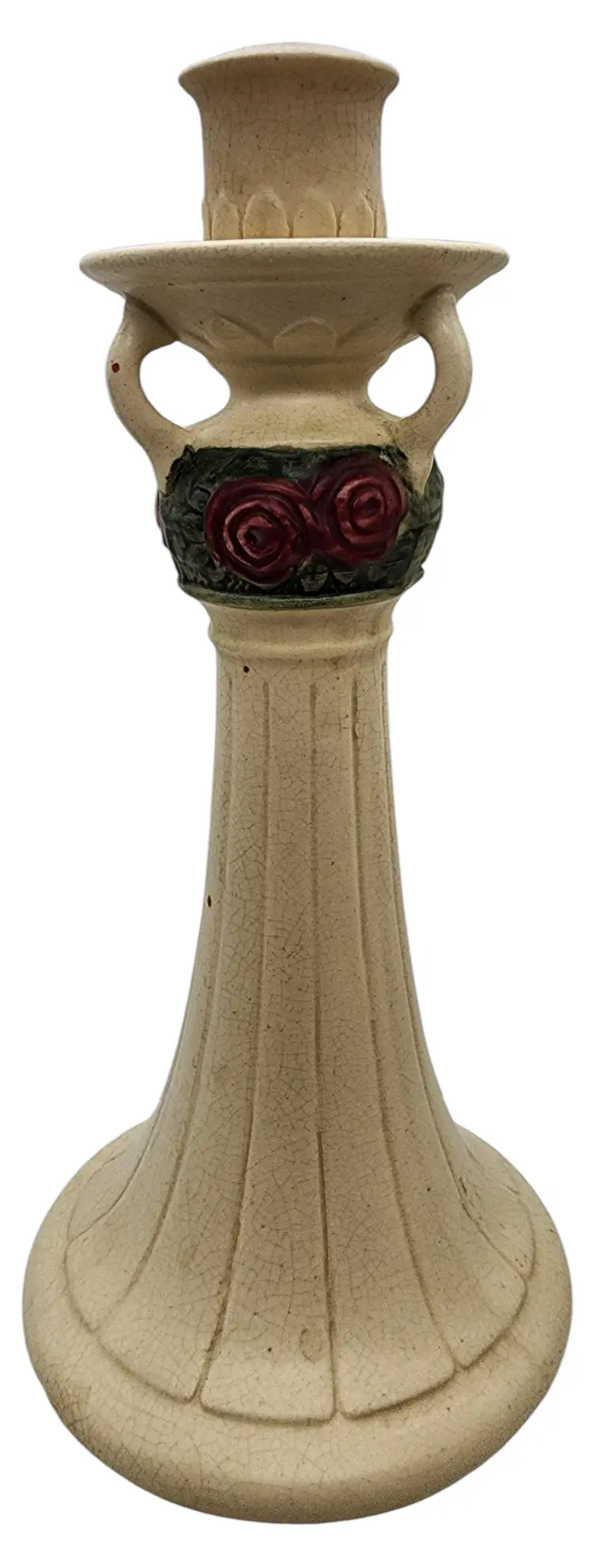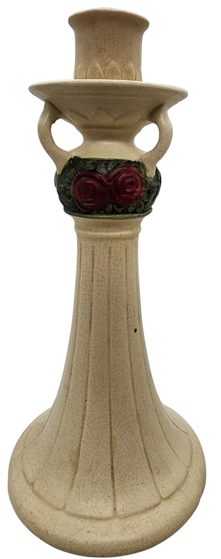Elevate your home decor with the Weller Roma Single Bobeche Candlestick, standing at an elegant 10 1/2" tall. Meticulously crafted from high-quality clay, this piece showcases the timeless artistry of Weller's art pottery production style. Its multicolored palette adds a touch of sophistication and versatility, seamlessly complementing a variety of interior color schemes. The candlestick features a sturdy base and a gracefully curved silhouette, designed to both support your candles and enhance your space with a warm, inviting glow. Whether placed on a mantle or as the centerpiece of your dining table, this piece is sure to catch the eye and add a refined aesthetic to any setting.