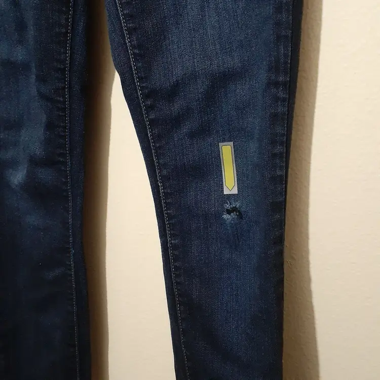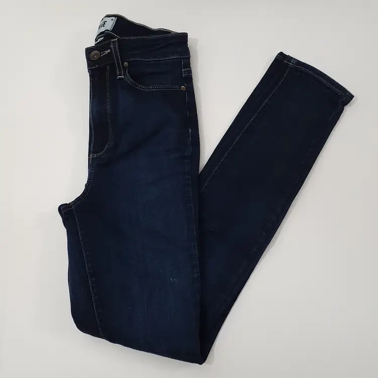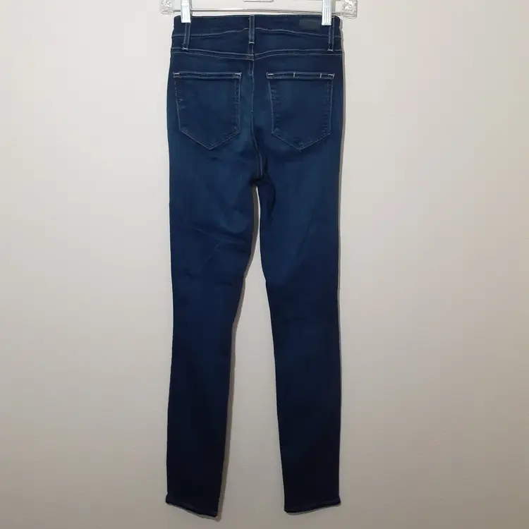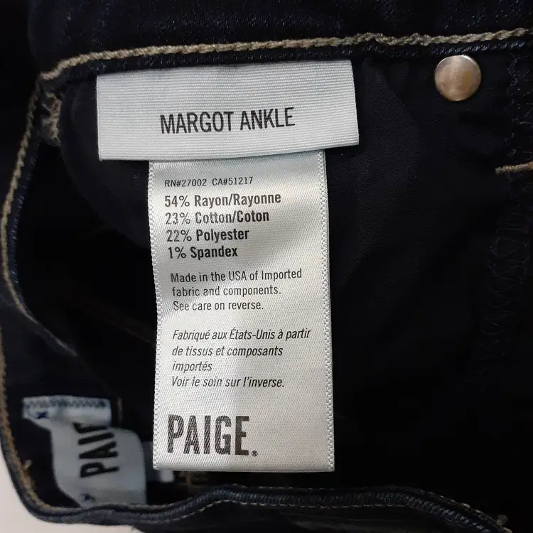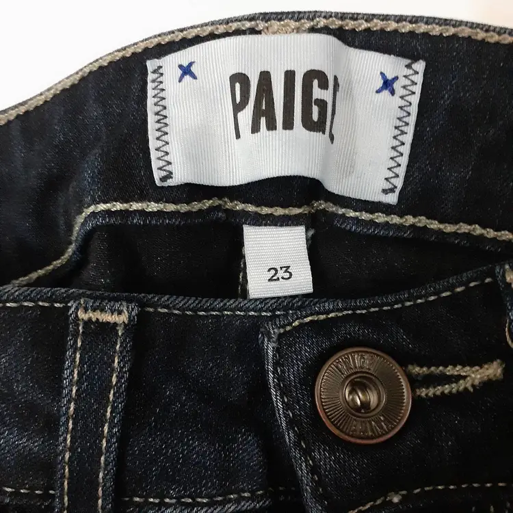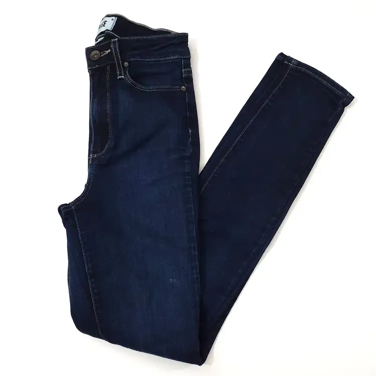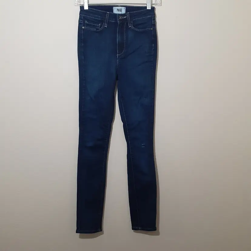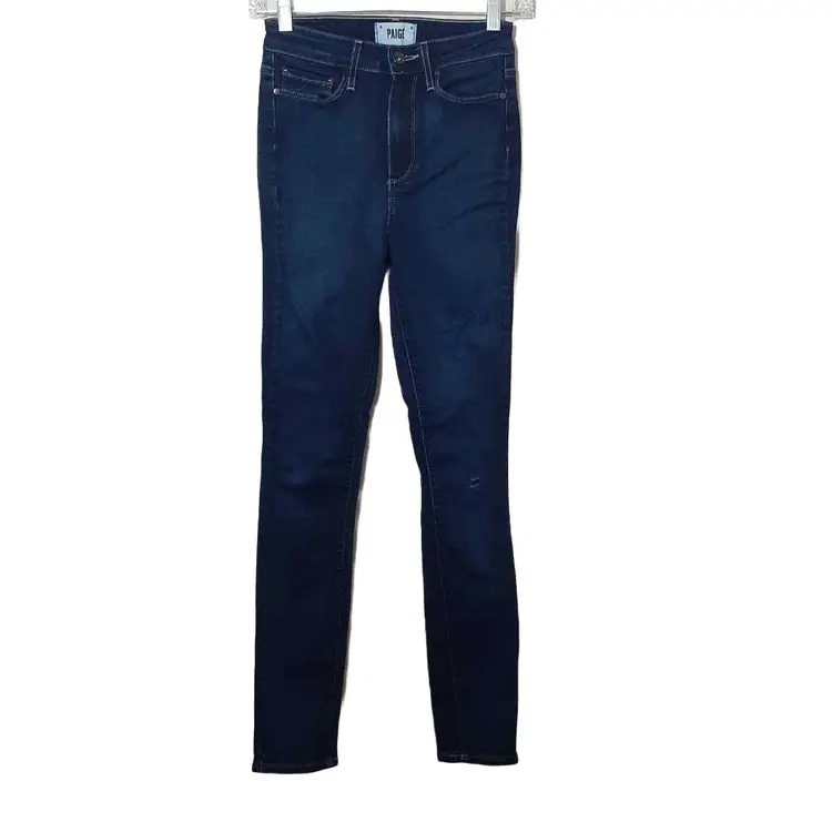 PAIGE Margot Ankle womens skinny jeans 23 dark blue stretch denim 10" rise, 28" inseam, slightly distressed hole in leg as seen in photo, made in USA good pre-loved condition