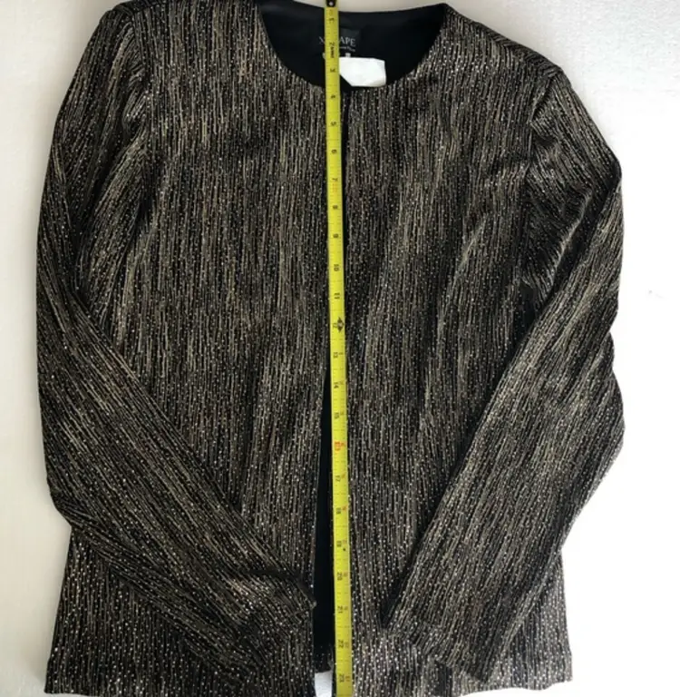 Elevate your evening attire with this elegant XSCAPE by Joanna Chen jacket. Featuring black knit fabric with subtle gold threads, this open-front jacket adds a sophisticated touch to any formal outfit. Perfect for parties, weddings, or upscale events.