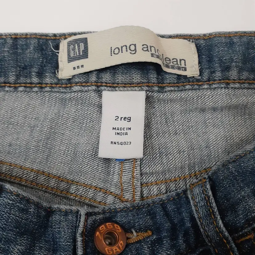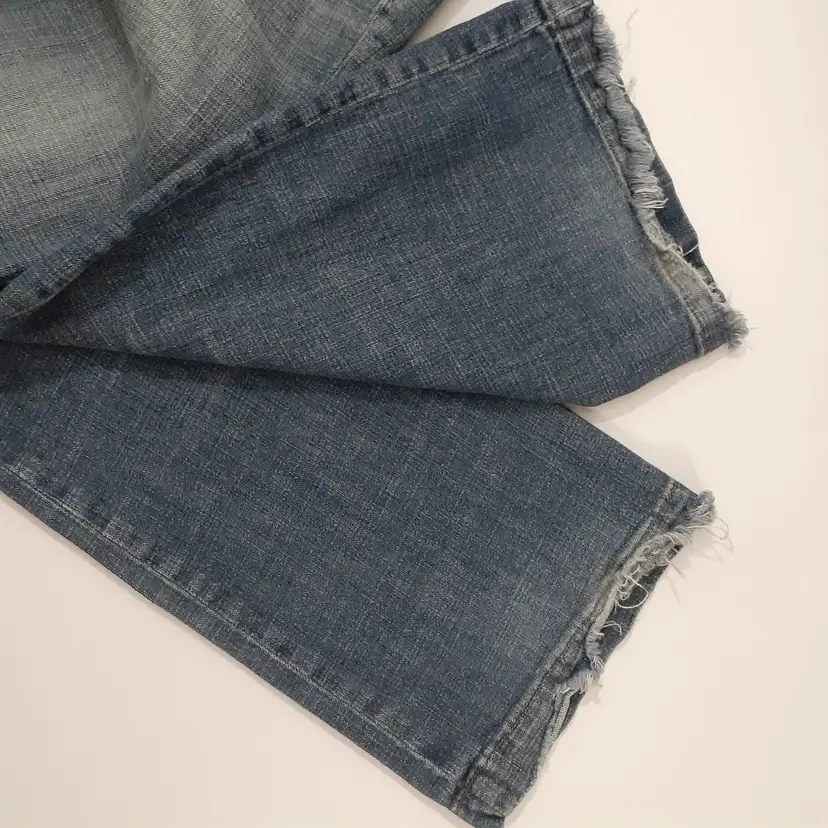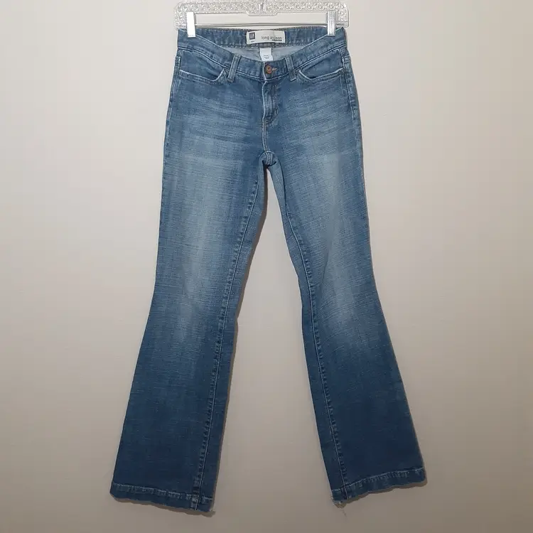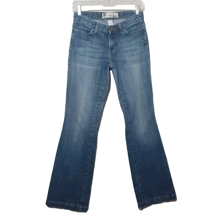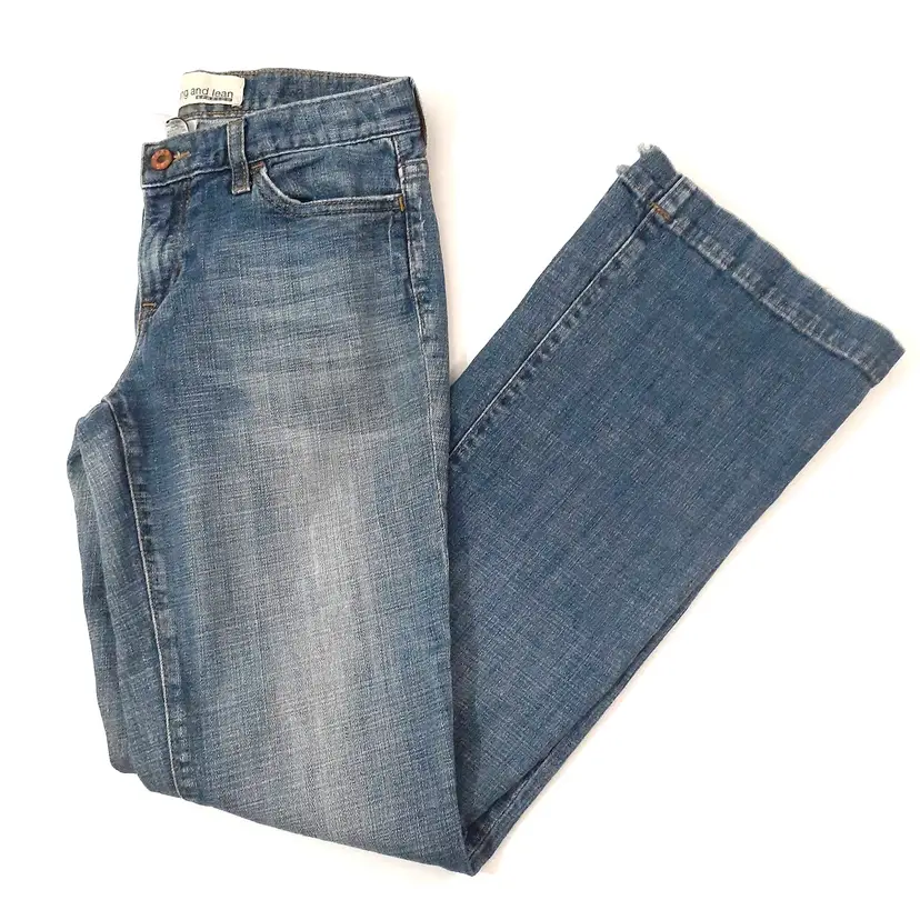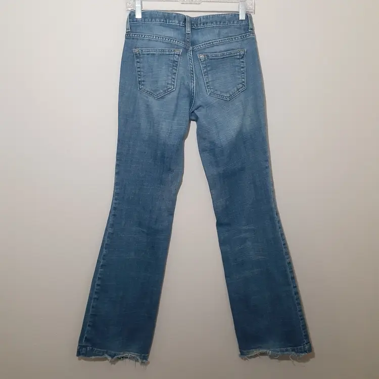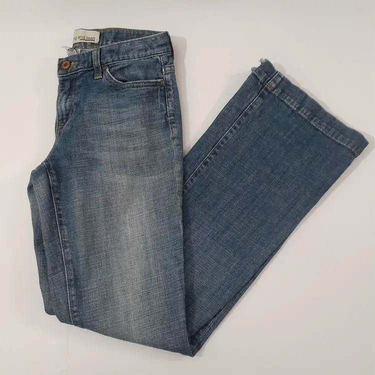 GAP Long and Lean womens boot cut jeans 2 Reg blue stretch denim 7.5" rise 32" inseam Y2K grunge frayed cuffs pre-loved grunge condition