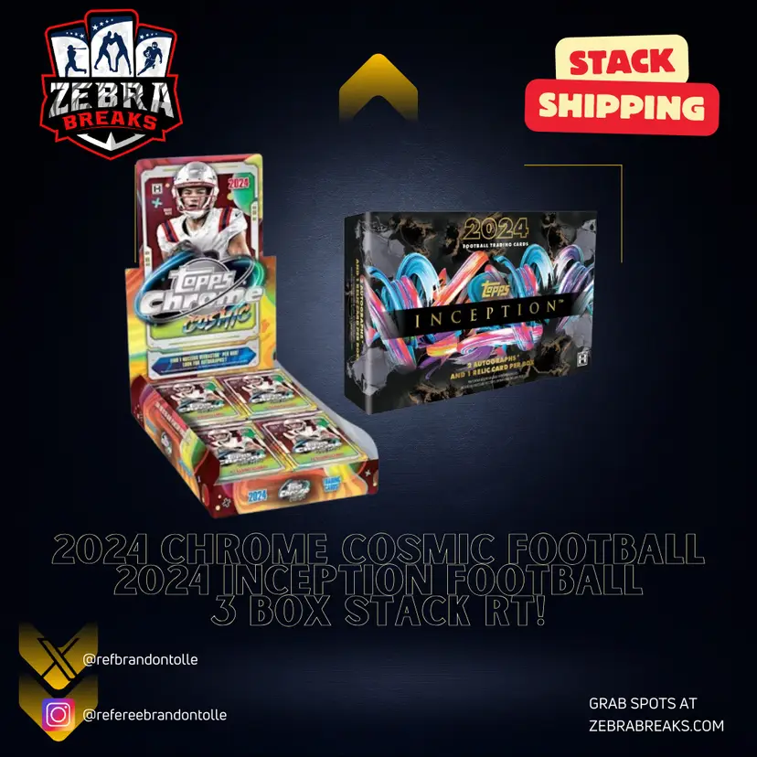 2x 2024 Topps Chrome Cosmic Football/1x 2024 Topps Inception Football STACK SHIPPING APPLIES All cards stack, you can request shipping by purchasing the "Stack Shipping Request" Item in the marketplace for Zebra Breaks specifically. Stack shipping is a $5 flat fee no matter how large your stack is. Shipping will occur the Friday/Saturday following your request if placed by Thursday night of the week you request shipping