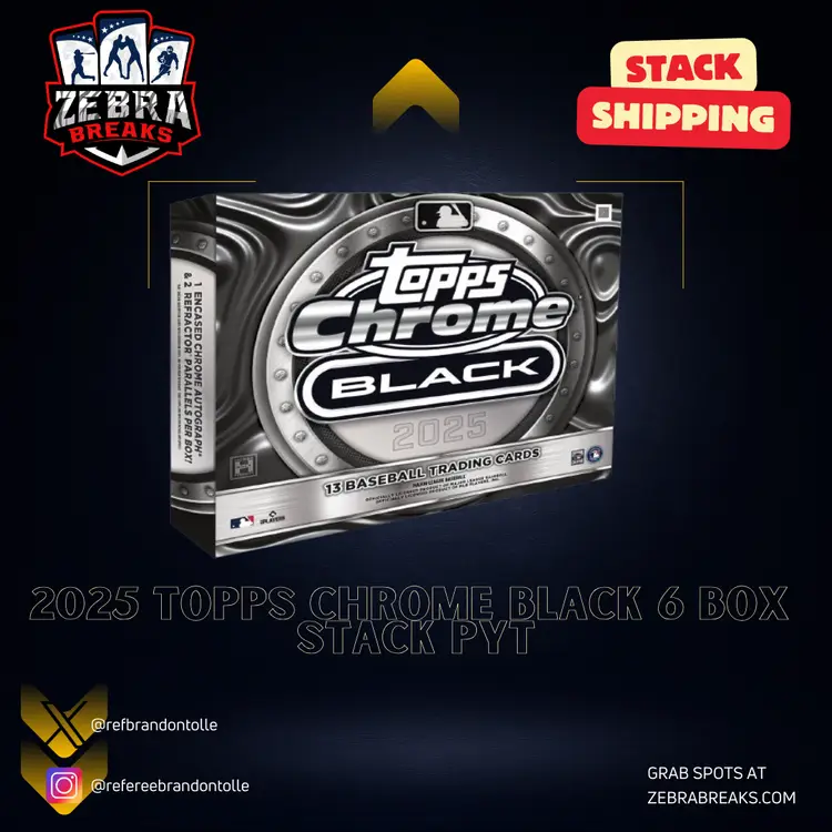 6 Boxes of 2025 Topps Chrome Black STACK SHIPPING APPLIES All cards stack, you can request shipping by purchasing the "Stack Shipping Request" Item in the marketplace for Zebra Breaks specifically. Stack shipping is a $5 flat fee no matter how large your stack is. Shipping will occur the Friday/Saturday following your request if placed by Thursday night of the week you request shipping