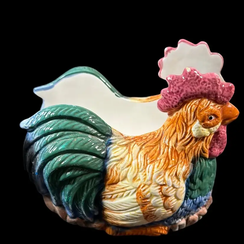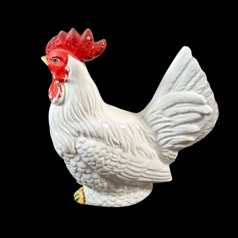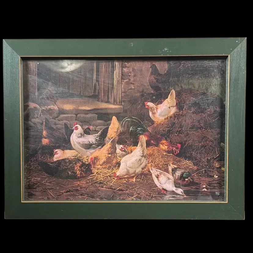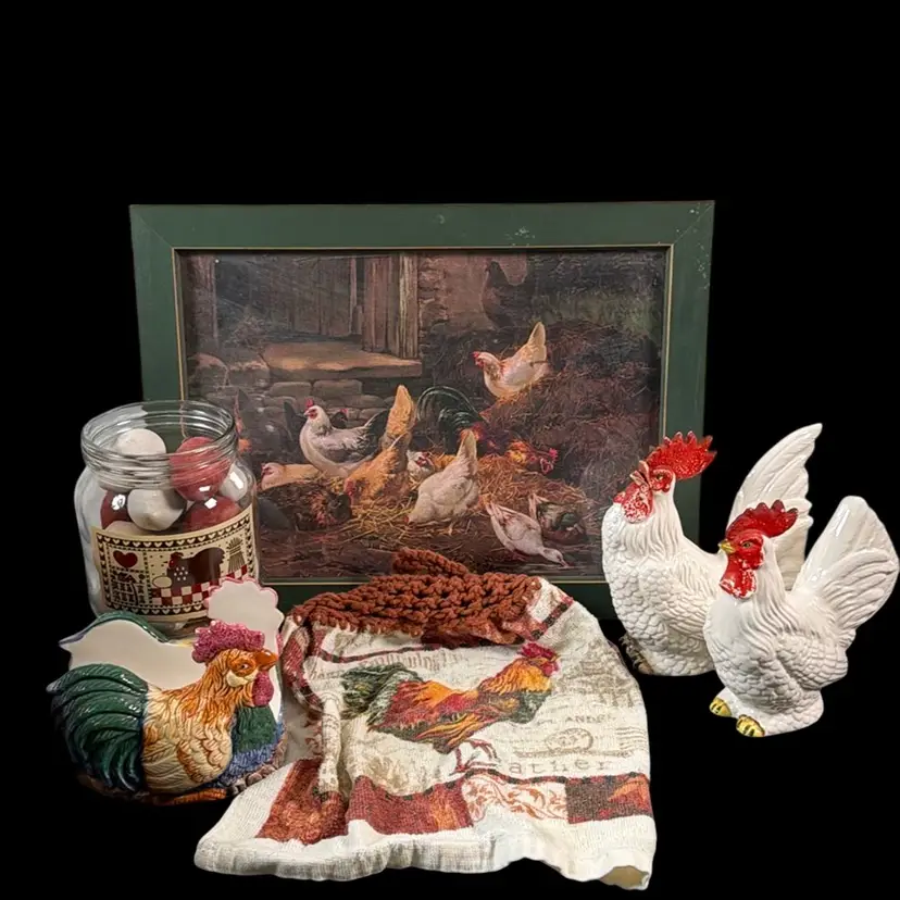 Includes -15.75” x 12” framed Chicken and Duck print -Anchor Hocking chicken canister (no lid)with wooden eggs 5.5” x 4”