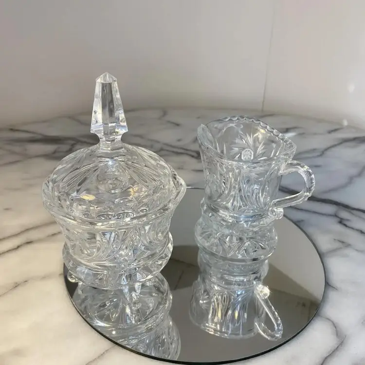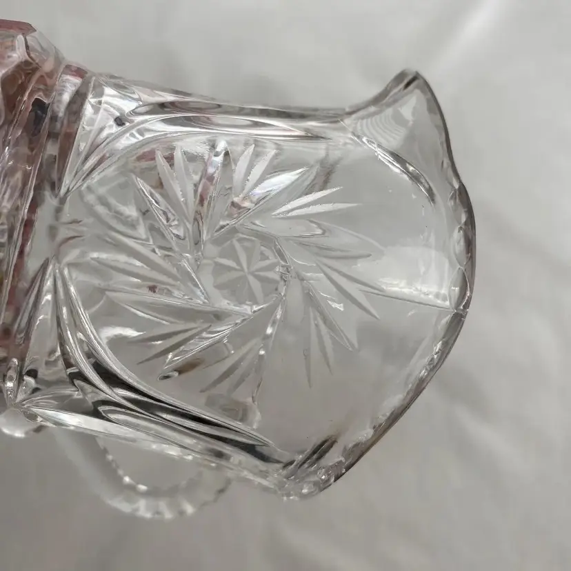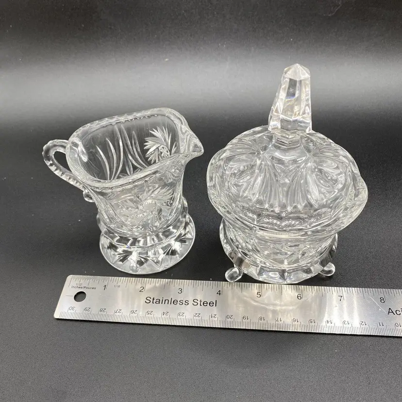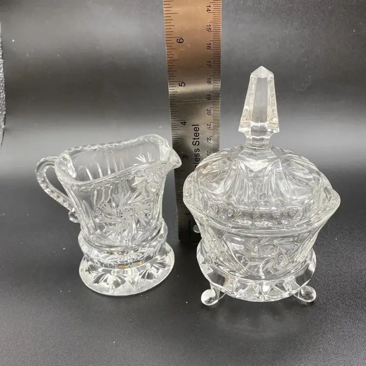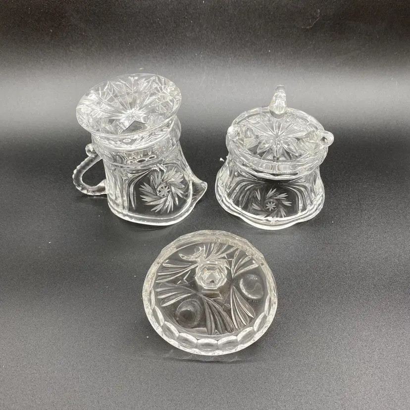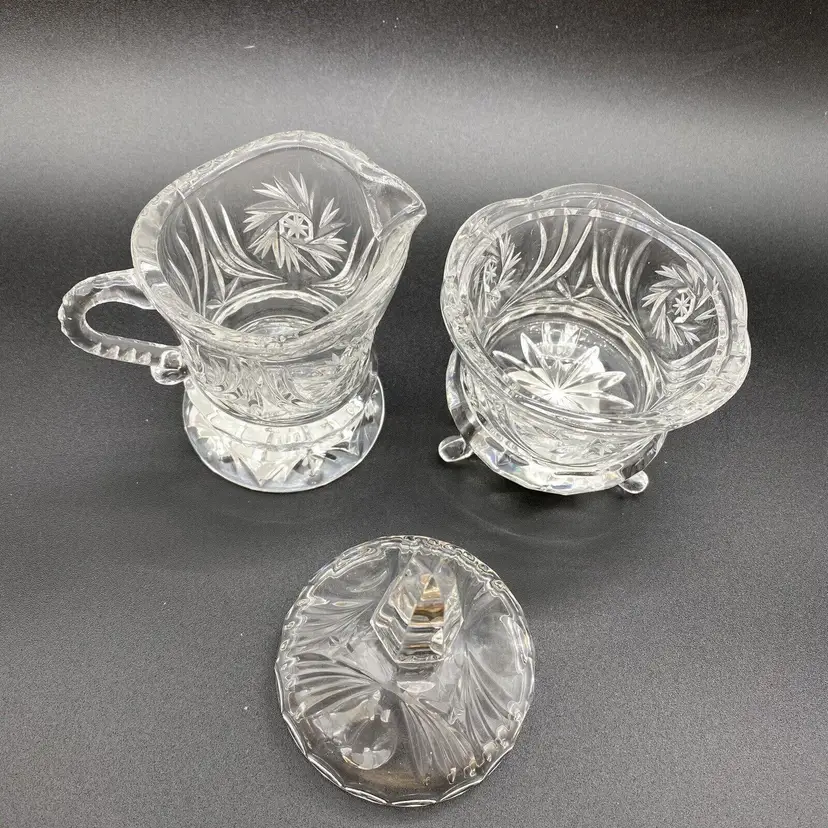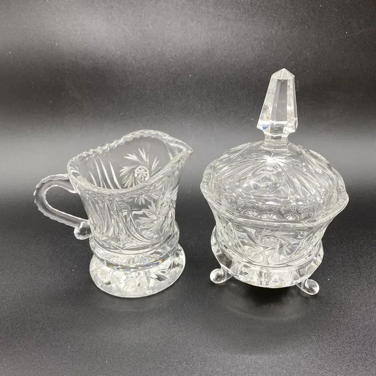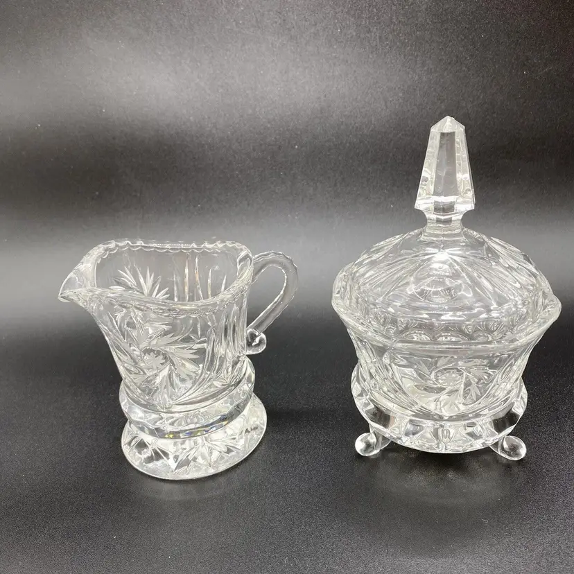 Pinwheel Cut Crystal Set Sugar bowl on legs with lid and spire finial. Creamer on round base with worked handle. Has seam.
