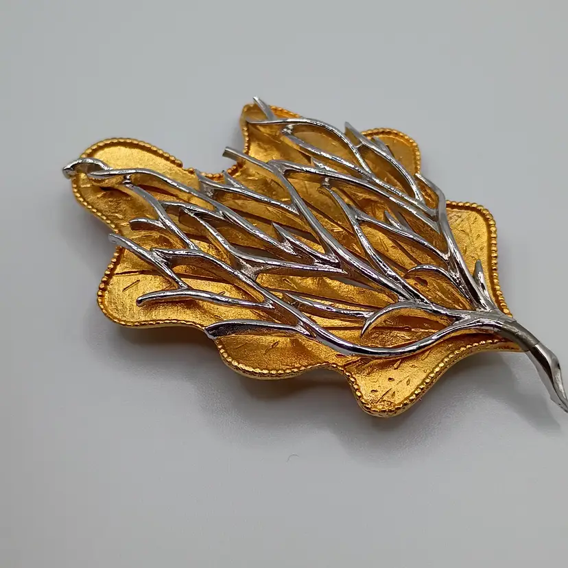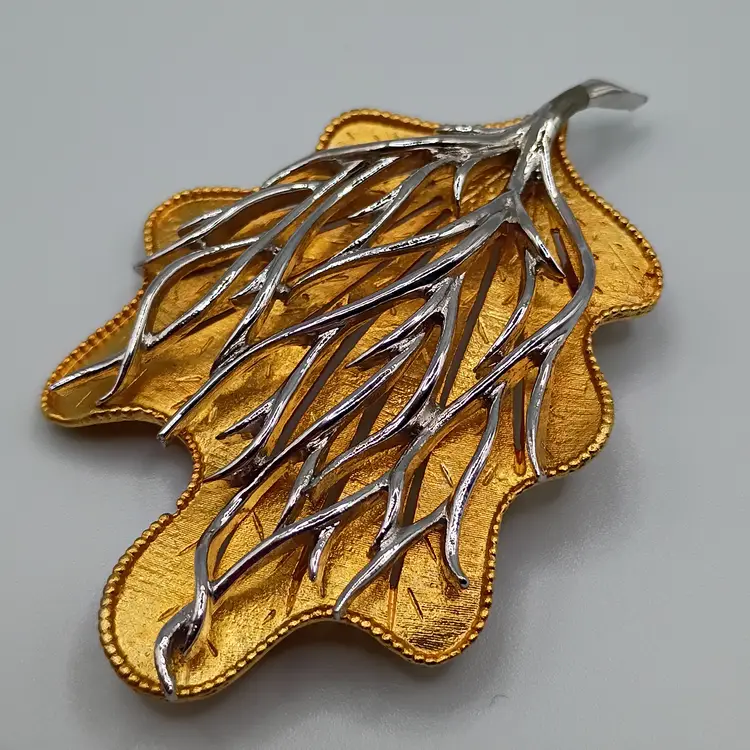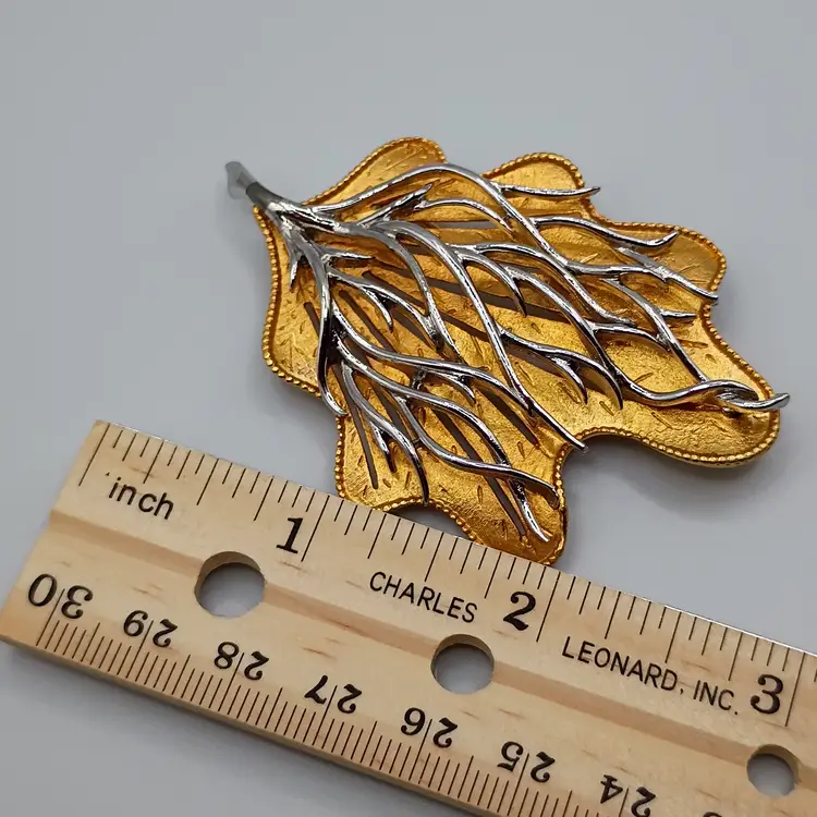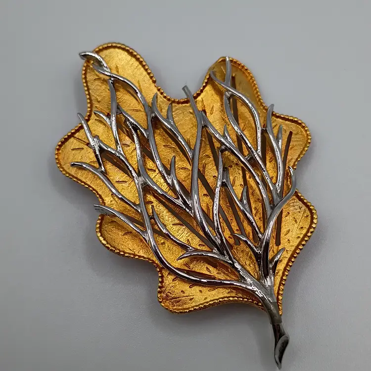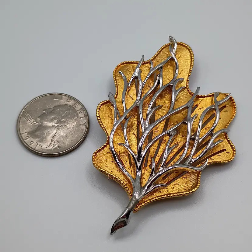 Description: Beautiful vintage Coro brooch in the shape of a large leaf. The design features a textured gold-tone leaf background accented with a striking silver-tone branch overlay, creating depth and contrast. The back is stamped Coro, confirming its maker. This is a lovely mid-century costume jewelry piece, perfect for collectors and anyone who loves nature-inspired designs.