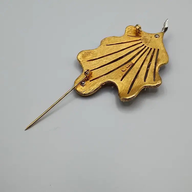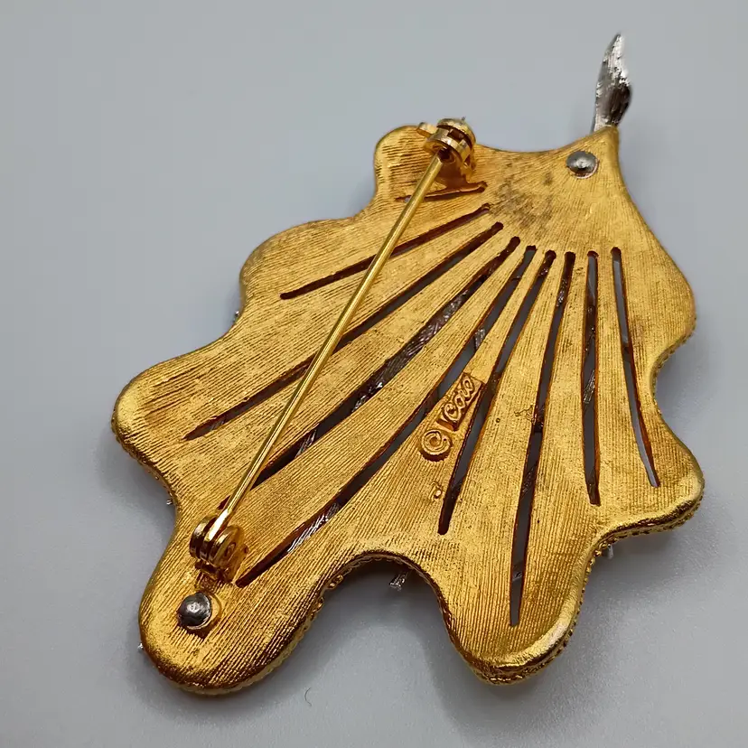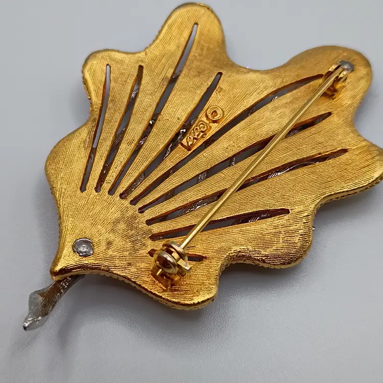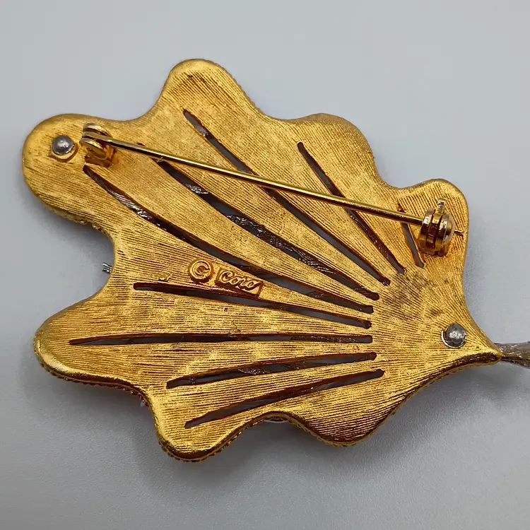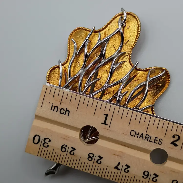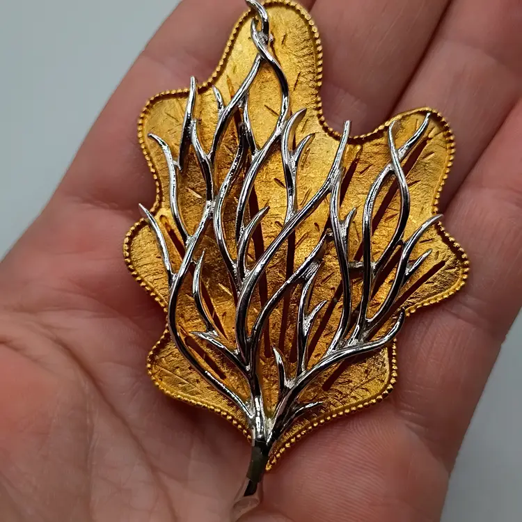 Description: Beautiful vintage Coro brooch in the shape of a large leaf. The design features a textured gold-tone leaf background accented with a striking silver-tone branch overlay, creating depth and contrast. The back is stamped Coro, confirming its maker. This is a lovely mid-century costume jewelry piece, perfect for collectors and anyone who loves nature-inspired designs.
