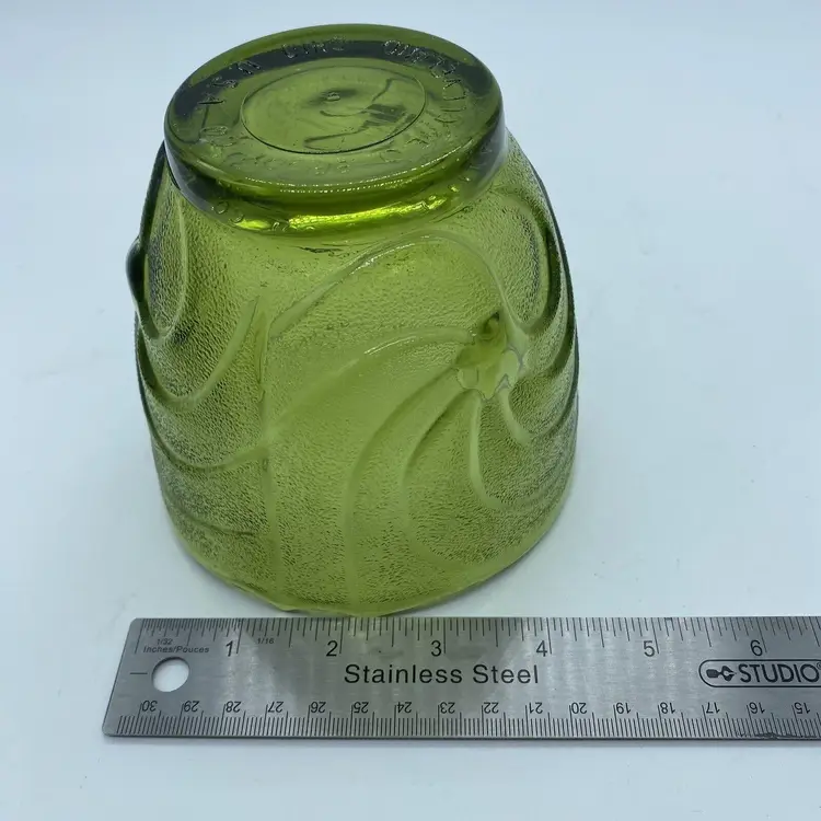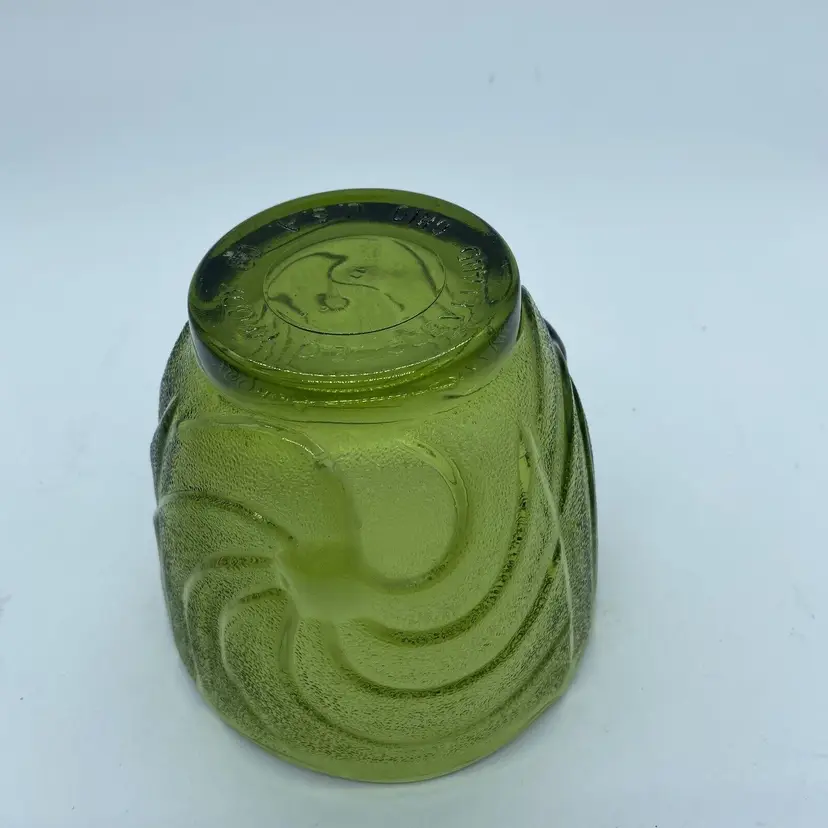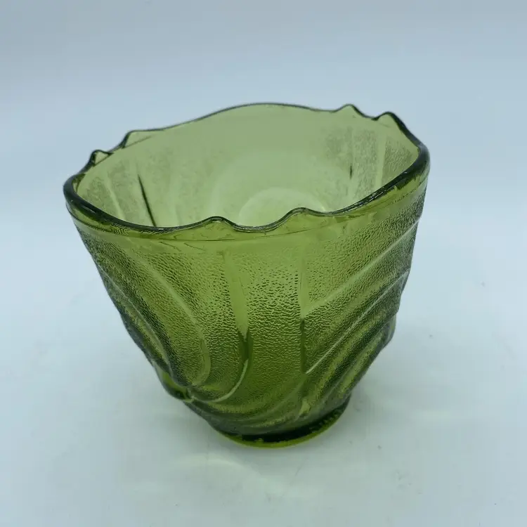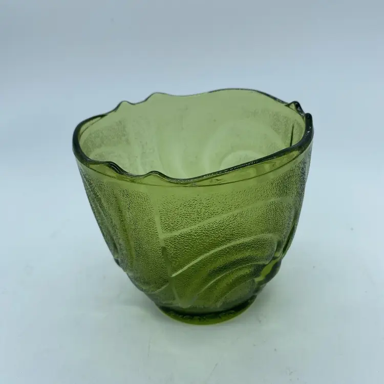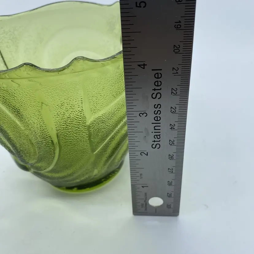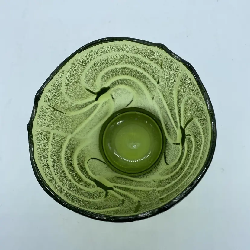 Green Pressed Glass with texture and a scallopped uneven rim. Lovely swirl within.
