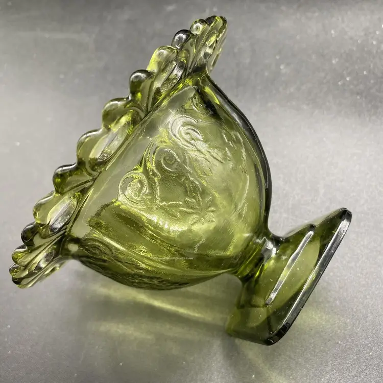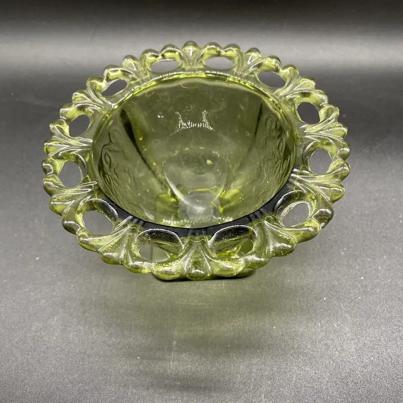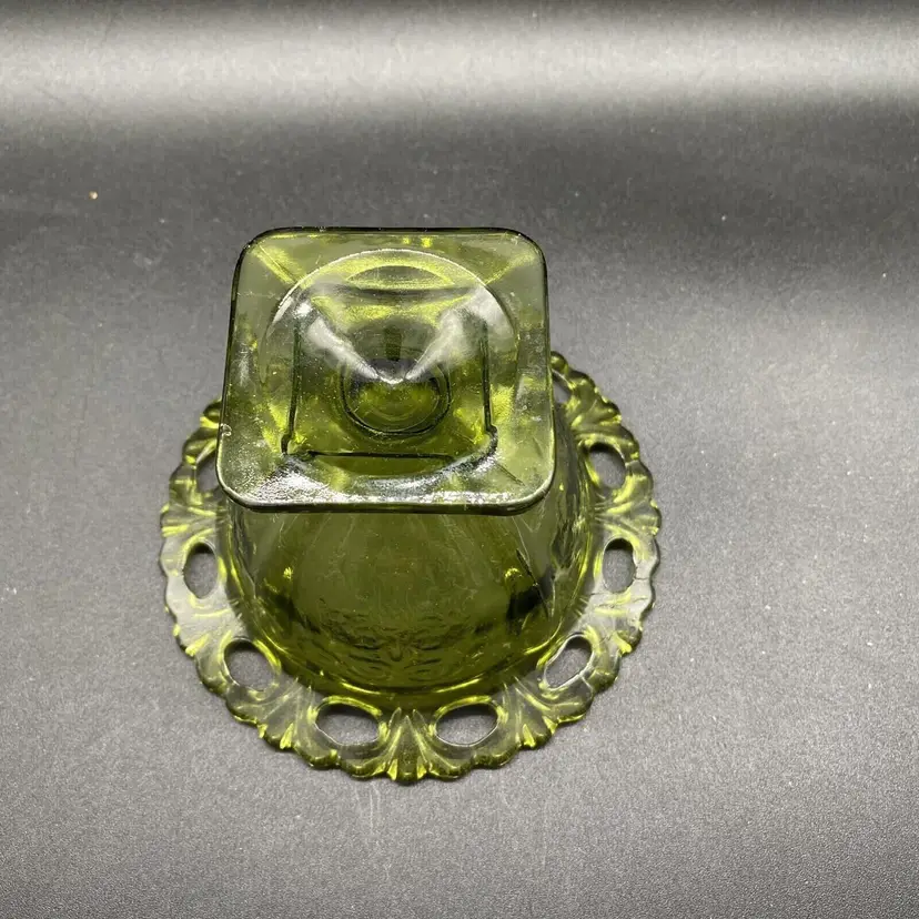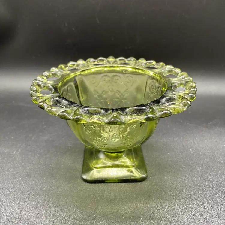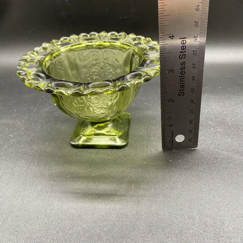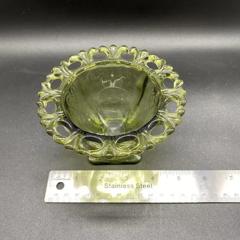 No tariff as USA made This vintage Indiana Glass candy dish is a charming addition to any collection. The green dish features an intricate open lace heart-shaped pattern along the edges, adding a touch of elegance to your decor. It can also double as a votive holder for a cozy and romantic ambiance. Made in the United States with pressed glass production style, this piece is durable and of high quality. It is a part of the Laced Edge product line and comes with one compartment. Perfect as a gift or for personal use, this candy dish is a timeless treasure.